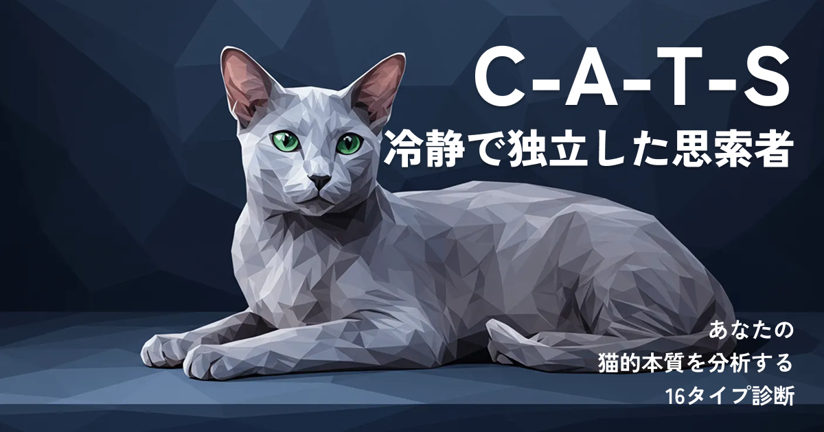 MBTIのような性格診断です! 4つの指標をもとに、16タイプの猫に分類します🐱 Cautiousness(警戒心) Autonomy(協調性) Temperament(わかりやすさ) Stability(活発さ) もしぜんぶ猫っぽい「CATS」の人なら「ロシアンブルー」! もしぜんぶ猫っぽっくない「DOGE」の人なら「ジャパニーズボブテイル」!