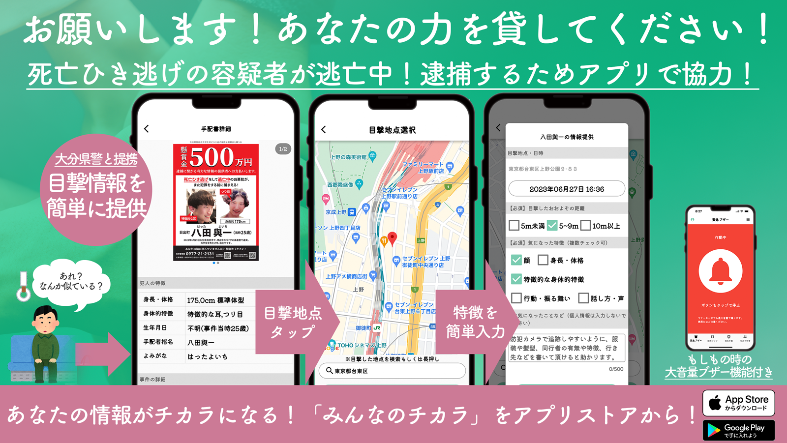 「みんなのチカラ」は、ひとりひとりのチカラ=情報を集めて、安心安全な社会の実現を目指すアプリです。危険マップ、指名手配情報、行方不明者情報といった機能を通じて、社会や街の安全に貢献するためのプラットフォームを提供します。 【このアプリが何を目指しているのか】 私たちは、このアプリを通じて、すべての人が手軽に社会の安全に貢献できるようにしたいと考えています。みんなの力が集まれば、大きな力となり、一人ひとりが安心して生活できる社会を創り出せると信じています。そのためには、危険な人物や場所など情報の一元管理や簡便な通報機能の提供が必要で、「みんなのチカラ」はそのような場所を作ることを考えています。 【アプリを作った経緯】 大分別府で発生したひき逃げ殺人事件をきっかけに、犯人逮捕のための情報共有の難しさ、そしてそれが解決できるツールがないことを痛感しました。指名手配犯の情報が一元管理されておらず、情報提供する方法もバラバラであることが課題だと感じ、それらの課題解決を目指して開発を始めました。 【アプリの主な機能】 * 指名手配情報:指名手配犯の情報を一元管理し、その情報を簡単に把握できるようにすることで、市民一人ひとりが警察と協力して犯人逮捕に貢献できます。 * 行方不明者情報:行方不明者の情報を集め、共有することができる機能です。家族や友人が行方不明になった際に、その人物の特徴や最後に目撃された場所を登録することで、多くの人々が情報共有に参加し、早期の発見に繋がる可能性を高めます。 * 危険マップ:地域内の危険地点を登録・共有できる機能です。不審者情報や危険運転、危険な場所などを地図上で確認することができます。 - 緊急ブザー機能:非常時に瞬時に反応することができる緊急ブザー機能を提供しています。一つのボタンを押すだけで大音量で警報が鳴るため、周囲に危険を知らせることができます。 これらの機能を通じて、「みんなのチカラ」はあなたが日常生活の中で直接社会の安全に貢献できる環境を提供します。一人ひとりが小さな力を結集すれば、大きな力となり、より安全な社会を創り上げることができます。あなたも「みんなのチカラ」に参加してみませんか?
