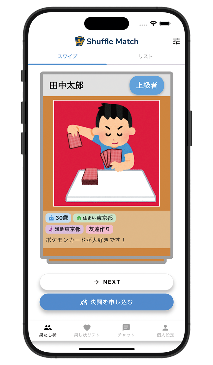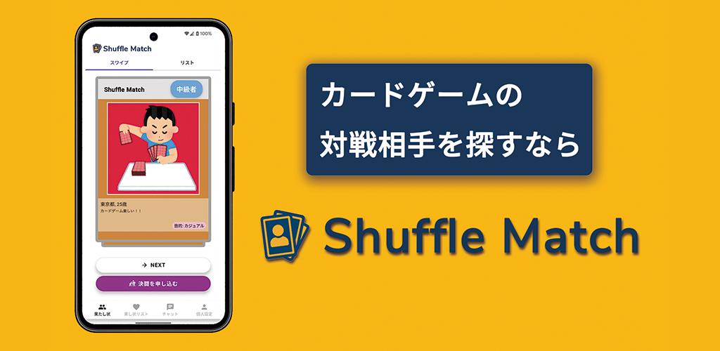 Shuffle Match(シャッフルマッチ)は、カードゲームを楽しむプレイヤー同士がつながるためのマッチングアプリです。 遊戯王・ポケカ・デュエマなど、好きなTCGを登録するだけで、近くの対戦相手を簡単に探せます。 スキルレベルや遊び方の好みに合った相手と出会い、チャットで対戦予定や店舗の調整もスムーズに。 基本機能は無料で利用可能。一部のプレミアム機能では、検索優先表示や広告非表示などもご利用できます。 「遊ぶ相手がいない…」を解決し、カードゲームの楽しさをもっと広げる、新しいつながりの場を提供します。