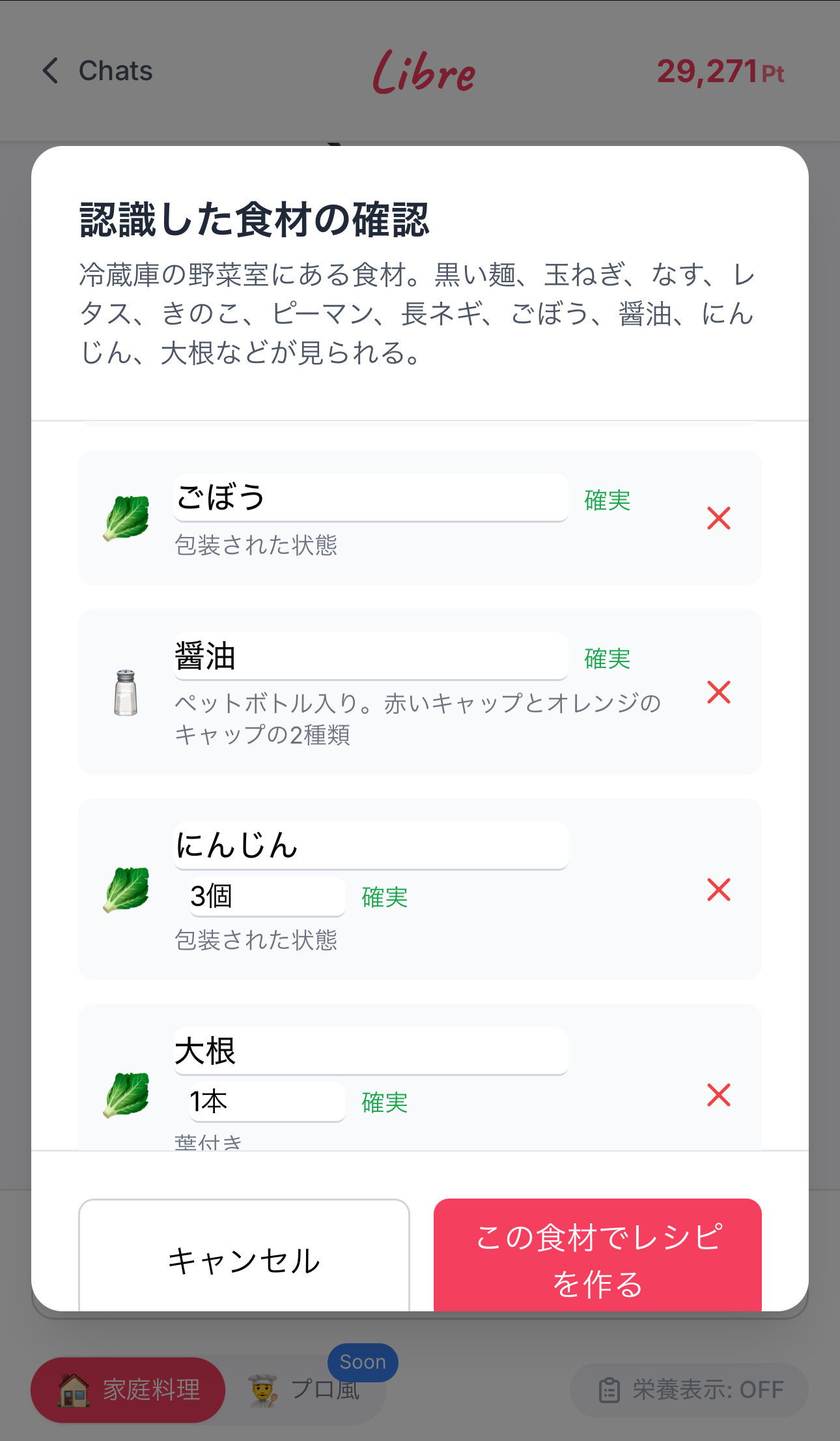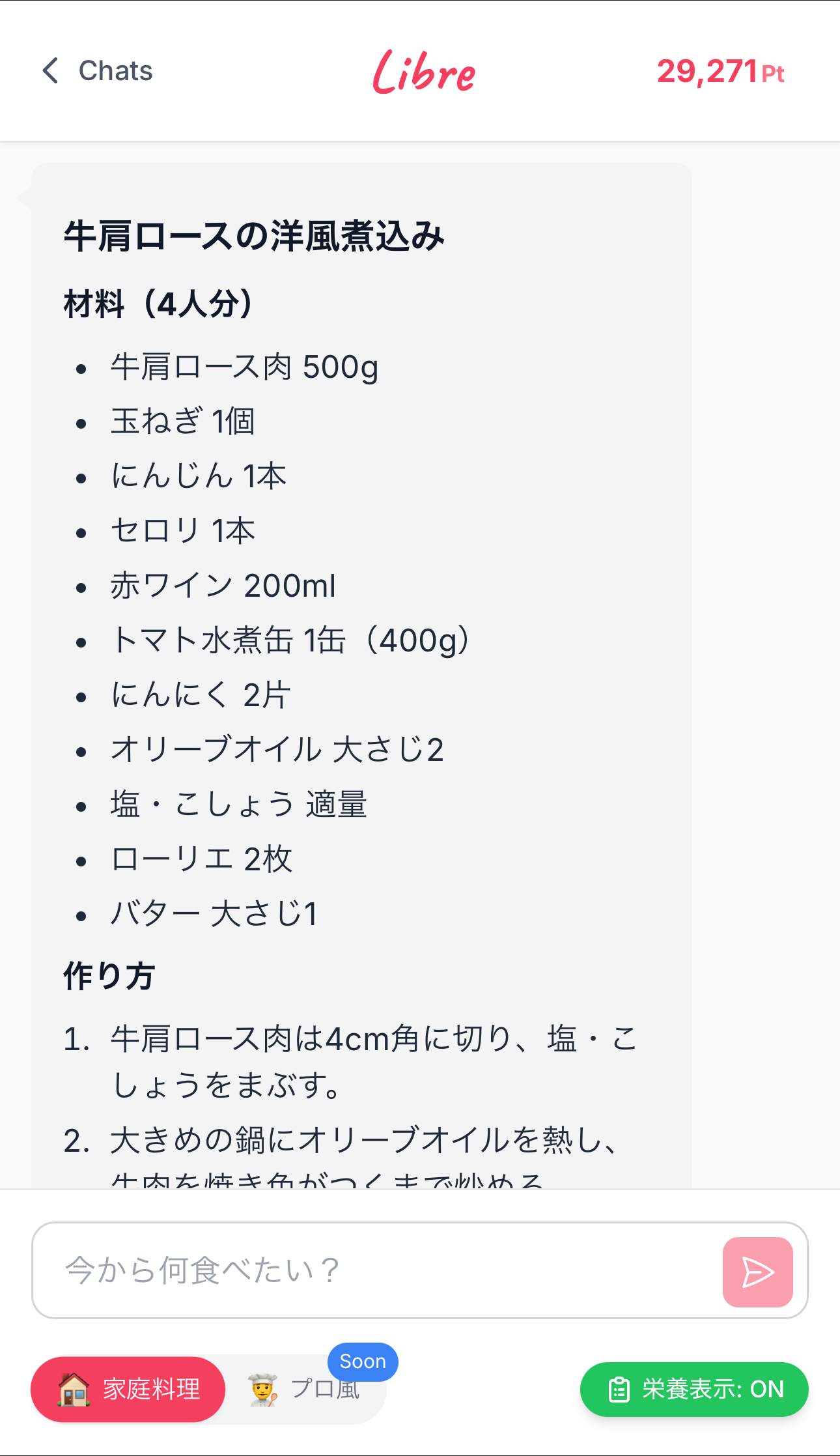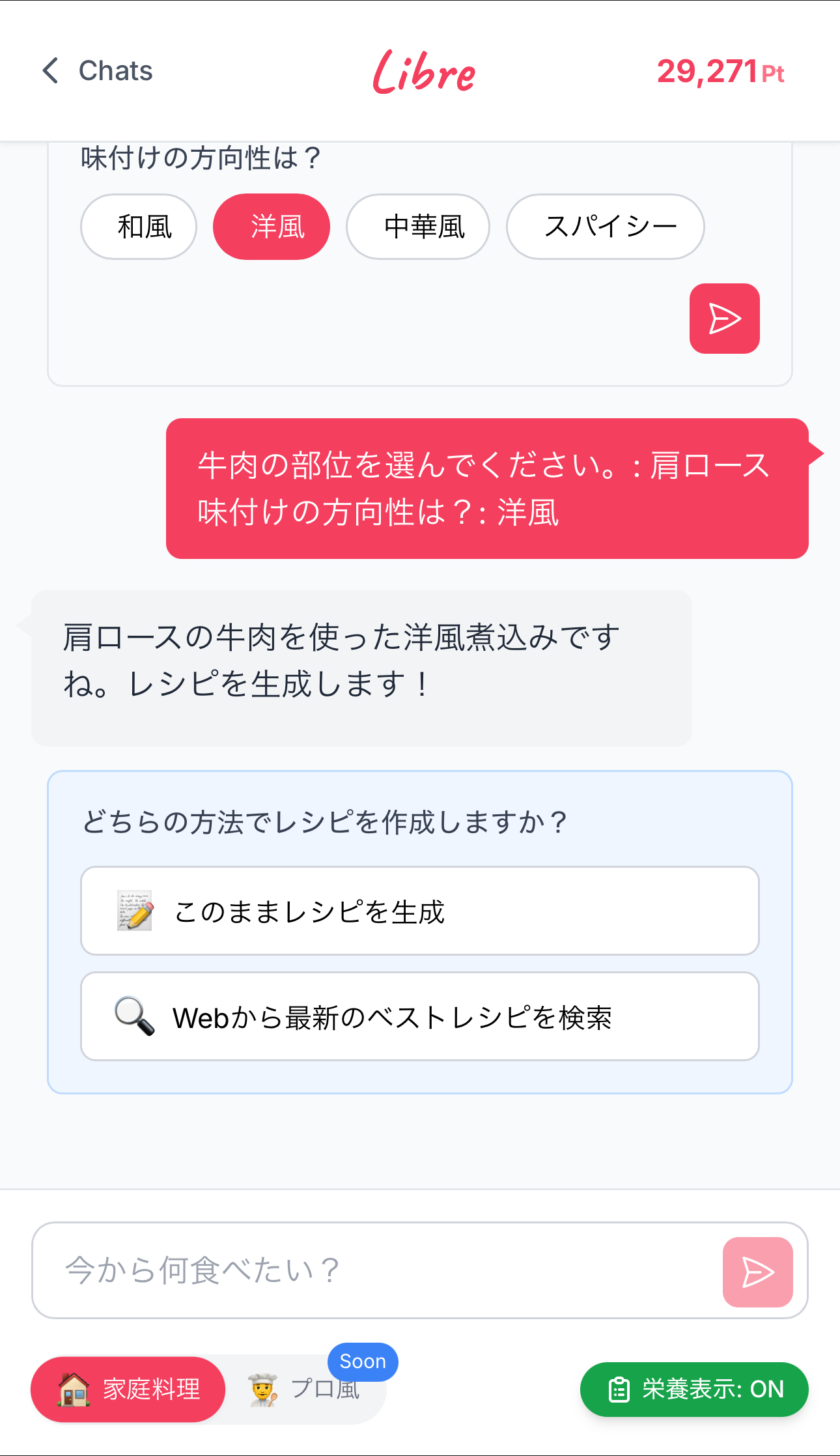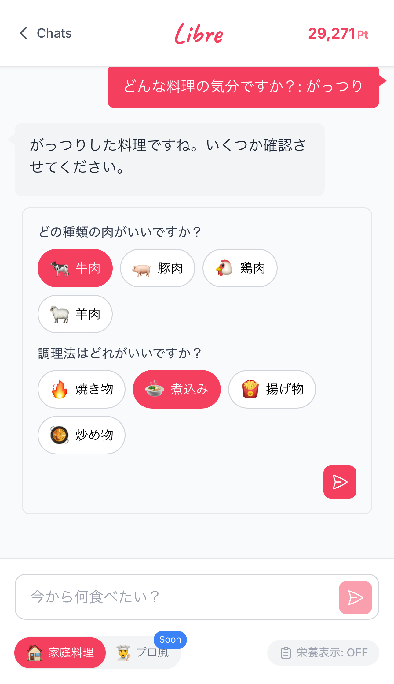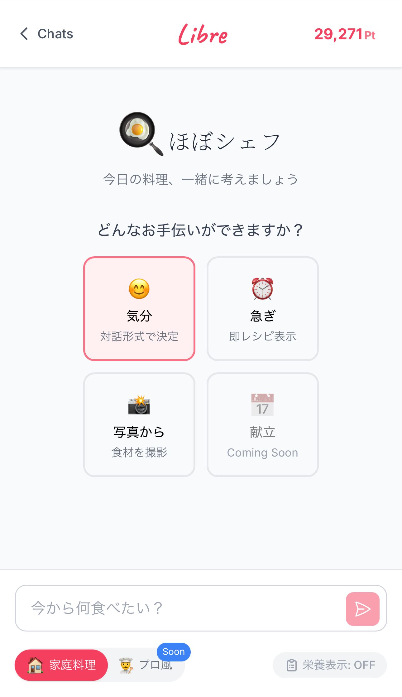 忙しいけど自炊してる方のためのレシピ生成エージェントです。 ChatGPTなどで煩わしく感じる •文章打つ手間 •質問力やプロンプトの精度 に関係なく簡単にタップで簡単に理想のレシピに辿り着けます ▶︎主な機能 ①写真分析機能 冷蔵庫の写真やカートの写真から作れる料理を提案 ②クイックレシピ お題を伝えるだけで即レシピが届きます ③気分モード 今の気分の質問にタップで答えるだけで食べたい料理とレシピを知ることができます ④Webエージェントモード あなたの気持ちに最も近い料理とレシピを人気サイトから最適化して生成します ⑤栄養価モード 生成したレシピのおおよそのカロリーと栄養を表示 ▶︎料金プラン(β版) 単月プラン : 1,500円/月 3ヶ月プラン : 1,000円/月 6ヶ月プラン : 800円/月 ※自動更新です 随時機能アップデートを行う予定です。 お楽しみにしていただけますと幸いです!