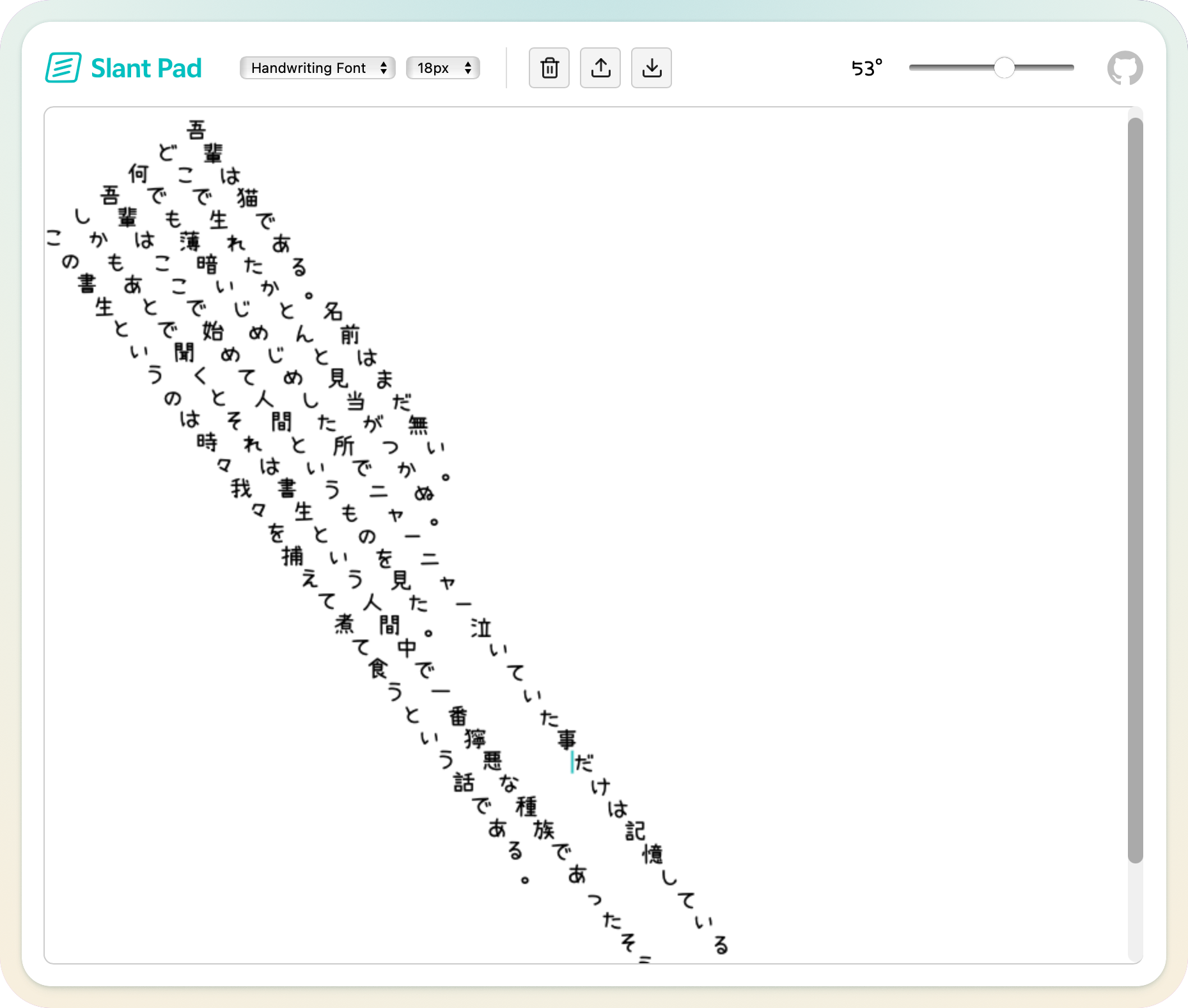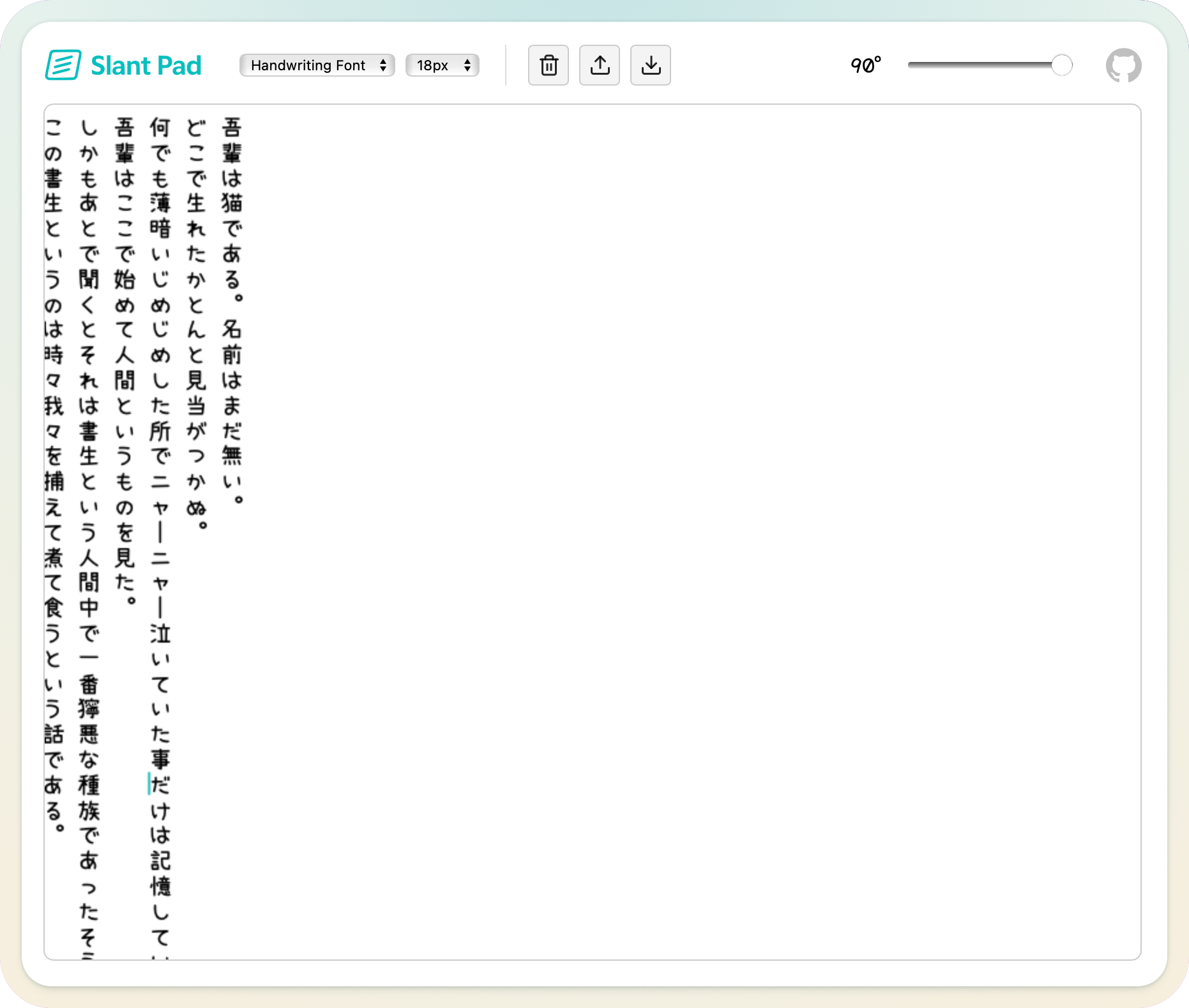 SlantPadは、縦書きから横書きまで任意の角度で編集することができるテキストエディターです。今までにない書き味をお楽しみください。