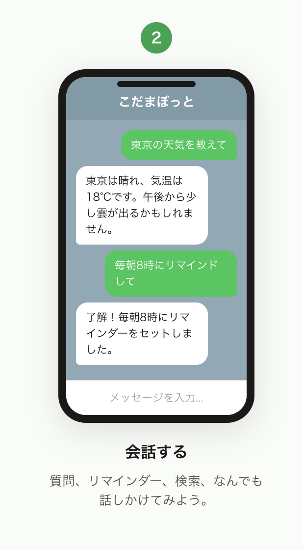 こだまぼっとは、LINEで使えるパーソナルAIチャットボットです。 会話、リマインダー、ウェブ検索、ファイル管理など、日常のあらゆるタスクをサポートします。今話題のOpenClawを友達追加するだけで使えるアプリだと思ってください。