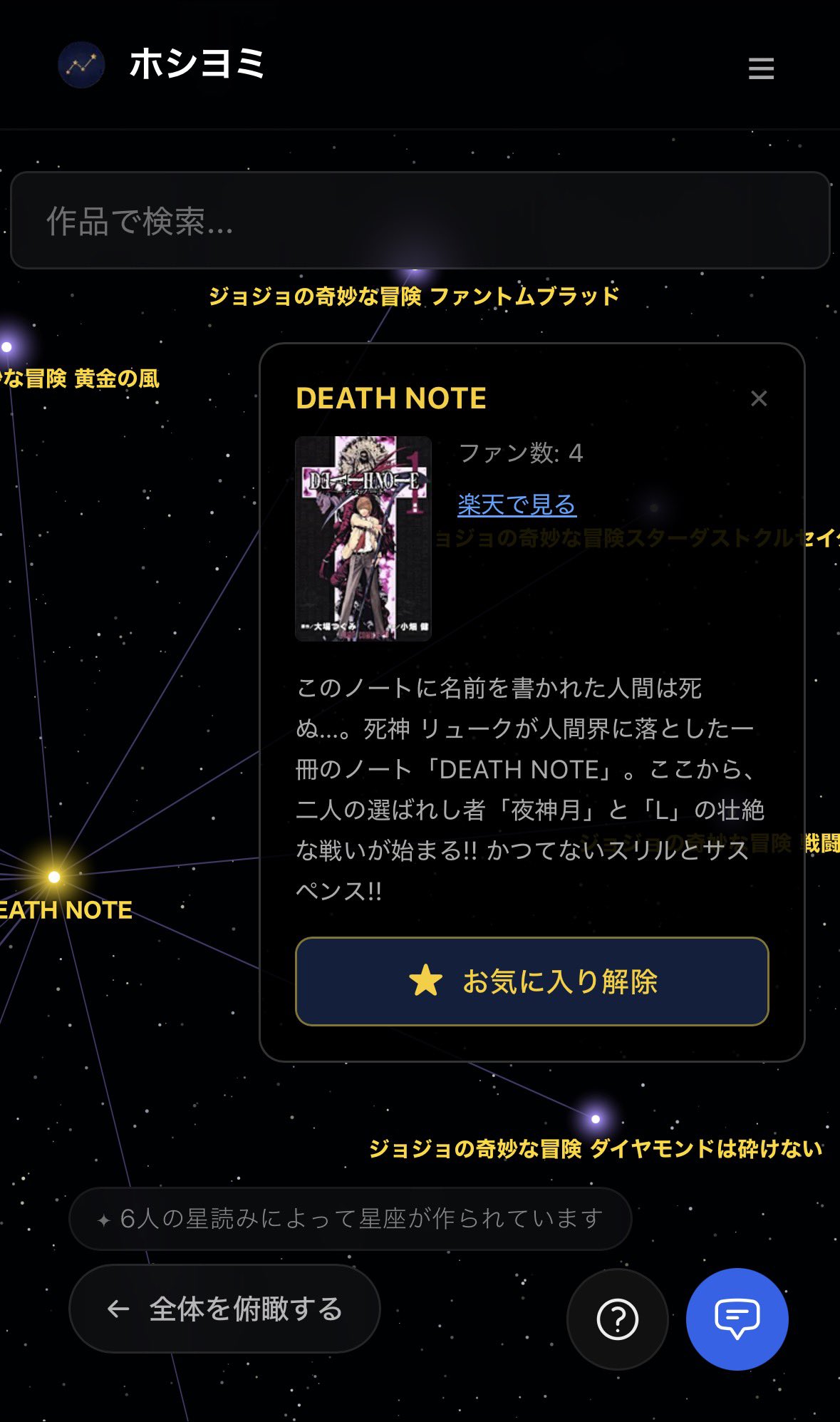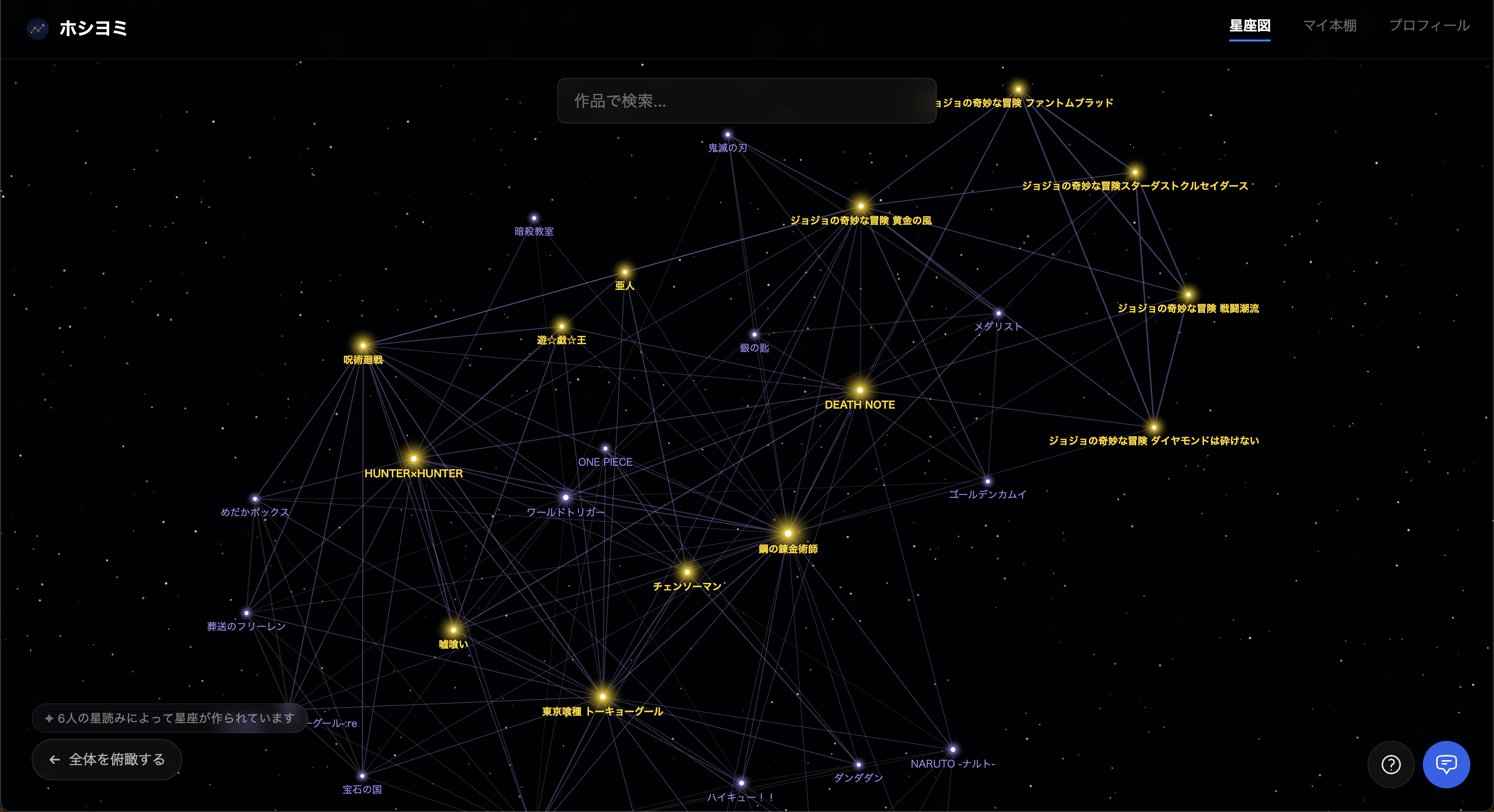 ジャンルやランキングでは測れない、お気に入りの漫画に出会うためのプロダクトです。この漫画が好きな人はどんな作品を読んでるんだろう?自分の好みに近い漫画は何だろう?他のユーザーのお気に入り情報から、星座を読み解くように次の漫画に出会いましょう。