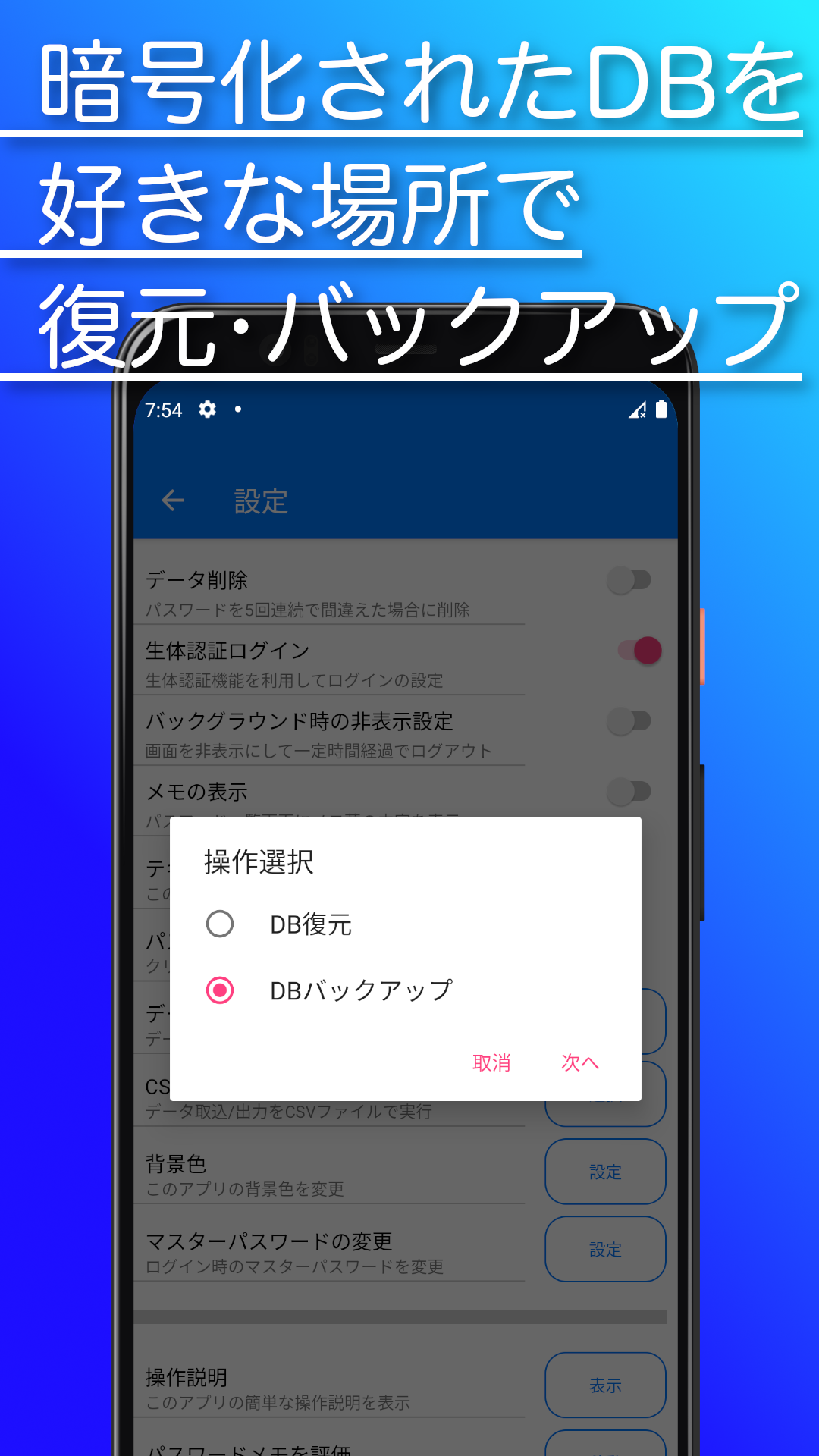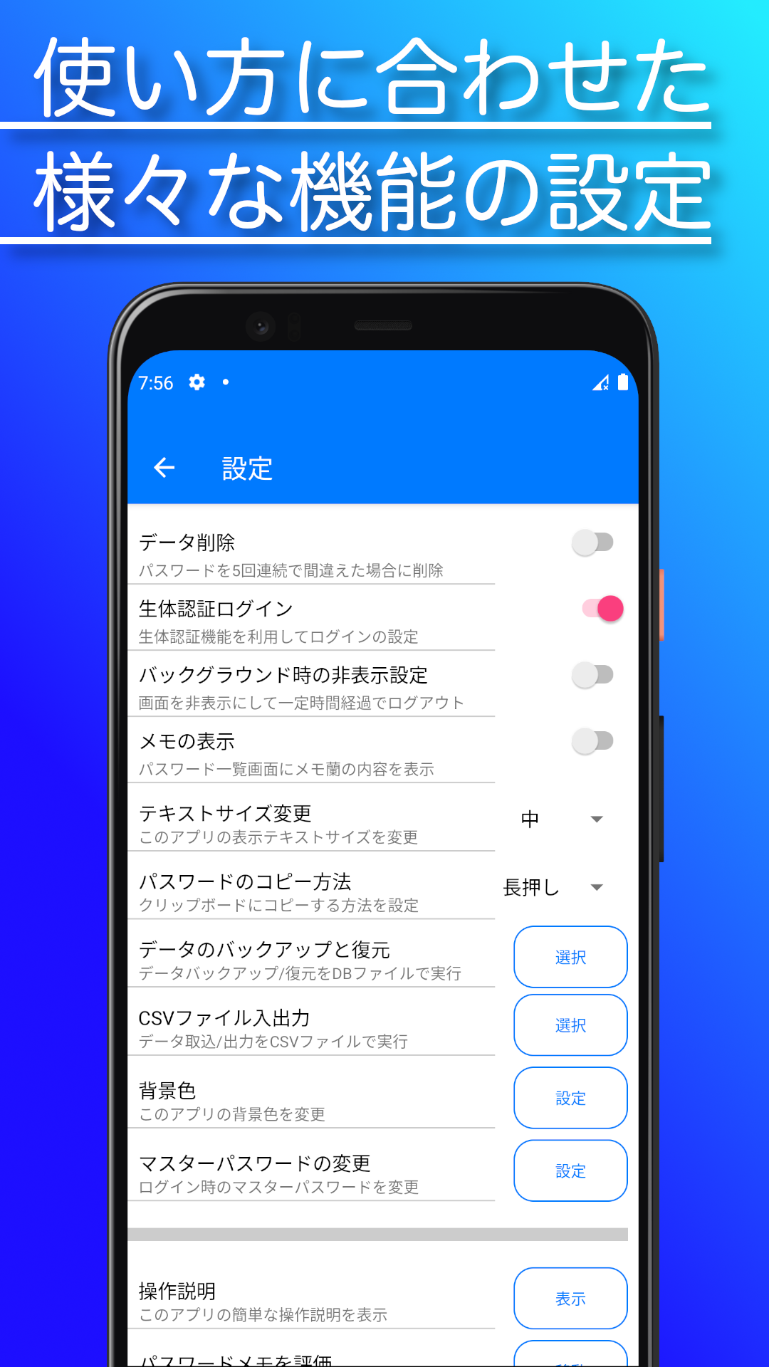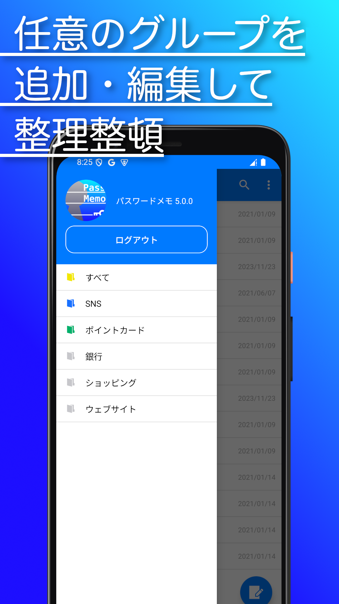 手帳に書き留めるように簡単で自由にパスワードのメモができるアプリです。 1つのマスターパスコードを設定するだけで全てのパスワードやアカウント情報を暗号化して安全に管理ができる。 そんなパスワード管理ができるアプリが「パスワードメモ」です。 アカウントIDやパスワードが多すぎて覚えきれない・・・ だけど、メモ帳に書いておくのもセキュリティ的になんだか不安・・・ そんな経験がある人におすすめのアプリです。 https://github.com/highcom/PasswordMemoPublic githubにてMITライセンスでオープンソース化もしています。 2018年のローンチから、アップデートを重ねてリファクタリングをしています。 実装として参考にできる部分があるように作ってきました。 <機能紹介> ●マスターパスワードの設定によるアカウントデータへのアクセス制限 ●生体認証によるログイン機能 ●登録したアカウント情報の検索機能 ●パスワードの自動生成機能 ●長押しによるパスワードのコピー機能 ●グループ分け機能 ●アイコンの色変更機能 ●暗号化されたデータベースでアカウント情報を保存 ●編集モード時に行を長押しで並べ替え機能 ●入力したサイトURLからブラウザに遷移する機能 ●タイトル順、更新日順でのソート機能 ●パスワードデータのバックアップ機能 ●パスワードデータのCSV出力機能 ●パスワードデータの復元機能 ●パスワードデータのCSV取込機能(各種文字コード対応) ●背景色が変更できる機能 ●パスワード一覧画面にメモを表示する機能 ●表示画面のテキストサイズを変更する機能