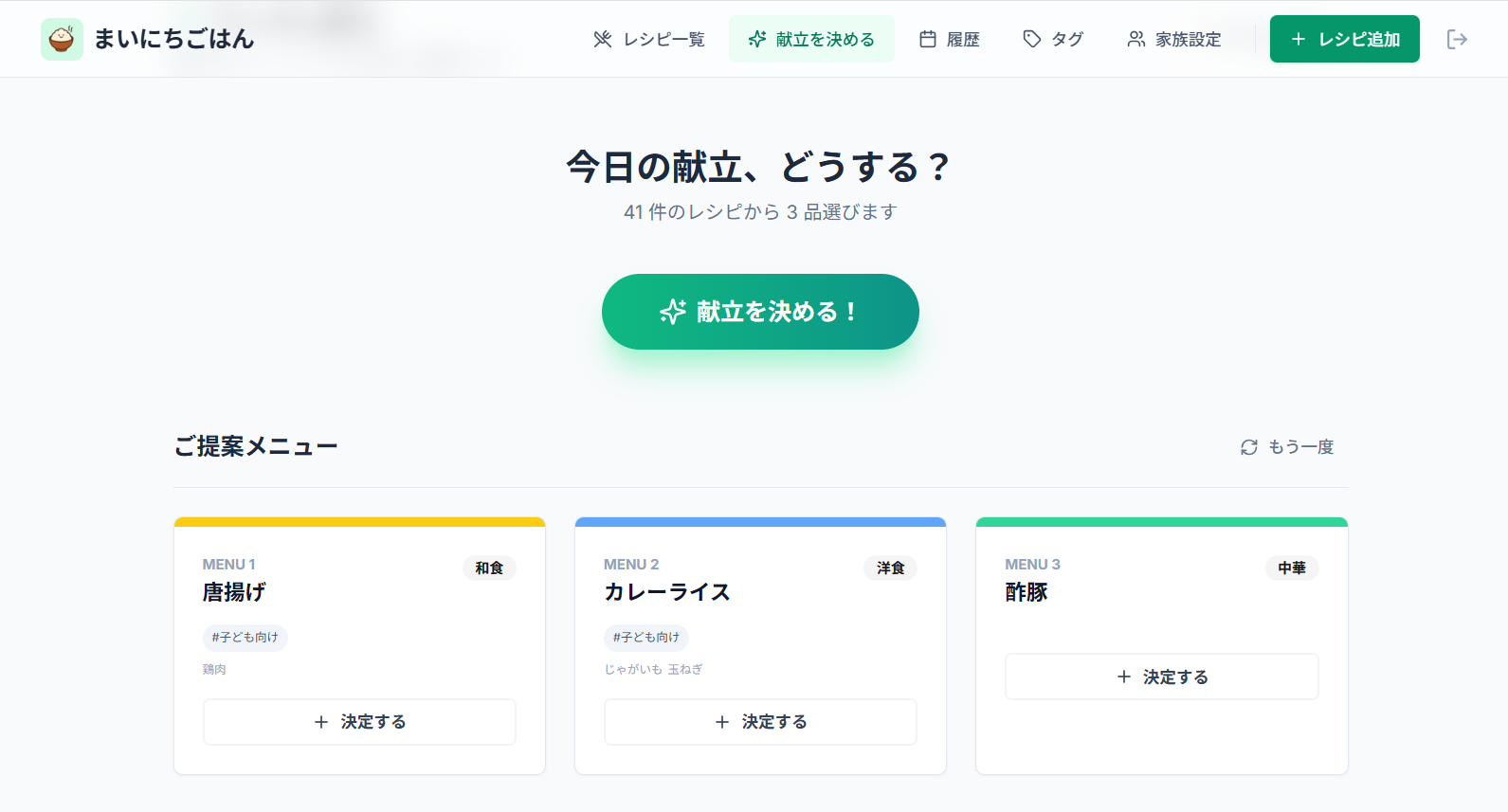 「まいにちごはん」は、自分が作れる料理を登録してデータ化し、無理のない範囲で献立を決められる Web アプリです。レシピの保存・検索・タグ管理や、条件付きランダム提案、献立履歴の登録、家族グループでの共有機能など、毎日の献立づくりを助ける機能をまとめて使えます。