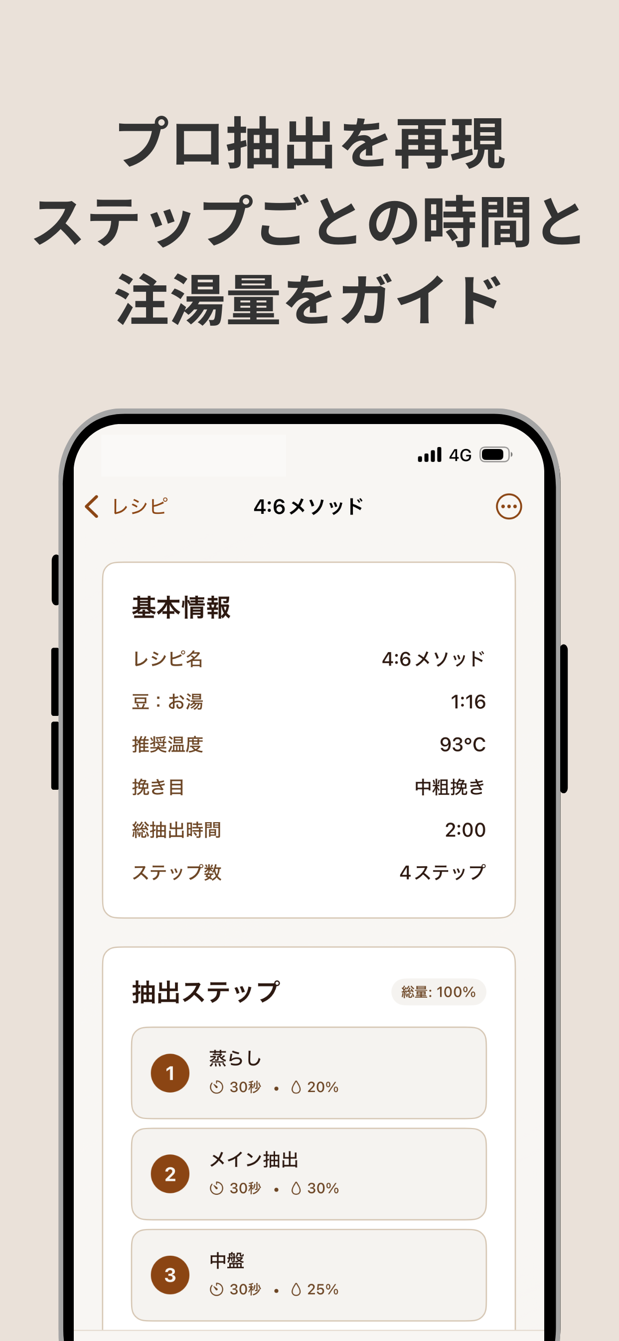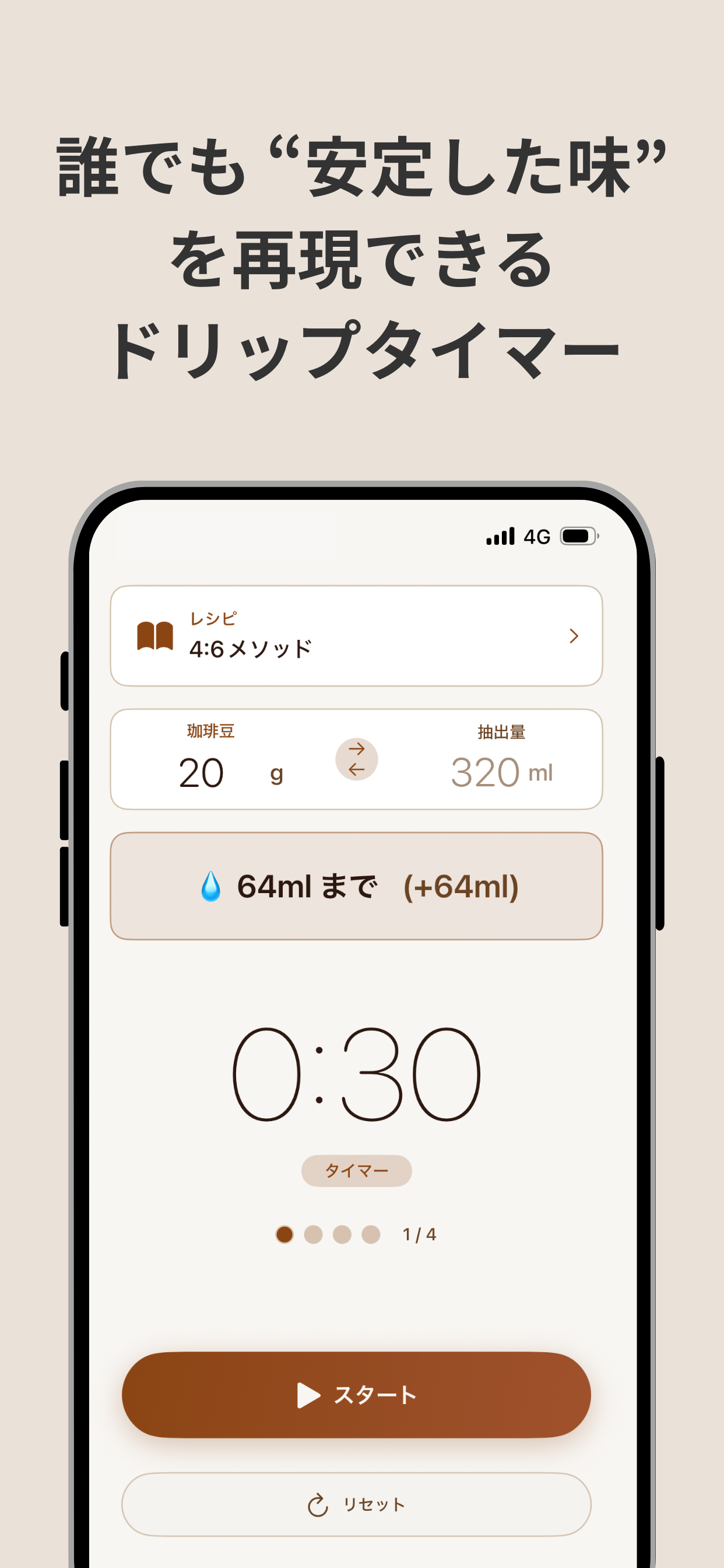 〜安定した味を、いつでも簡単に〜 DripProは、美味しいハンドドリップを誰でも再現できる ドリップ専用タイマー&レシピ管理アプリです。 初心者は迷わず淹れられ、 上級者はレシピ記録ツールとして活用できます。 ■ DripProでできること ● タイマー通知 注ぐタイミングを音でお知らせ。 初心者でもプロのように淹れられる。 ● レシピ保存 豆の量・注湯ステップ・抽出速度を記録。 同じ味を何度でも再現できます。 ● 豆の記録 購入した豆の写真・産地・焙煎度を保存。 好みの味の傾向が見えてきます。 ● 自動計算 豆の量を入力するだけで 必要なお湯の量を自動算出。 ● ステップガイド 「何ml注ぐか」が画面で一目で分かる。 抽出のブレを減らせます。 ■ こんな方におすすめ ・毎回味がバラついてしまう ・自分のレシピを残して、再現性を高めたい ・買った豆の情報を管理したい ・コーヒータイムをもっと楽しみたい ■ 便利な機能 ・ライト/ダークモード対応 ・シンプルで直感的なUI ・サンプルレシピ付きですぐに使える