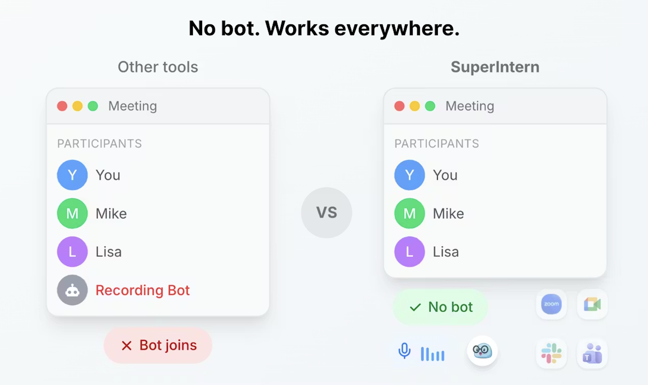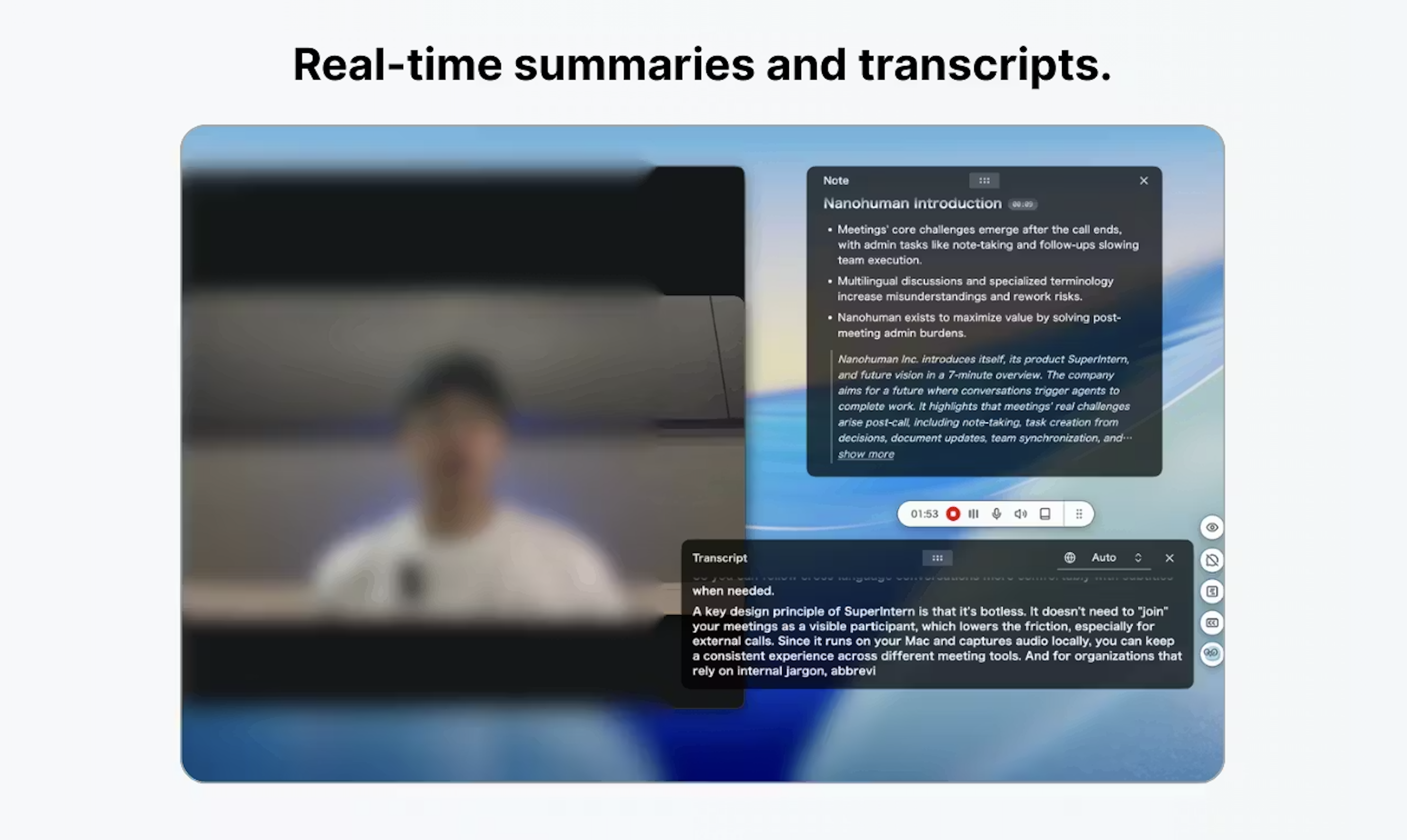 SuperIntern(スーパーインターン)は、日本語に最適化された会議AIです。 会議にAI Botが入らないのに、高精度なリアルタイム文字起こしと議事録を自動作成します。 【特徴・機能】 ・PCのマイク・スピーカーから直接音声を取得するため、会議にBotが入らずに利用 ・Zoom・Google Meet・Microsoft Teamsを含む全てのWeb会議、対面会議もシームレスに対応 ・話者分離により、誰が何を言ったかも整理 ・会議中にリアルタイムで文字起こしと翻訳が表示されるため、どんな言語の会議でも対応 ・会議中にリアルタイムに要約を生成 ・会議内容を基に、AIがタスク整理やアウトプットを作成し、業務を自動化
