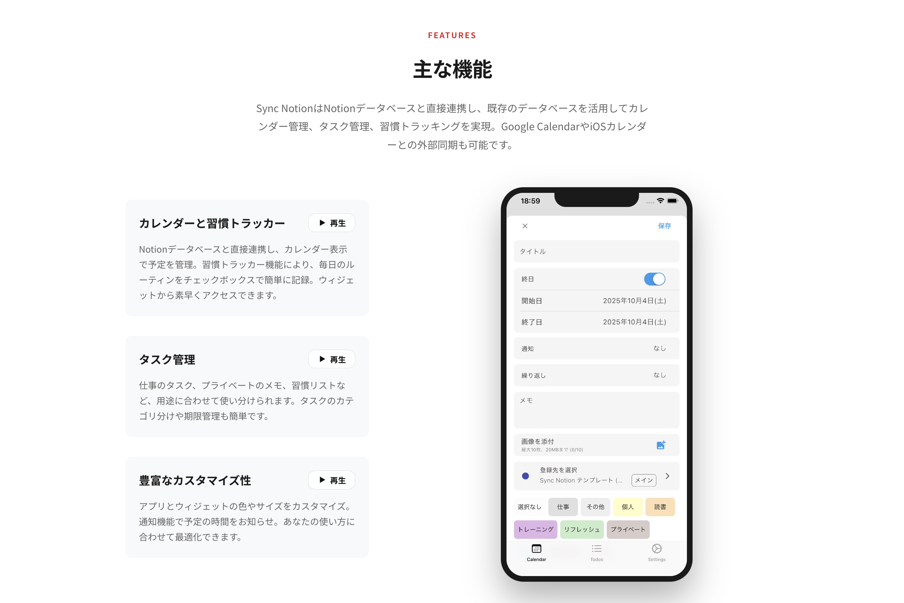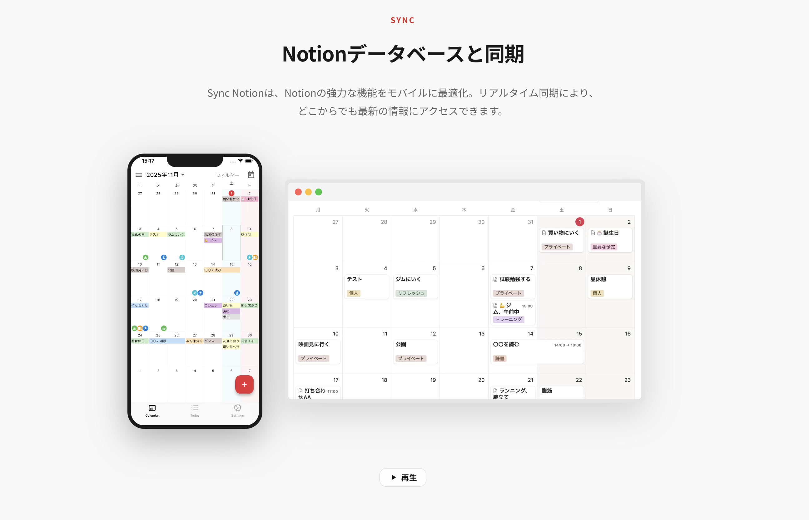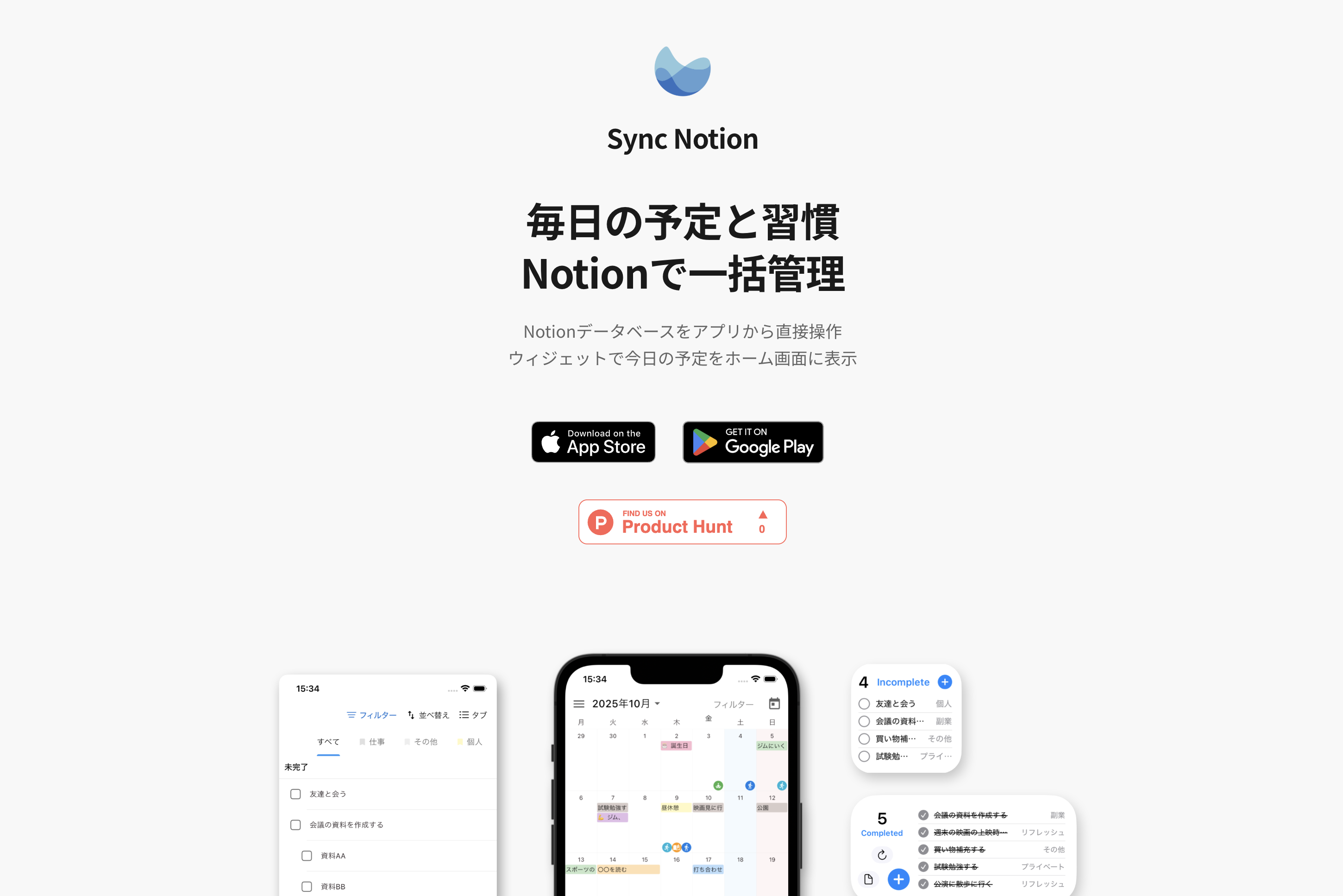 「SyncNotion」 はNotionデータベースと連携してカレンダー表示したり、予定や習慣の記録ができるアプリです。 ウィジェットでいつでもさくっと予定とタスク、習慣を確認できます。 ◇コンセプト Notionで全て管理できるようになりたいと思いつつ、スマホからだとできることが少ない。。 予定の管理や習慣の記録もスマホからNotionに素早く登録できるようになりたい。 そんな課題を解決するために作られたのが SyncNotion です。 ◇機能の概要 Notionのデータベースと連携してアプリからすぐにデータを登録、管理ができます。 ◇主な機能の紹介 1. カレンダー機能 ・アプリから予定の登録と編集。 ・予定の詳細(メモ)も登録可能。 ・ウィジェット表示も対応。 ・タグも指定できます。 2. Todo管理機能 ・Todoの完了・未完了の更新と管理。 ・対話型ウィジェット機能対応。 3. 習慣トラッカー機能 ・カレンダーとは別の習慣用のデータベースに連携可能。 ・習慣トラッカーの記録を瞬時にできます。 ・ウィジェット表示も対応。 ◇Notionカレンダーの公式スマホアプリではできないことを解決 ・月表示のカレンダーに対応 ・タイトル以外に登録できるデータ(プロパティ)が多い ・カスマイズ設定(カレンダーの文字サイズ、表示するイベントの数、土日の背景色など)