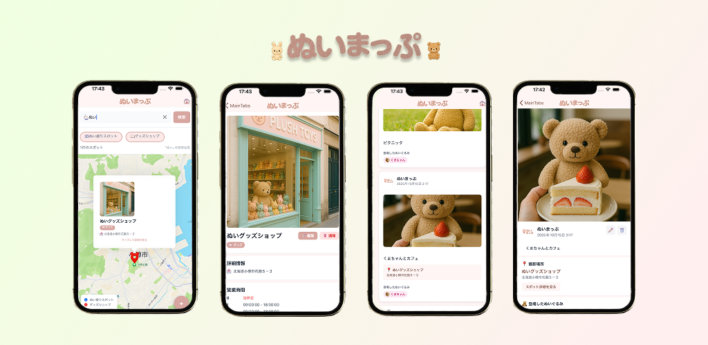 ぬい活をサポートするプロダクト。直感的なUIでぬい活スポットやみんなのぬい撮りを見つけられます。