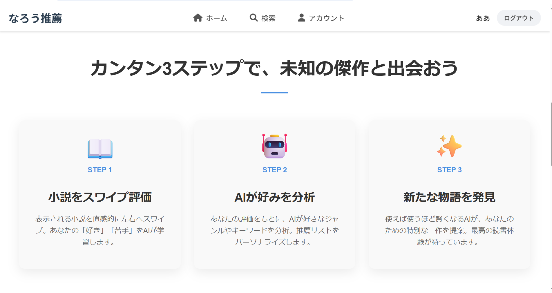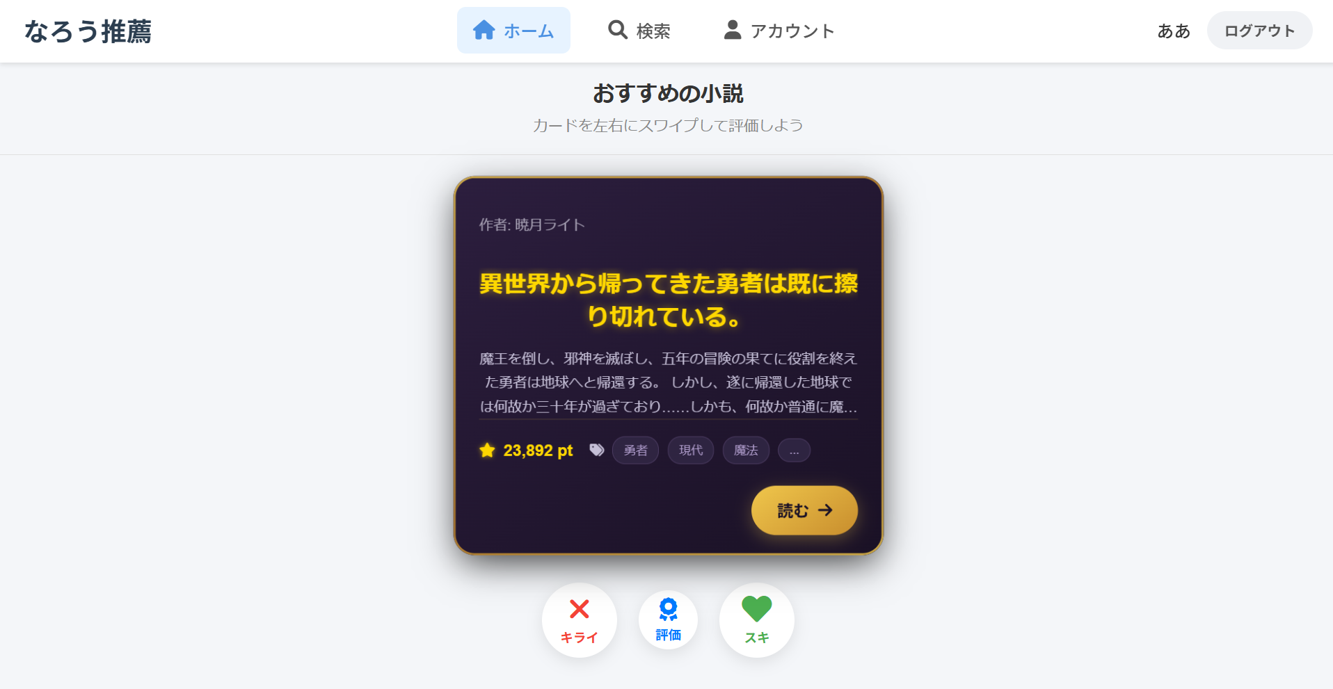 ユーザーの好みを学習し、小説投稿サイト「小説家になろう」の作品の中から最適な小説をおすすめするWebアプリケーションです。 ユーザーは表示される作品に対して「好き」「嫌い」の評価を行うことで、アプリはユーザーの嗜好(ジャンルやキーワード)をプロファイリングします。このプロファイル情報と、作品自体の人気度(総合評価ポイント)を組み合わせて、各ユーザーにパーソナライズされた推薦リストを生成します。