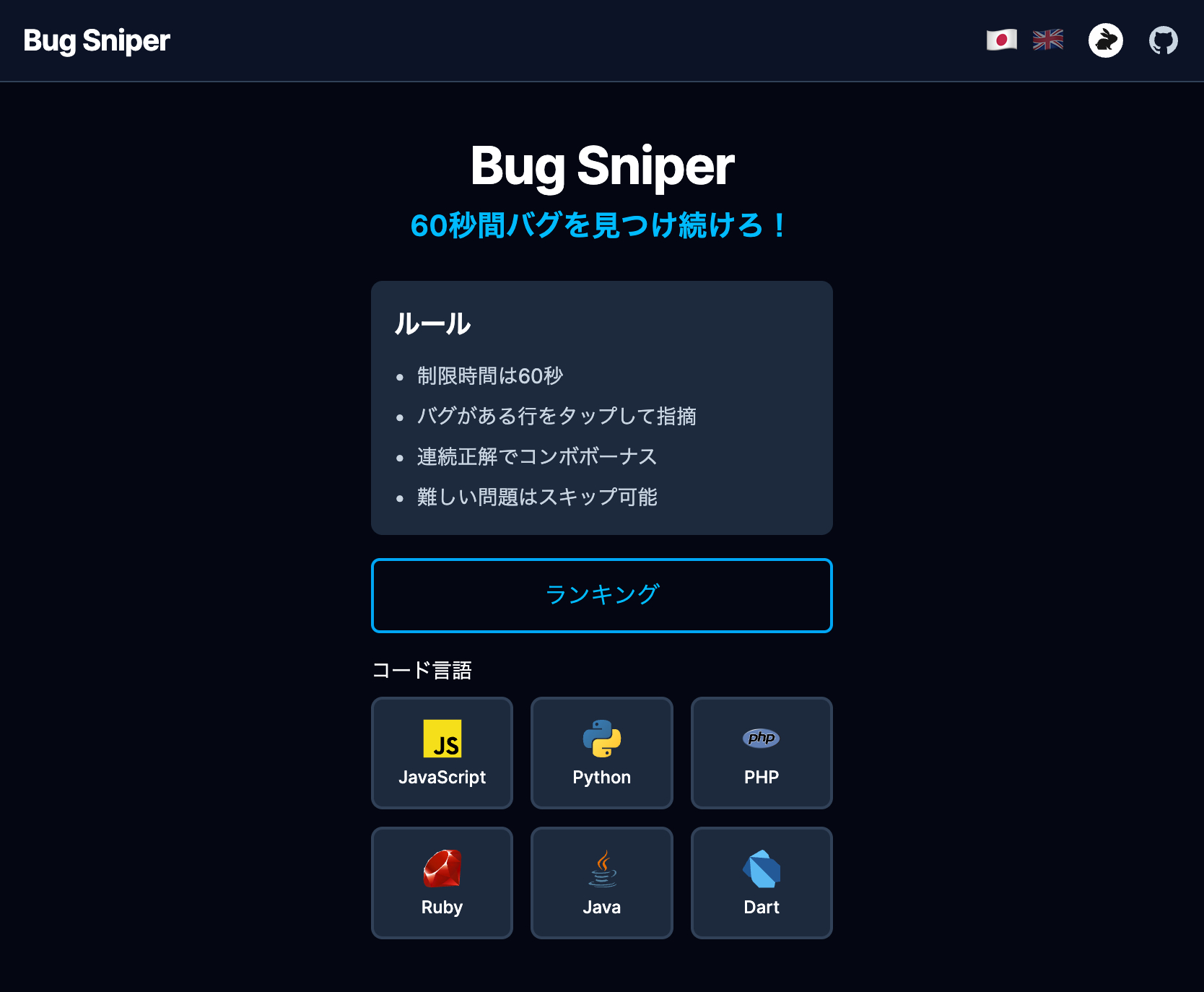 Bug Sniperは、スマホ・デスクトップのブラウザで遊べるゲームです。プログラミングコードに潜むバグを発見するゲームになります。 言語は以下の6種類です(2025/11/26現在) - JavaScript - Python - PHP - Ruby - Java - Dart レベルは1〜3まで用意されていて、ランダムに出題されます。1つのコードの中には1〜3つの不具合があります。それだと思わしき部分をタップすると、正解(緑)または不正解(赤)が表示されます。 連続で正解すると、コンボとなって高得点が獲得できます。赤は-1点なのでご注意ください。すべての不具合を見つけた場合も加算されます。 得点を記録して、Xにシェアできます。また、結果をLLM(Gemini API)にて評価します。 本ゲームはClaude Code on the webを使って作られています。