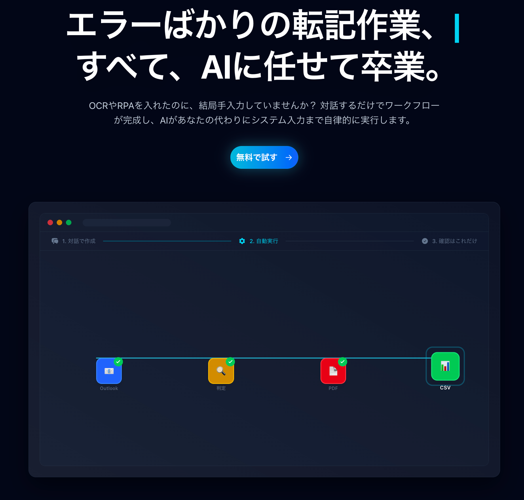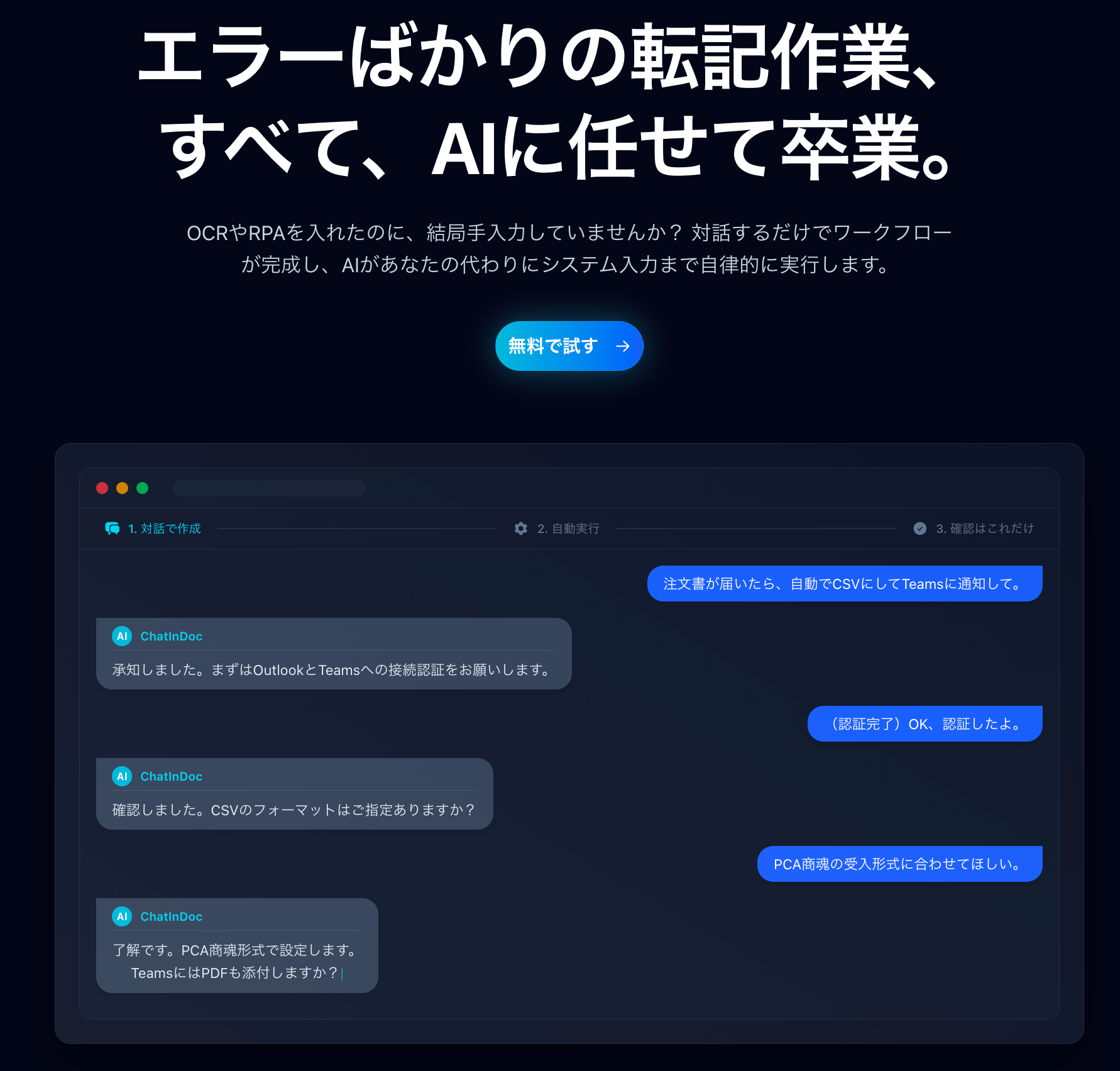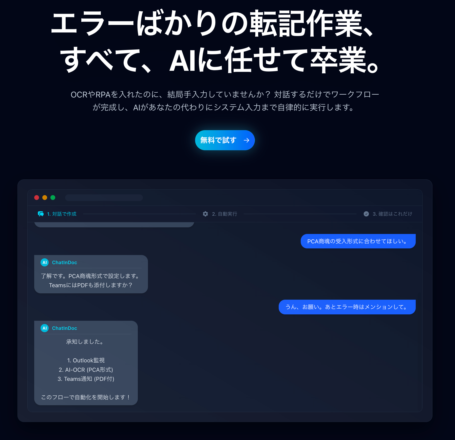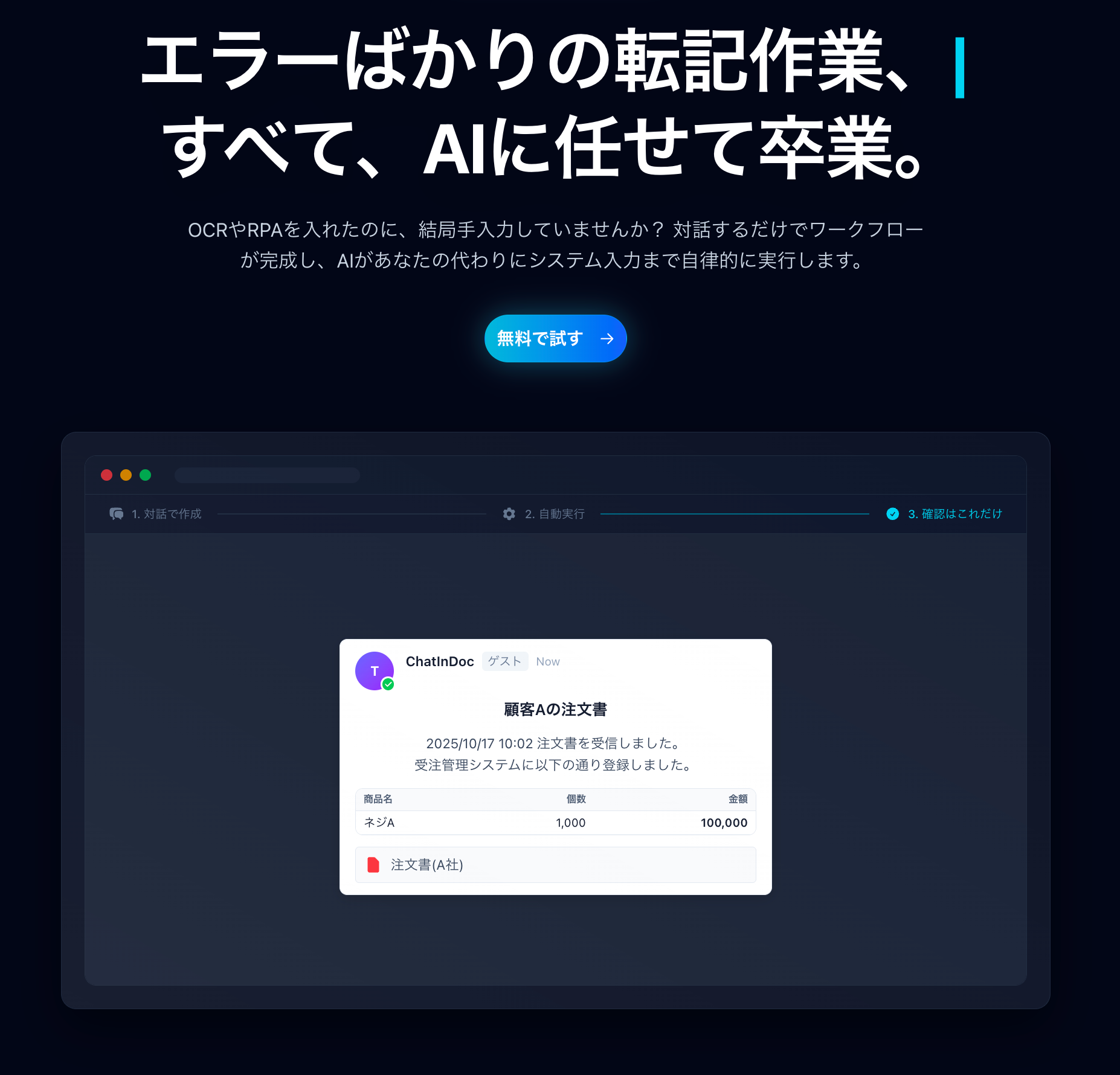 現場が注文書の処理で浪費している時間を、ChatInDocがすべて肩代わりします。ファイル読み取り、情報抽出、構造化、データベース反映、次アクションの自動実行まで、面倒な工程をAIエージェントが連続処理。“設定のための設定”を排除し、現場が何もしなくても仕事が進む状態をつくります。OCRやRPAの調整に疲れたチームにこそ向けた、実務特化の自動化プロダクトです。
