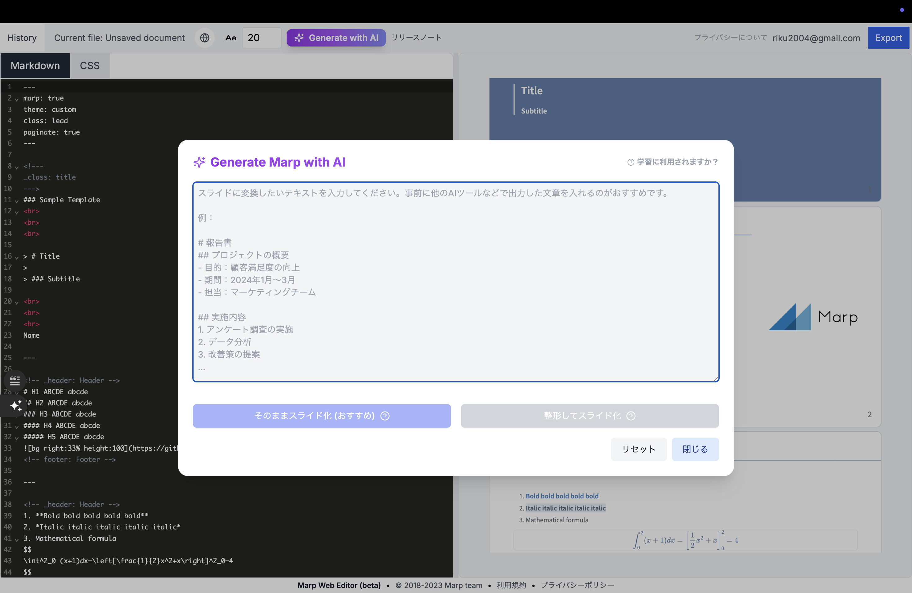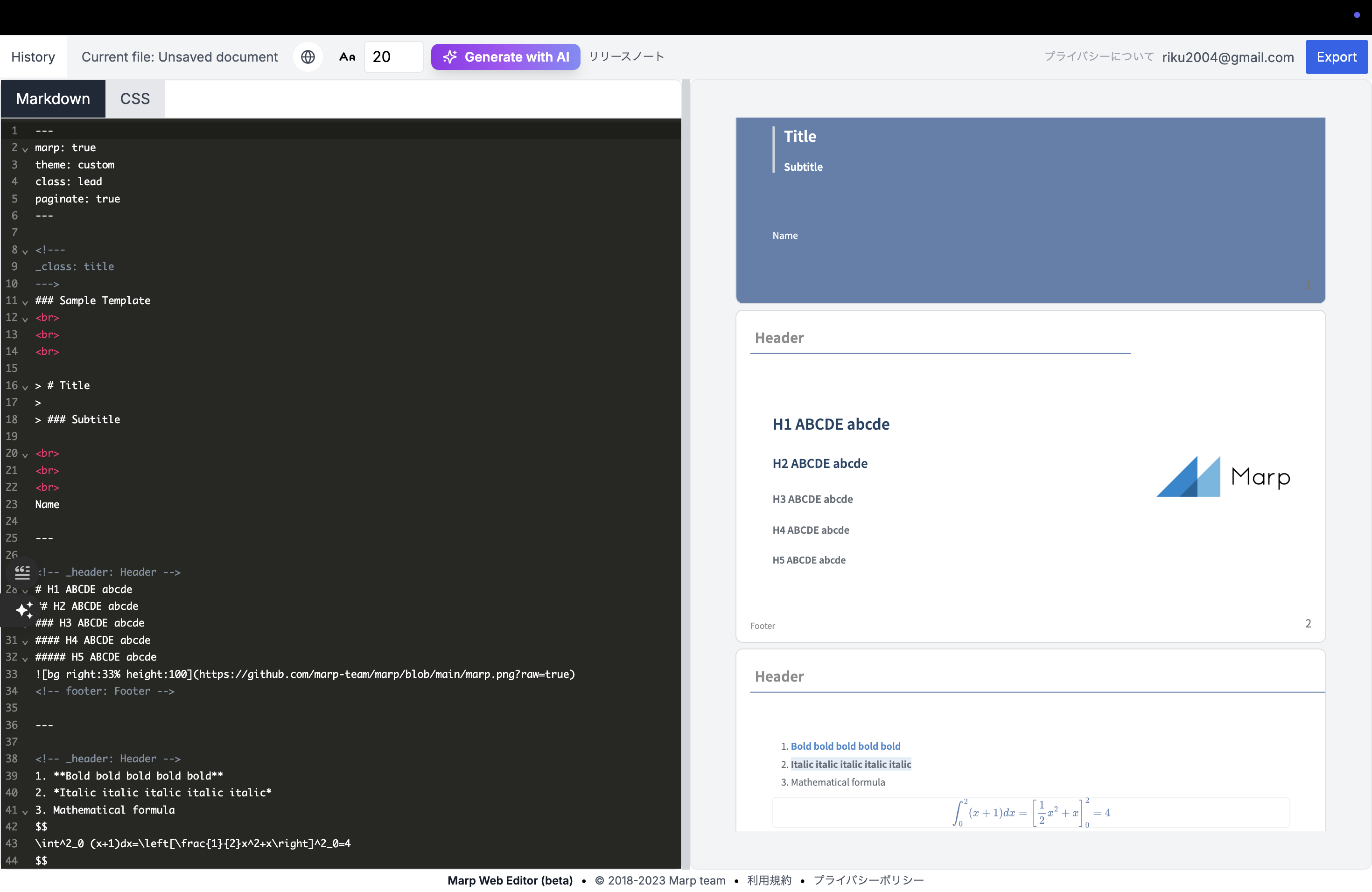 マークダウンでスライドが作れるMarpをWeb上で編集できるアプリです。 PDF、パワーポイント、HTML出力対応! 月間ユーザー2000人突破しました🥳