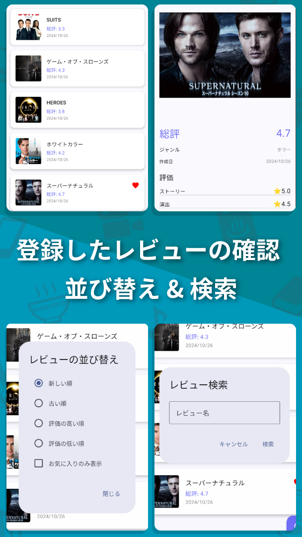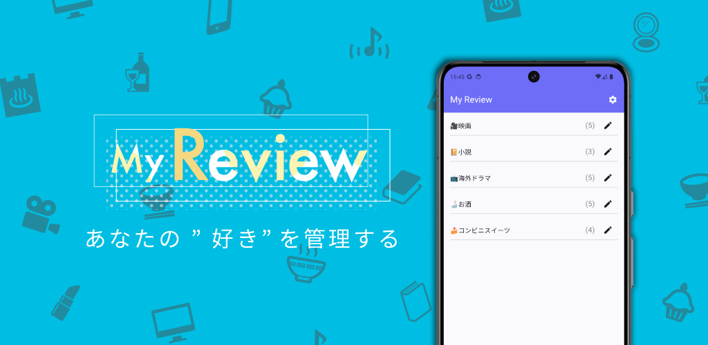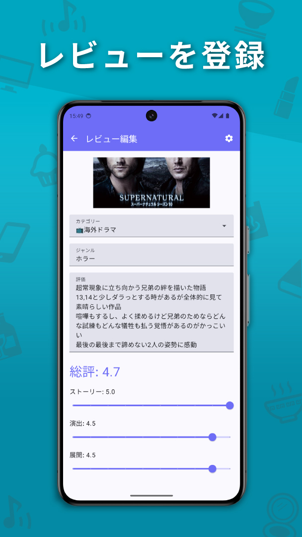 趣味をレビューしながら管理するアプリです 例えば映画が好きなら見た映画を自分の決めた項目ごとに評価して管理できます 「好き」をより深く楽しめるアプリです iOSもリリース準備はできているのですがまだAndroidのみのリリースになります