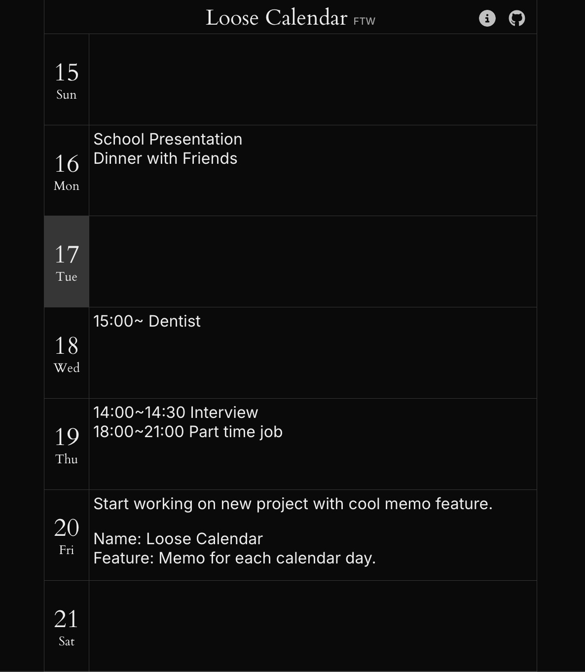 Loose Calendarは今週の分だけ、1日単位でメモを書けるカレンダー。 Google Calendarのような時間単位で指定するカレンダーがどうしても使えず、メモ形式で作りました。 データベースはなく、データはブラウザのローカルストレージに保存されます。今週以外のメモは読み込み時に削除されます。 1日くらいで作ったので、もしバグがあったら教えてください。特にタイムゾーンと言語は全世界自動で対応されるはずですが、もしミスってたら。