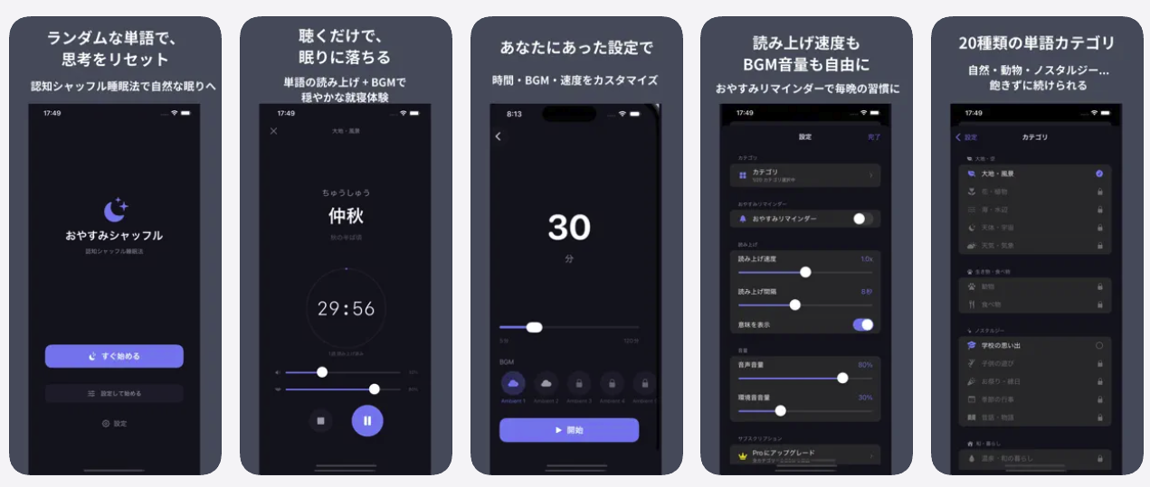 布団に入っても思考が止まらない夜に。 認知科学者が提唱した「認知シャッフル睡眠法」をアプリ化しました。 ランダムな単語を読み上げることで脳の論理的思考を断ち切り、自然な入眠をサポートします。 5,000語以上・20カテゴリの日本語コンテンツ、17曲のBGM、就寝特化のダークUI、バックグラウンド再生対応。 再生したらスマホを置くだけ。無料でも使えます。