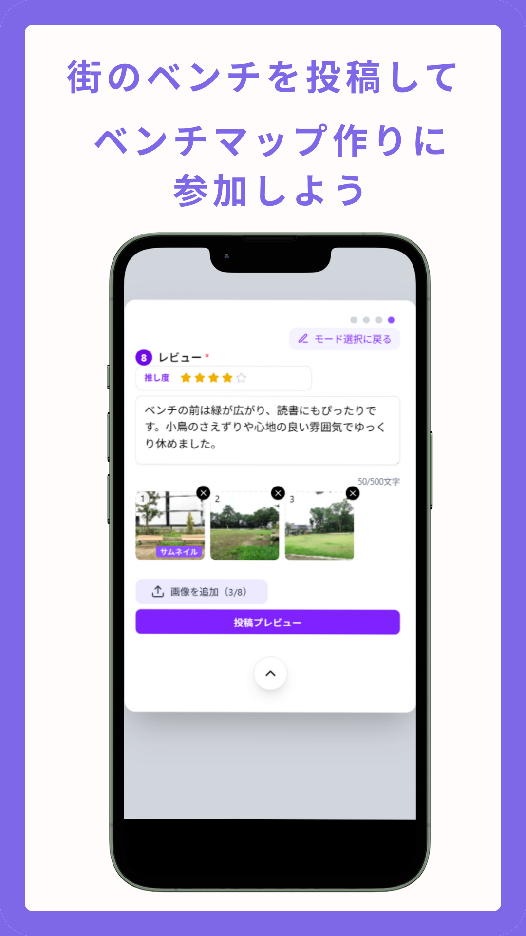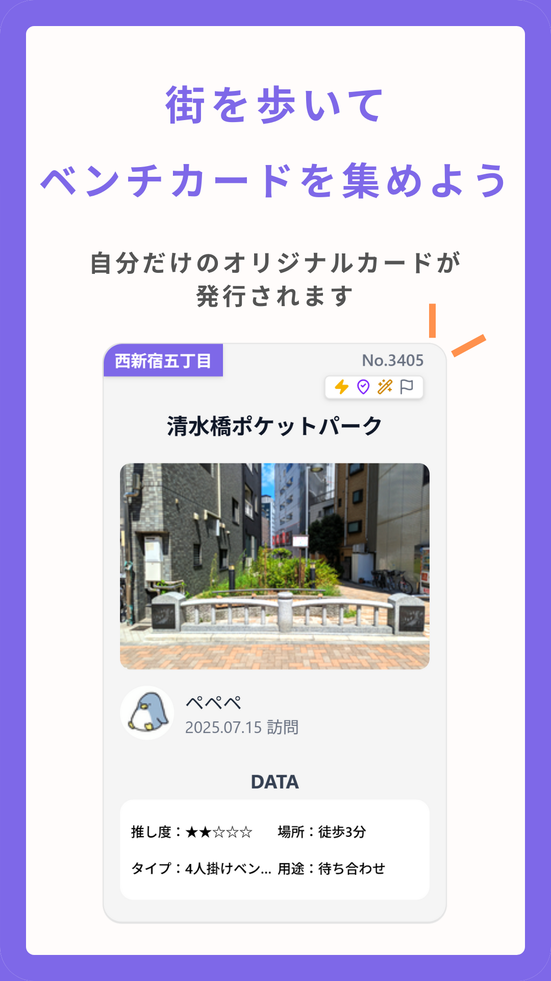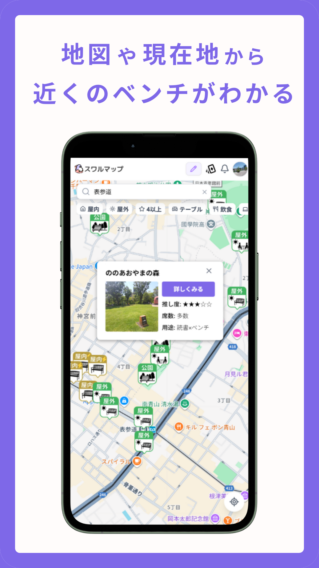 \全国のちょっと座りたいが見つかる/ 国内最大級のベンチ情報を掲載しているアプリです。 「カフェに入るほどでもないけど、座って休憩したい」と思ったことはありませんか? スワルマップなら、現在地近くにあるベンチや休憩場所がサクサク見つかります。 すべて現地調査によるレビューつき。 ほかにも、ベンチを投稿することでベンチマップ作りに参加したり、街を歩きながら集められる「ベンチカード」で楽しく利用できます! 人力で調査しているのでベンチが無いエリアは、ぜひ投稿もお待ちしております! 【主な機能】 ■地図でベンチ・休憩場所が見つかる 地図上で「屋内」や「テーブル」など、用途に合わせてぱっと見つかります。 ■現在地から見つかる 最寄りの休憩スポットが一目でわかります。 ■現地調査レビュー 現地で撮影した写真とともに、雰囲気や感想、オススメポイントなどのリアルな情報も掲載。 ■お気に入り機能 気に入ったベンチを保存。よく使うスポットをすぐ閲覧できます。 ■ベンチカード ベンチにチェックインすることで、デジタルスタンプラリーのように、自分だけのオリジナルカードを集められます! ■ベンチの投稿 あなたの街のベンチはお任せします! 自分が知っているベンチを投稿することで、多くの方が助かります。いいねやコメントがつくことも。 管理人だけではなく、ユーザーの皆さんの投稿が半数を占めています。 みんなの力でベンチマップを作り上げていけるサービスです。 【こんな方におすすめ】 ・お散歩や自転車での休憩スポットを探したい ・お弁当を食べたりテイクアウトを楽しめる広場を探している ・お年寄りやお子様連れで、すぐに座れる場所を見つけたい ・営業の外回りで、PC作業やメールチェックができる場所を探している ・カフェ代わりに屋外で作業・読書したい ・街歩き・撮影・公園めぐりが好き 【運営について】 本サービスは、「街の居心地を良くしたい」という想いのもと、個人開発者が運営しています。1つずつ歩き回って現地調査しています。データは日々更新しています。あなたの街の隠れた休憩スポットも見つかるかもしれません。 【スワルマップで街はもっと優しく】 「お出かけしても、ほっとできる場所がある」 街なかにある休憩スポットを見つけやすくし、人と街のつながりを豊かにします。