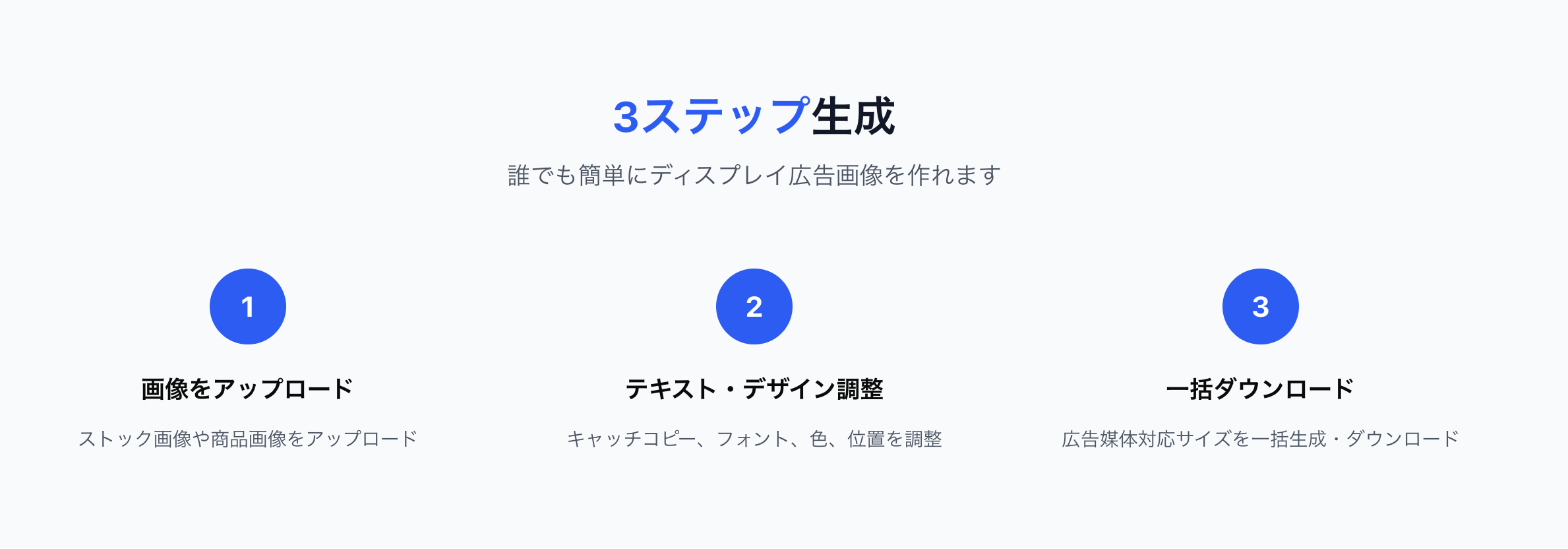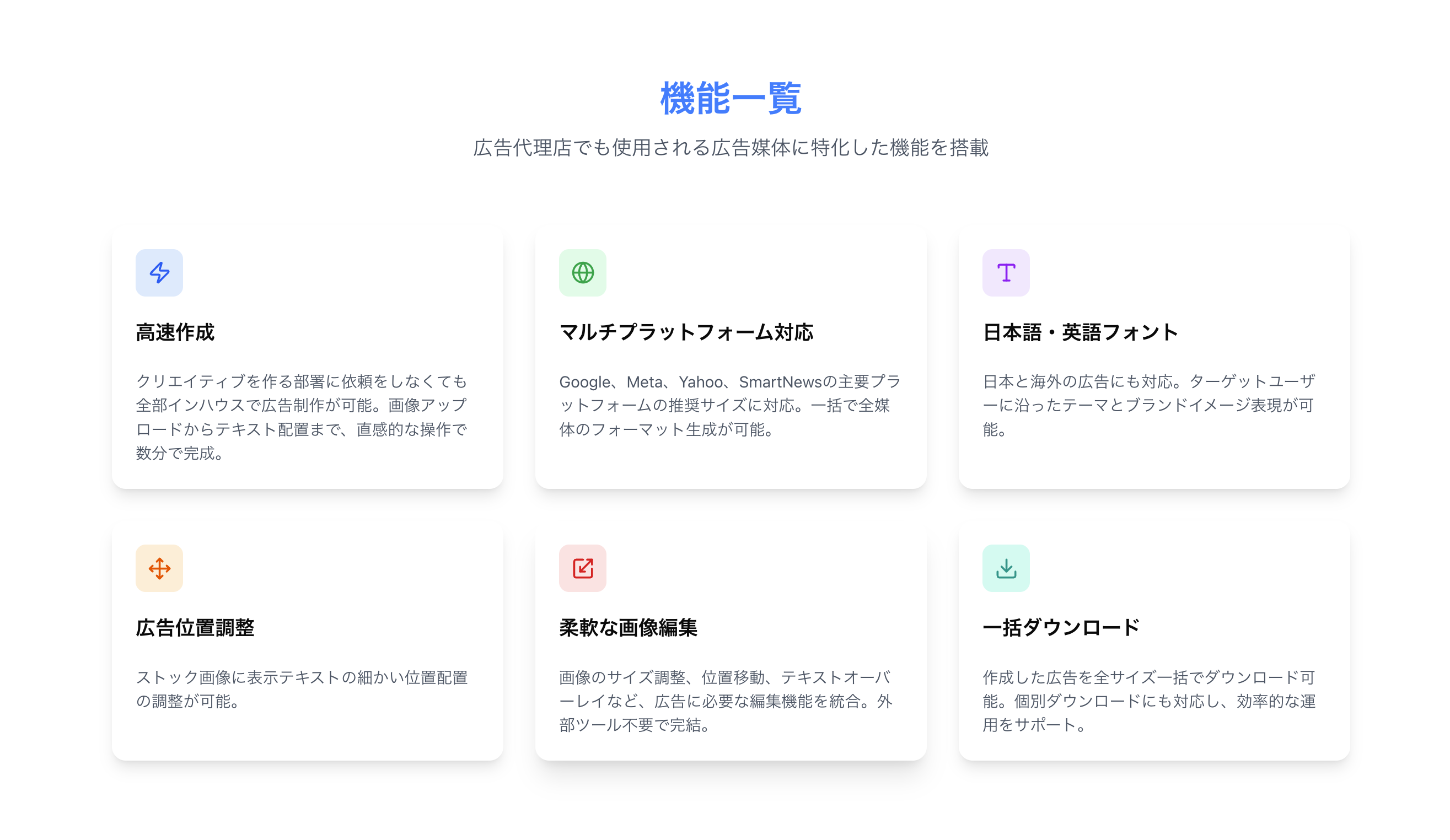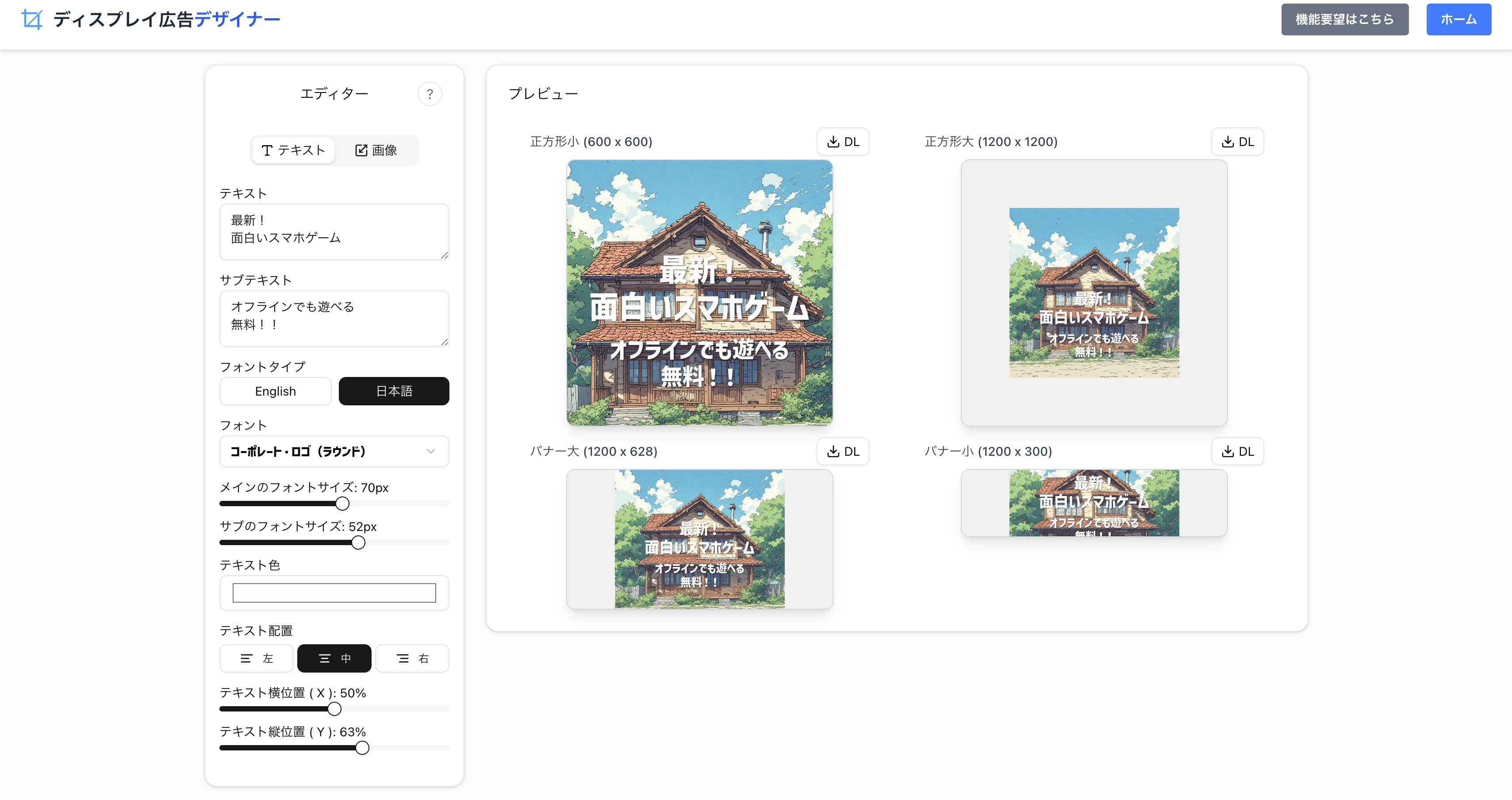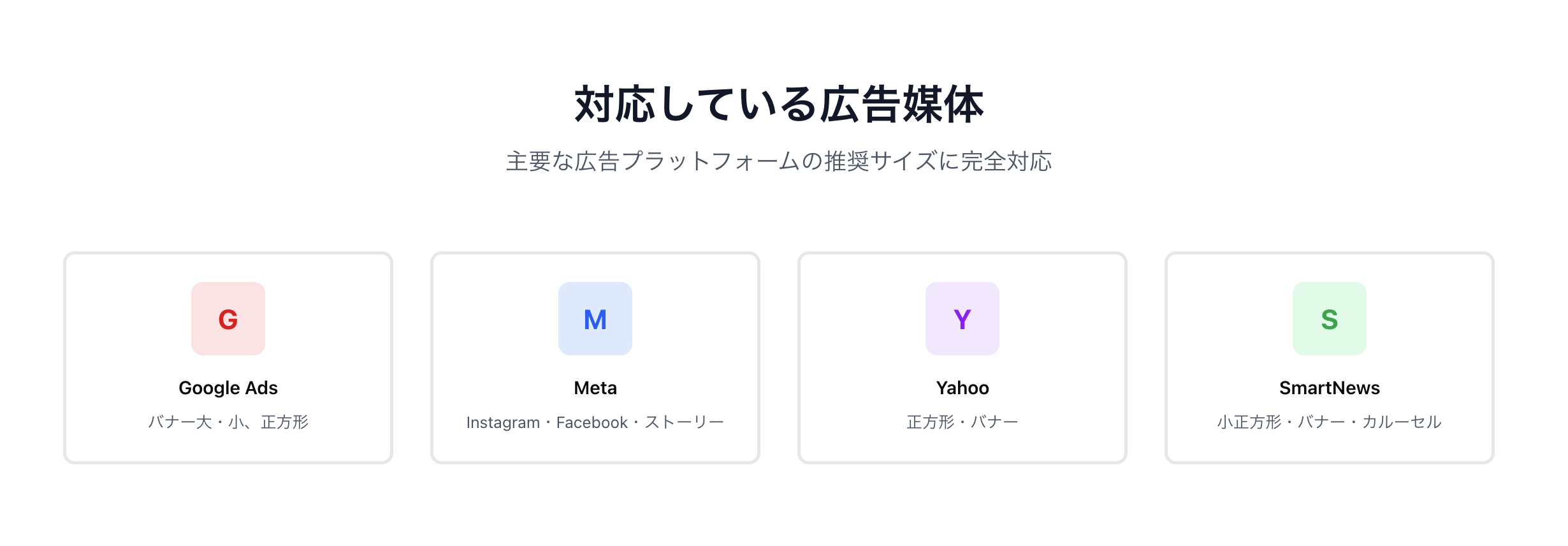 主要な広告媒体に対応したディスプレイ広告画像作成ツールです。 - Instagram、Google、SmartNews など、主要媒体に対応したサイズプリセットを搭載 - 画像・テキスト・フォント・配置などをカスタマイズ可能 - 完成したデザインはそのまま画像としてダウンロードOK - すべてブラウザ上で完結。インストールや登録も不要です 複数の広告媒体で広告運用をしている方、画像制作を他部署や外部に依頼している企業やチームの方向けの業務効率化ツールです!