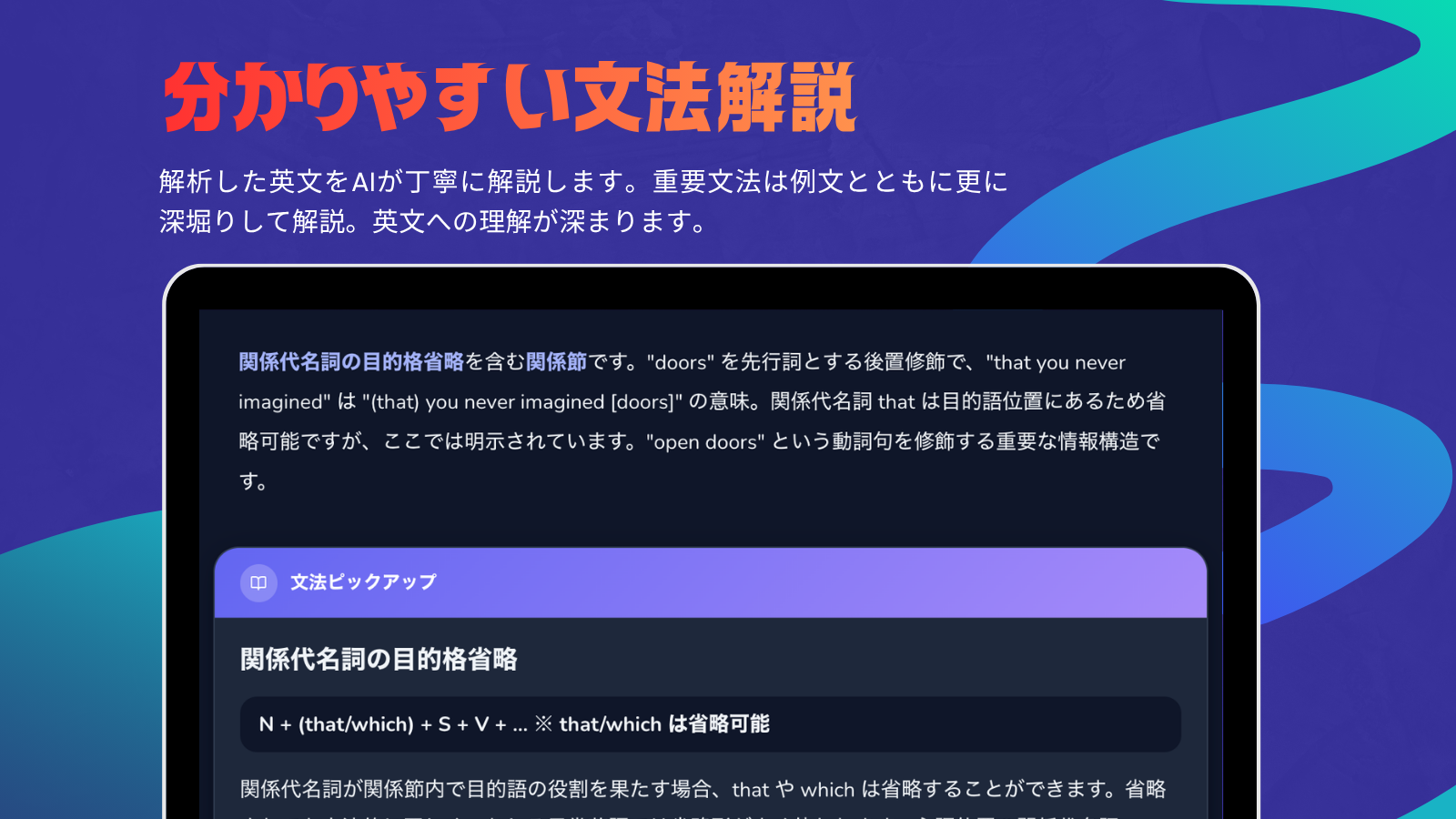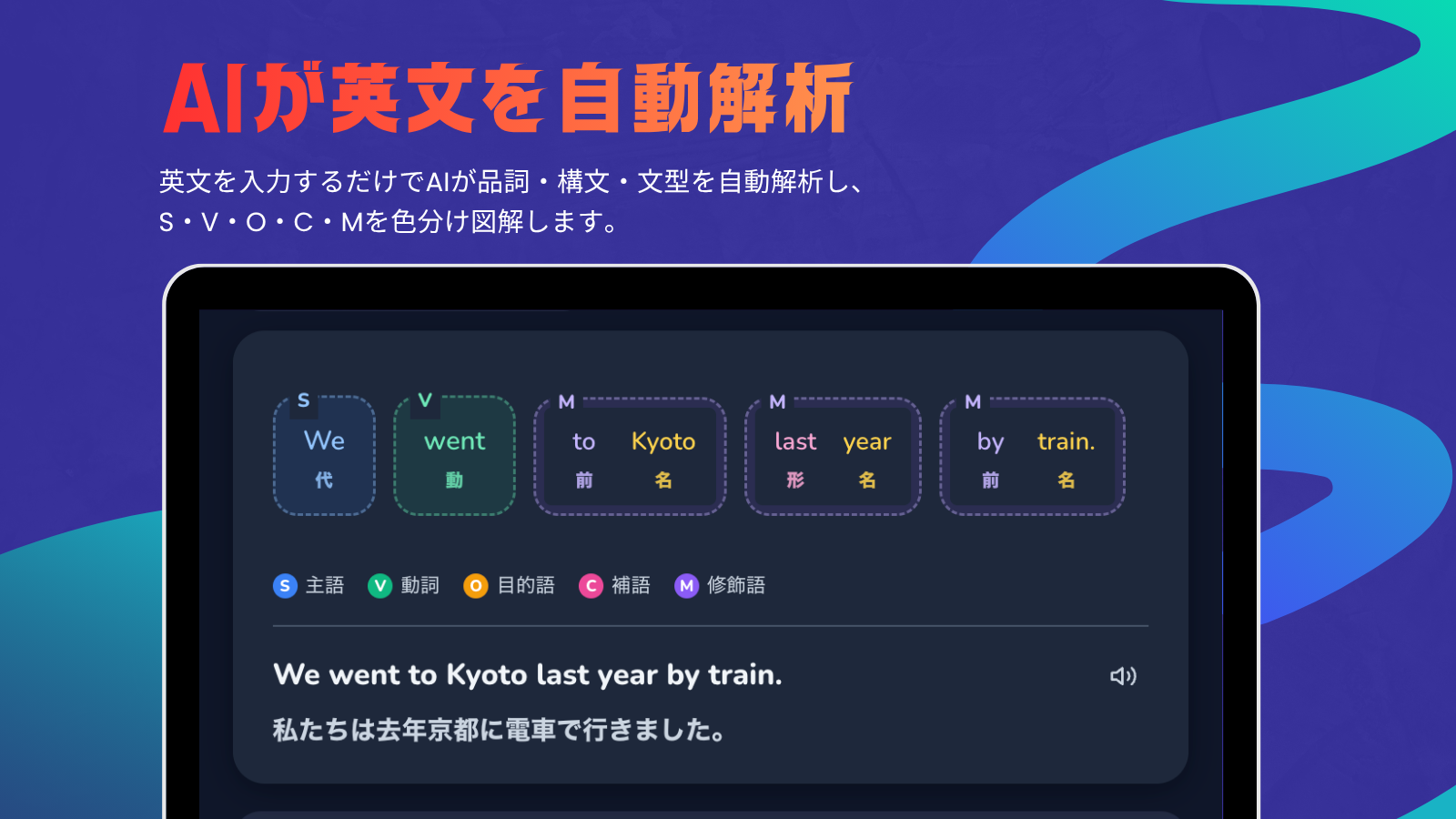 英語学習者のための英文解析ツール!AIが品詞・構文・文型を瞬時に解析し、S・V・O・C・Mを色分け図解。英文を構造から理解する手助けに。
