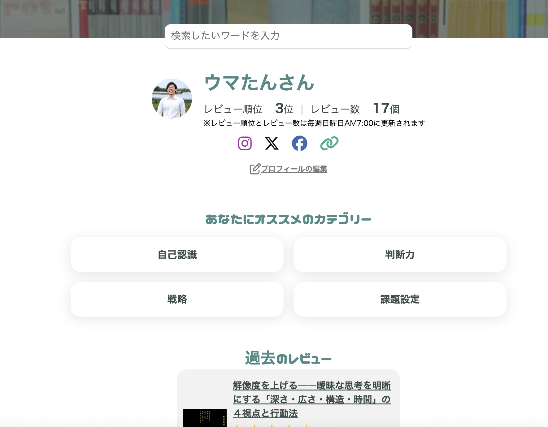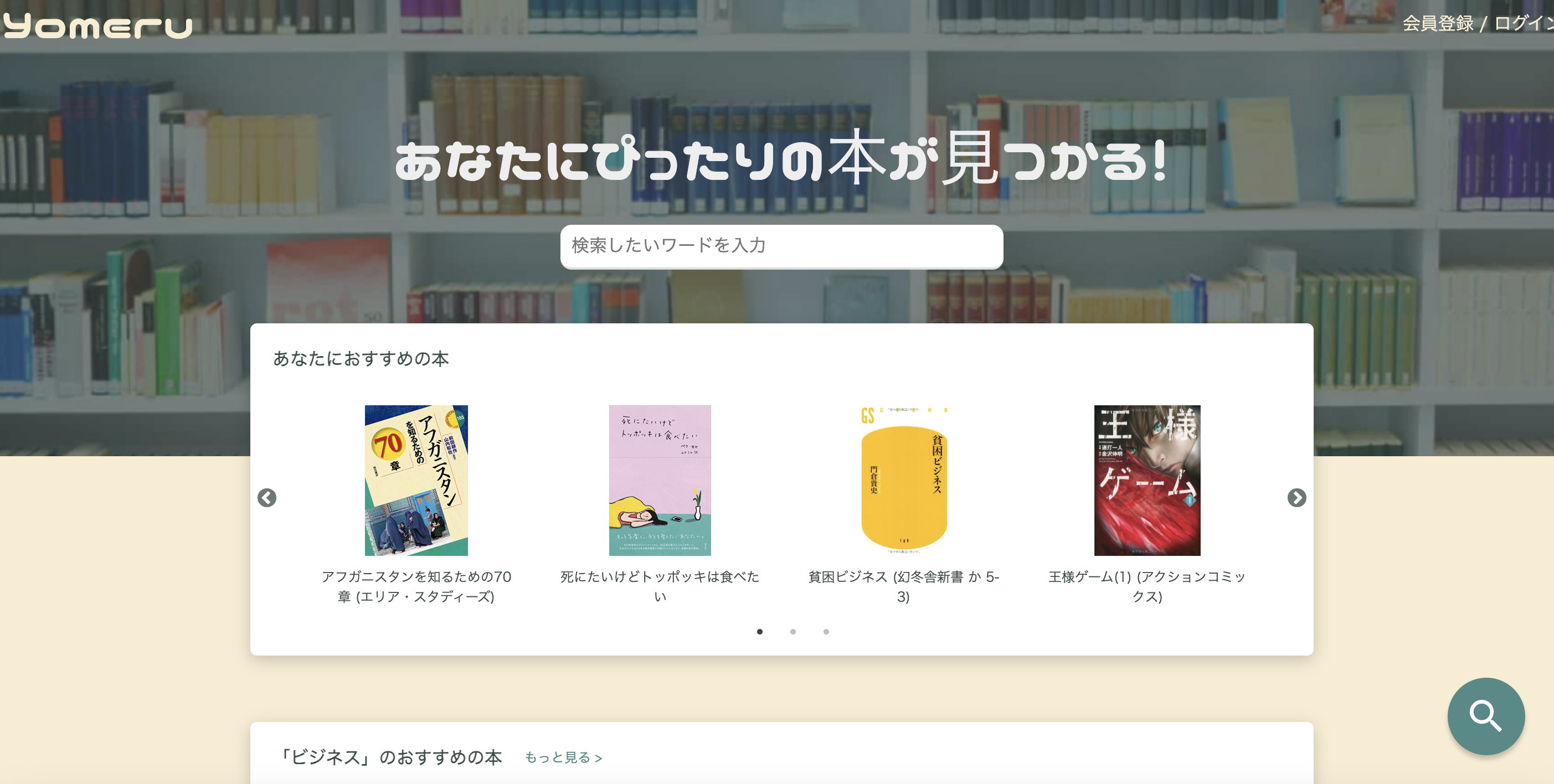Yomeruはあなたにピッタリの書籍を見つけ読書記録を付けていくWebアプリです。 Yomeruでは以下のファクターに重み付けをして独自のロジックでおすすめ度を算出しています。 ・特定の書籍を紹介しているサイトの数 ・そのサイト自体の検索順位 ・そのサイト自体における特定の書籍の紹介順序 すなわち、なるべく多くの記事になるべく良い位置で紹介されている書籍ほどおすすめ度が高くなります。 色んなカテゴリやキーワードから次に読む本を見つけて読書習慣を作りましょう!