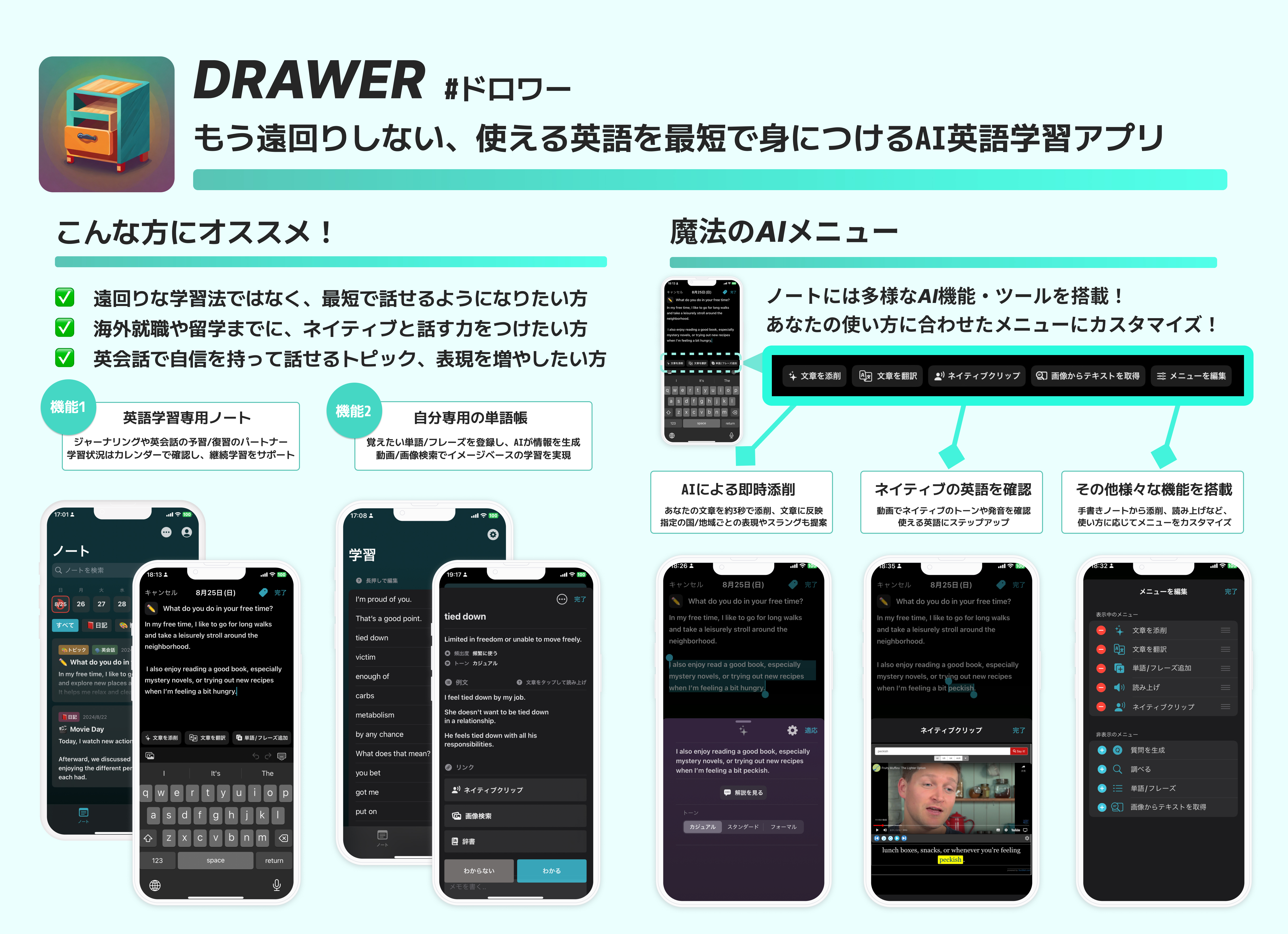 「もう遠回りしない、使える英語を最短で身につけるAI英語学習アプリ。」 ドロワーは、AIによる即時添削や自然な読み上げ機能であなたの話すための英語学習効率を最大化するアプリです。 また、カスタマイズ可能な添削機能やイメージベースの学習、自分専用の単語帳作成など、多彩な機能で効率的に英語力を向上させます。