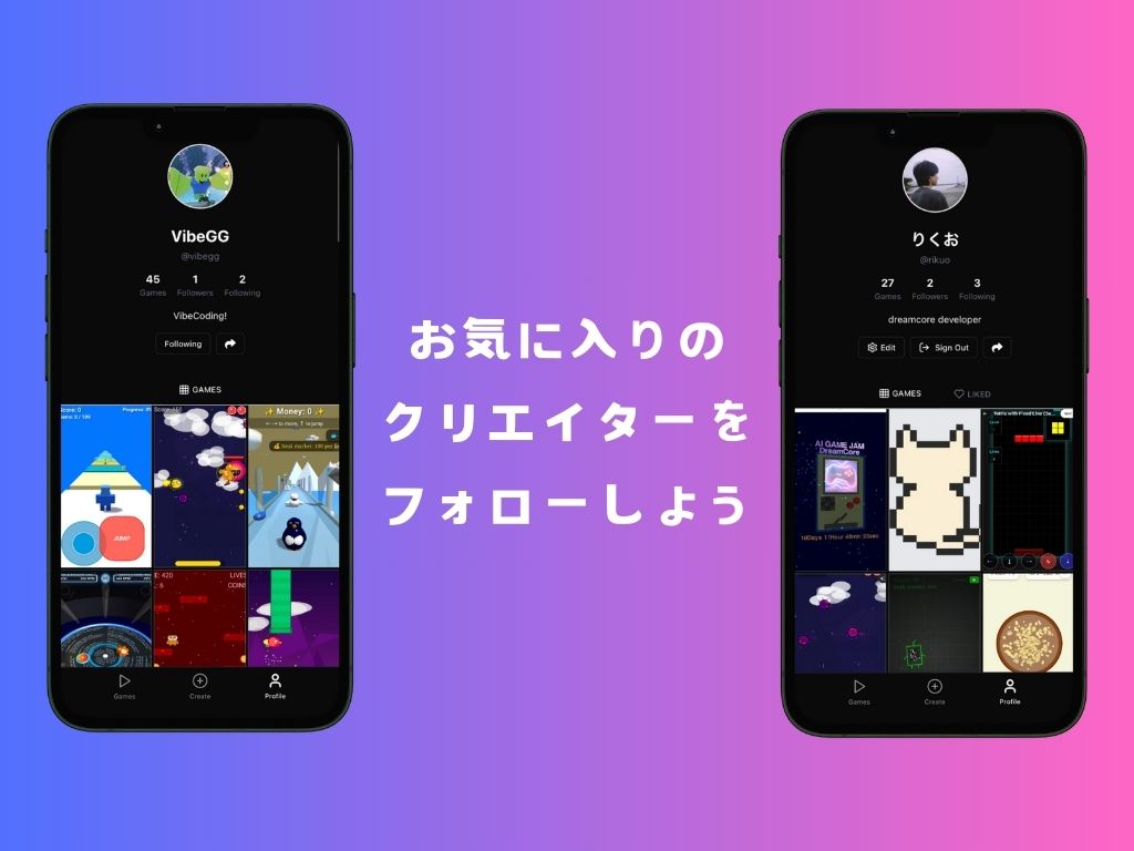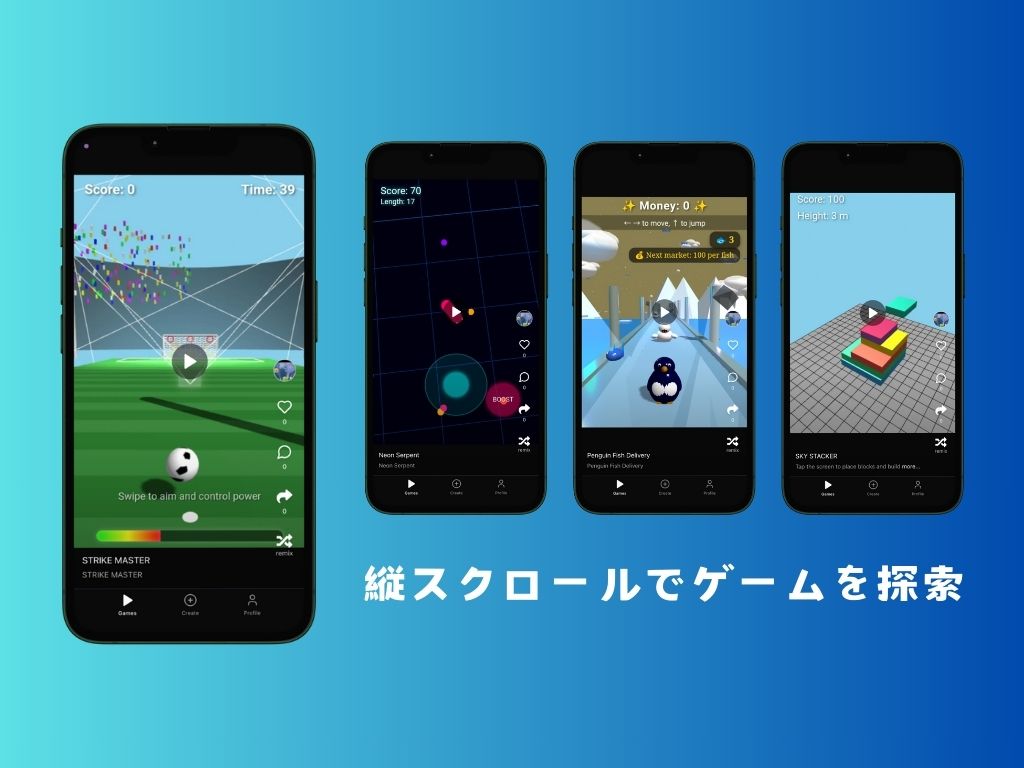 スマホ1台、AIにお願いするだけで誰でもゲームを作成&投稿! 縦スクロール型のSNSで、いろんなゲームを探索できます。 いろんなゲームで無限に暇を潰しましょう!! ※現在β版のため、ゲームプレイ&ゲーム投稿のみ可能です! 紹介ツイート https://x.com/riku720720/status/1912757187325444342