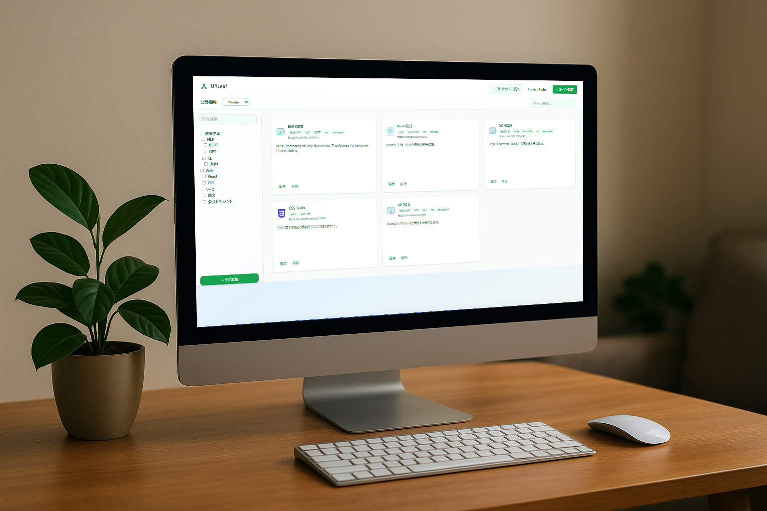 URLeafは、学習・研究・開発などにおける情報整理と共有を支援する、AIエージェント対応のブックマーク管理サービスです。 🌟 主な特徴 🔖 ツリー型タグでブックマークを整理 文脈に応じた階層管理により、同じタグを柔軟に使い分け可能。 🌿 プロジェクト単位での直感的な操作 視覚的なタグ構造とともに、情報を整理・閲覧・編集。 🤝 チームでの共有と共同編集 プロジェクトごとに公開範囲や編集権限を設定し、仲間と情報を共有。 🧠 AIエージェントによる自動分類 MCPサーバーとして動作し、AIが検索結果をブックマークに自律追加・整理。 📤 CSV・YAML・JSON形式での出力 多様な形式でのエクスポートに対応し、他ツールとの連携も容易。 📌 使用例 📚 教育資料の分類と共有 科目・分野別のタグを使って教材リンクを整理し、クラスメイトや講師と共有。 💼 チームでの調査リンクの収集 プロジェクト単位でリンクを集め、進捗や知見をチームで管理。 🧪 研究論文や技術記事のアーカイブ 「論文」「ドキュメント」などのタグを横断しつつ、文脈ごとに分類。 📓 外部ドキュメントサービスの活用 ドキュメント自体は外部サービスで管理し、リンクのみをURLeafで整理。 🛠️ AIによる自動ブックマーク収集 エージェントが検索結果から自動でリンクを整理・登録。 ⌚ 開発経緯 以前投稿した「ログツー」は学習者の支援を目的としたWebアプリで、URLeafで提供予定の階層タグ・ブックマークシステムを既に導入済みです。この機能を汎用性が高い形で提供することを目指し、開発に着手しました。 https://www.solomaker.dev/products/e9819dfe-ba42-4d24-a0b1-2ea0663650db