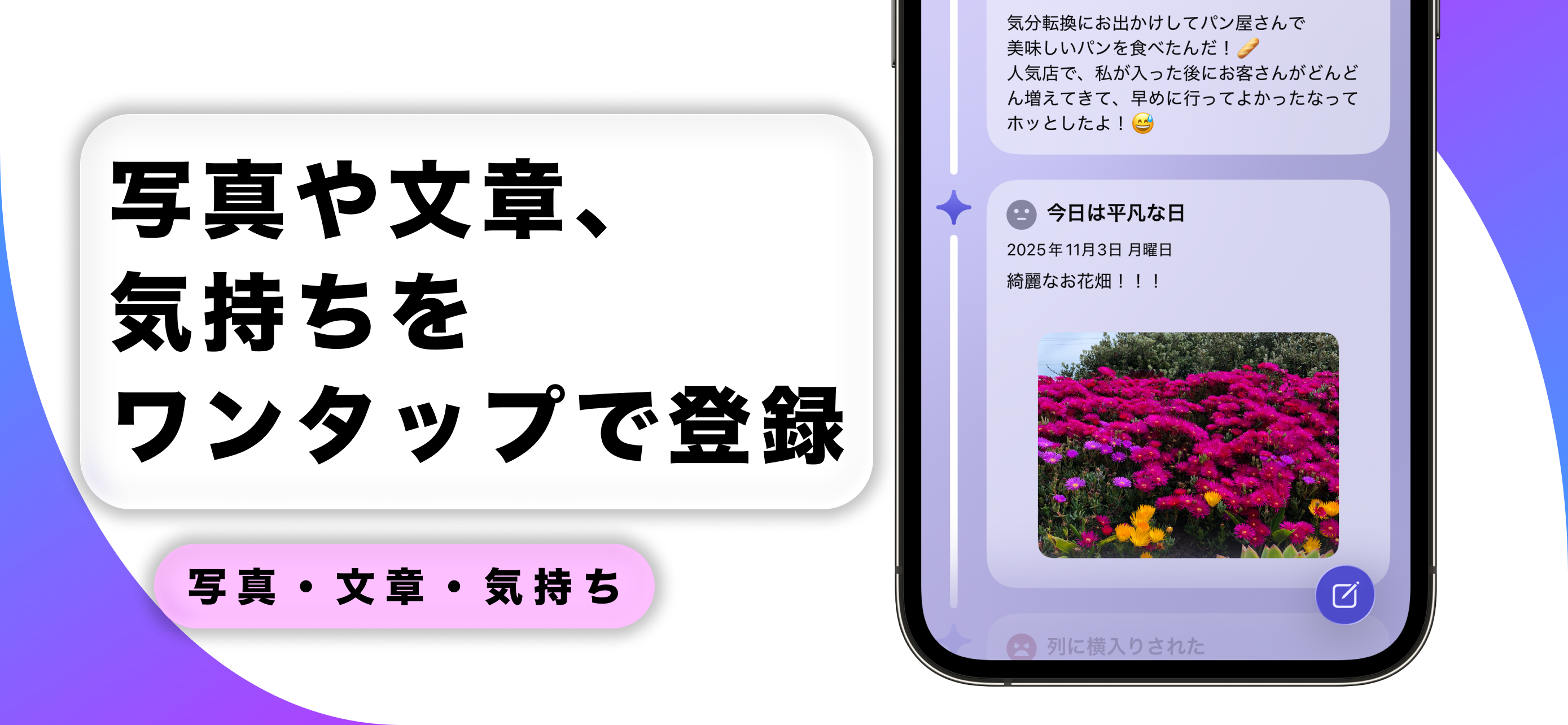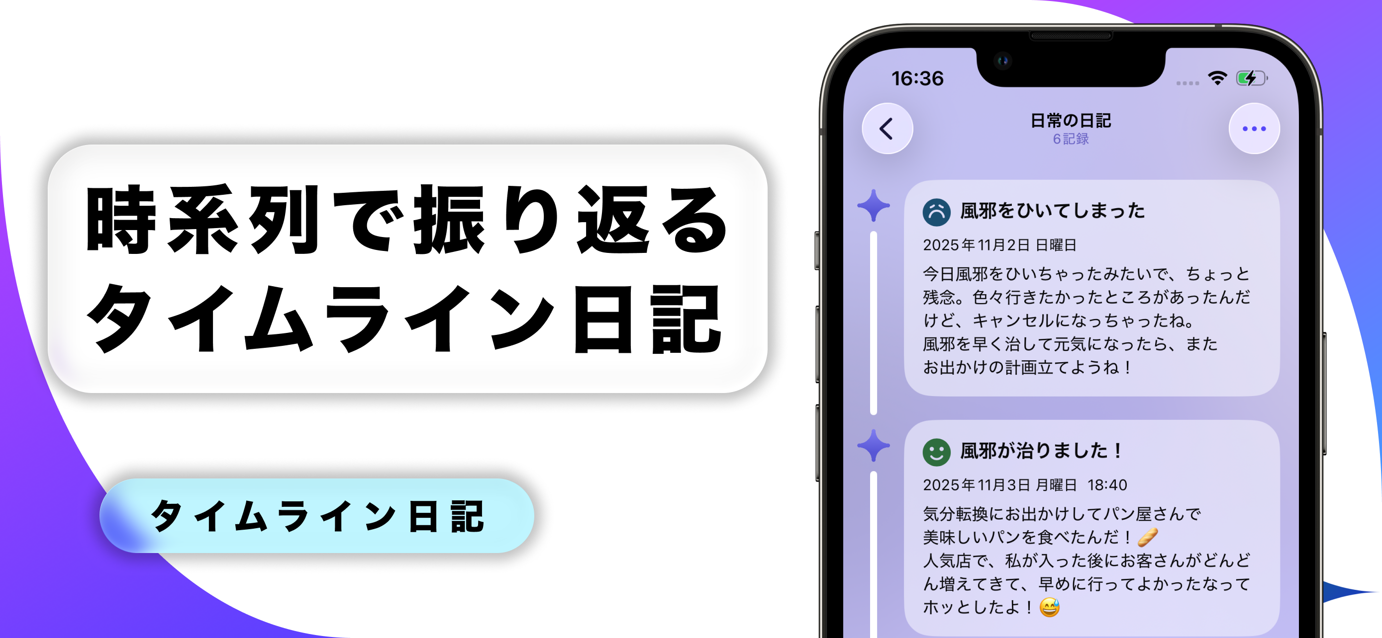 日記 with AIは、時間の流れとともに日々の感情や出来事を丁寧に記録できる、iPhone向けのシンプルで美しい日記アプリです。 感情の変化や思い出を「見えるかたち」で残し、自分だけの人生の日記を作り上げましょう。 ■ タイムラインとカレンダーで、毎日を振り返る ・シンプルなタイムラインで、最近の記録を一目で確認。 ・カレンダー表示に切り替えると、空白の日が一目で分かり、継続のモチベーションを維持できます。 ■ 写真付きで思い出をビジュアルに記録 ・1投稿につき最大10枚の写真を添付可能。 ・旅行やイベントの記録も、画像と一緒に残せます。 ・サムネイル付きのタイムラインで、思い出を視覚的に振り返る楽しさを。 ■ AIアシスタントが寄り添う、優しい日記体験 ・AIがあなたの日記に温かいコメントを届けます。 ・まるで誰かが読んでくれているような安心感。 ・AIの性格やコメント頻度をカスタマイズでき、 Plus / Proプランではより共感的で繊細なサポートが可能です。 ・AIからの通知で、忙しい日でも記録を途切れさせません。 ■ 続けるほど見えてくる、あなたの軌跡 ・年間投稿数、記入日数、累計文字数を自動集計。 ・書くほどに「自分の足跡」が数字として残ります。 ・統計ダッシュボードで、日々の積み重ねを実感。 ■ カスタマイズと安心のバックアップ ・豊富なテーマカラーから好きなパレットを選択。 気分や季節に合わせてアプリ全体の雰囲気を変更できます。 ・iCloudバックアップ対応で、機種変更時もデータを安全に移行。