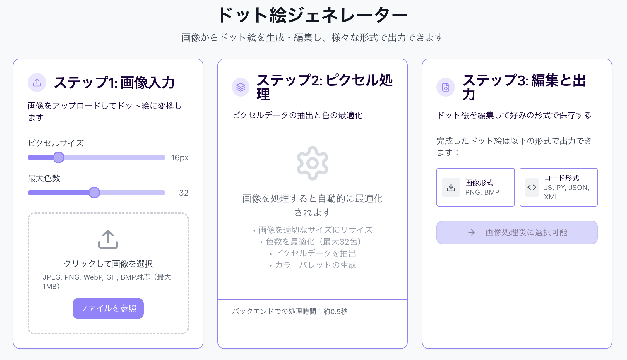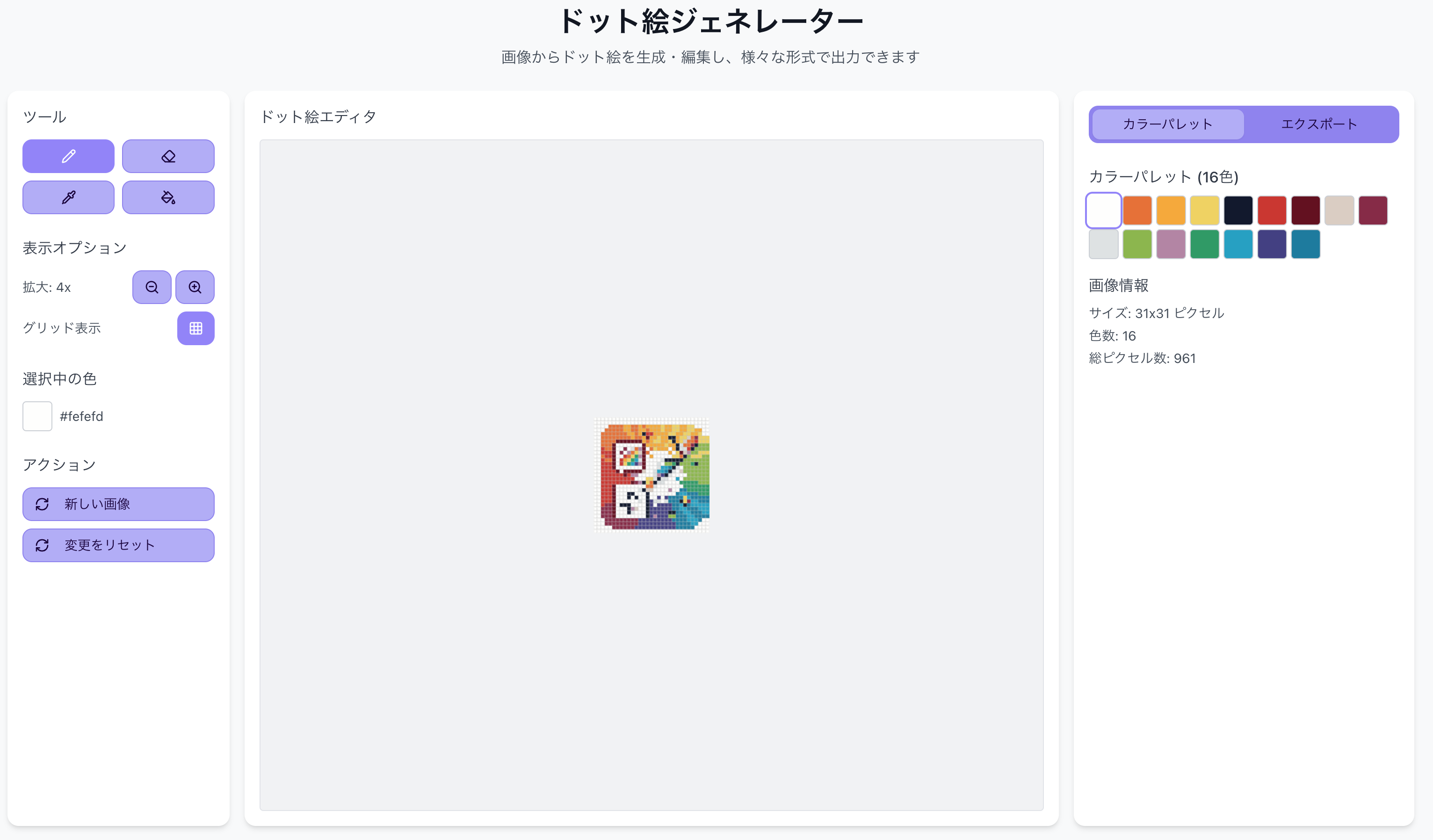 写真や画像をアップロードするだけで、瞬時にピクセルアートに変換!自動生成されたドット絵を画像やコードとして簡単にエクスポートでき、編集ツールで更なるカスタマイズも可能。クリエイティブな可能性が広がる、便利で強力なツールです。出力コードをAIに投げれば、すぐに画像に変換も可能です。
