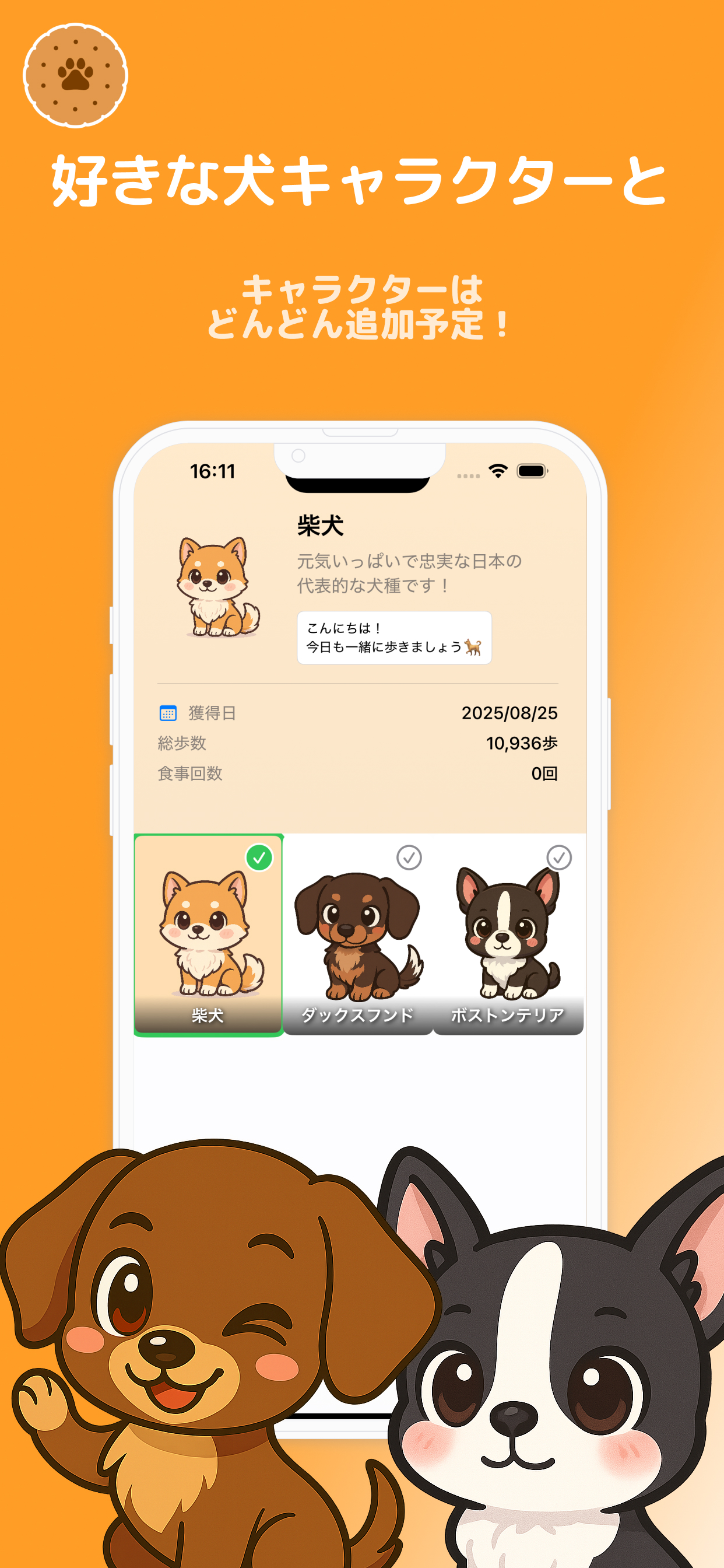 1日8,000歩以上歩くと色々な病気の予防に繋がるんだ!ということ知って良さそうな歩数管理アプリは入れたものの、気がついたらアプリを開くことすら忘れていた...🫠 そんな方も多いハズ! 本当に必要なのは習慣化のロジックや、豪華な統計グラフではなくて、パッとアプリを開くためのモチベーションと、歩くことによってそれがもっと楽しくなるイベントを実装したアプリがあればいいのに...🤔 そんな想いからゲーミフィケーションに特化した歩数管理アプリを開発しています🐶🔥 🕹️MVPで開発を予定している主要機能 🐾 毎日の歩数を記録、把握可能 🎯 デイリーミッションで目標達成をサポート! 🔥 目標歩数の連続達成記録を確認 🐶 好きな犬キャラクターを選べる(今後増えます!) 🎁 デイリーミッションを達成すると、キャラクターに食事をあげられる! 💬 犬からの健康に関する豆知識が聞ける 🤖将来機能(予定) 📊 過去の歩数について平均、最大、最小を確認可能 ⌚ AppleWatchアプリ、コンプリケーションにも対応予定 🏈 食事以外にも犬キャラとのコミュニケーション 🐶 愛犬が可愛いキャラクターに?!