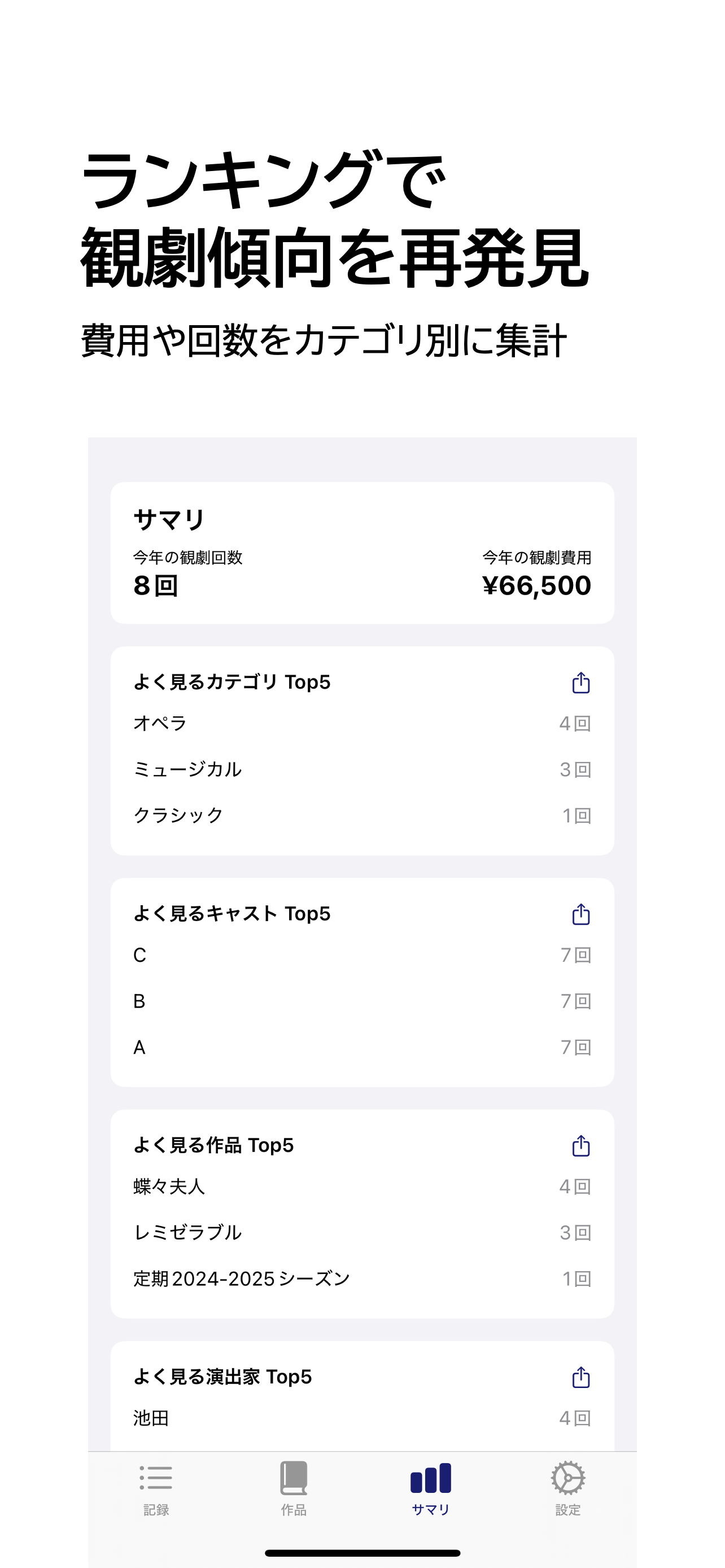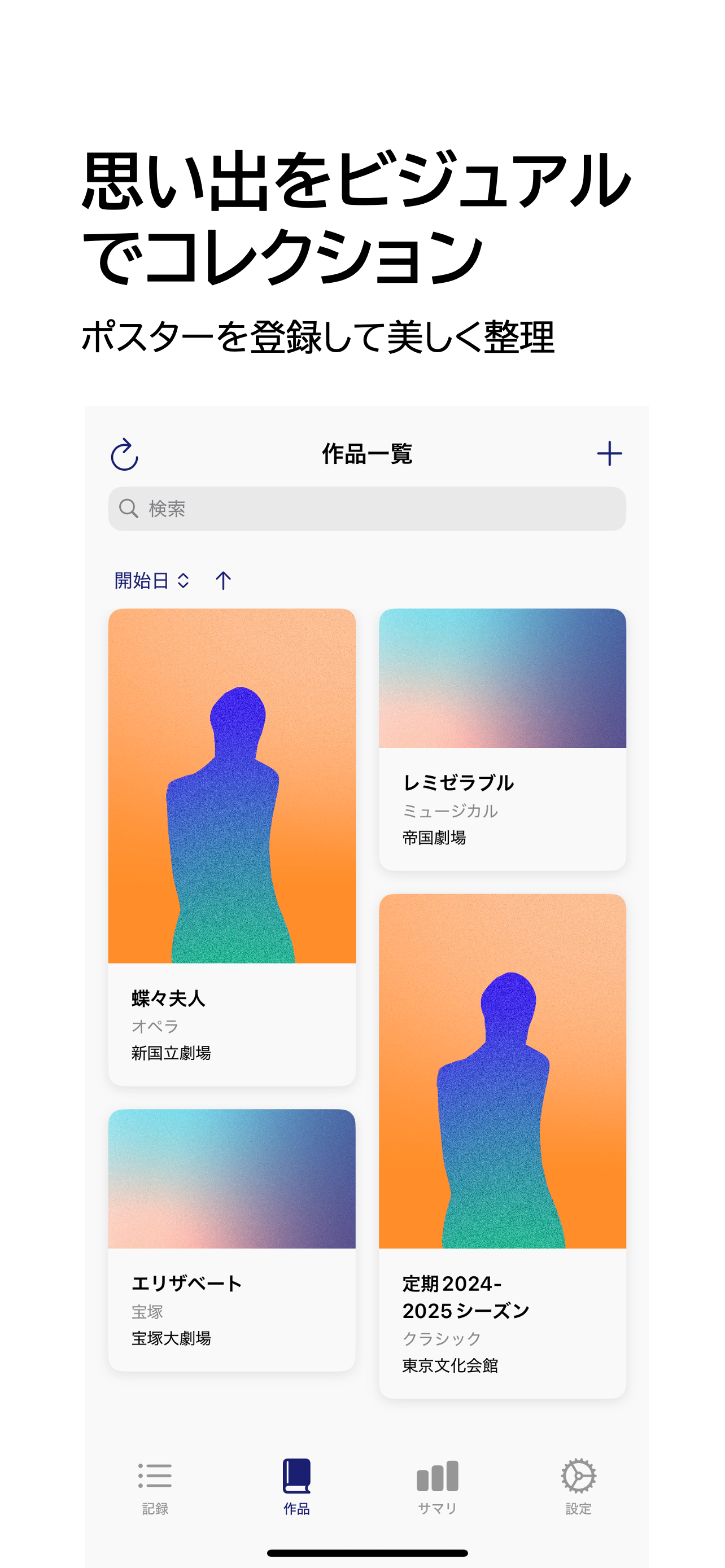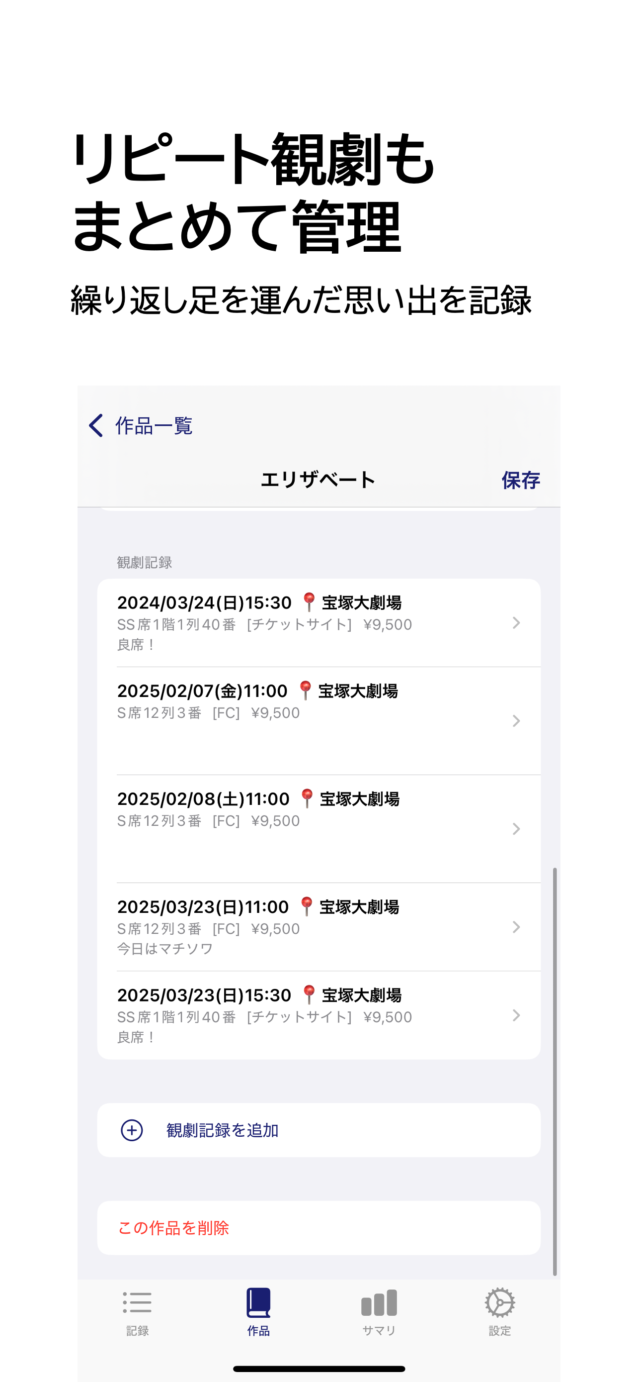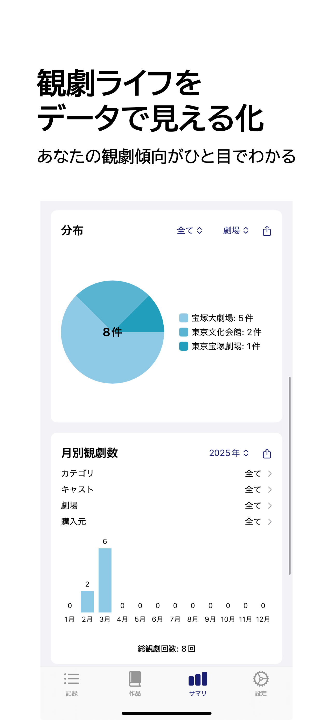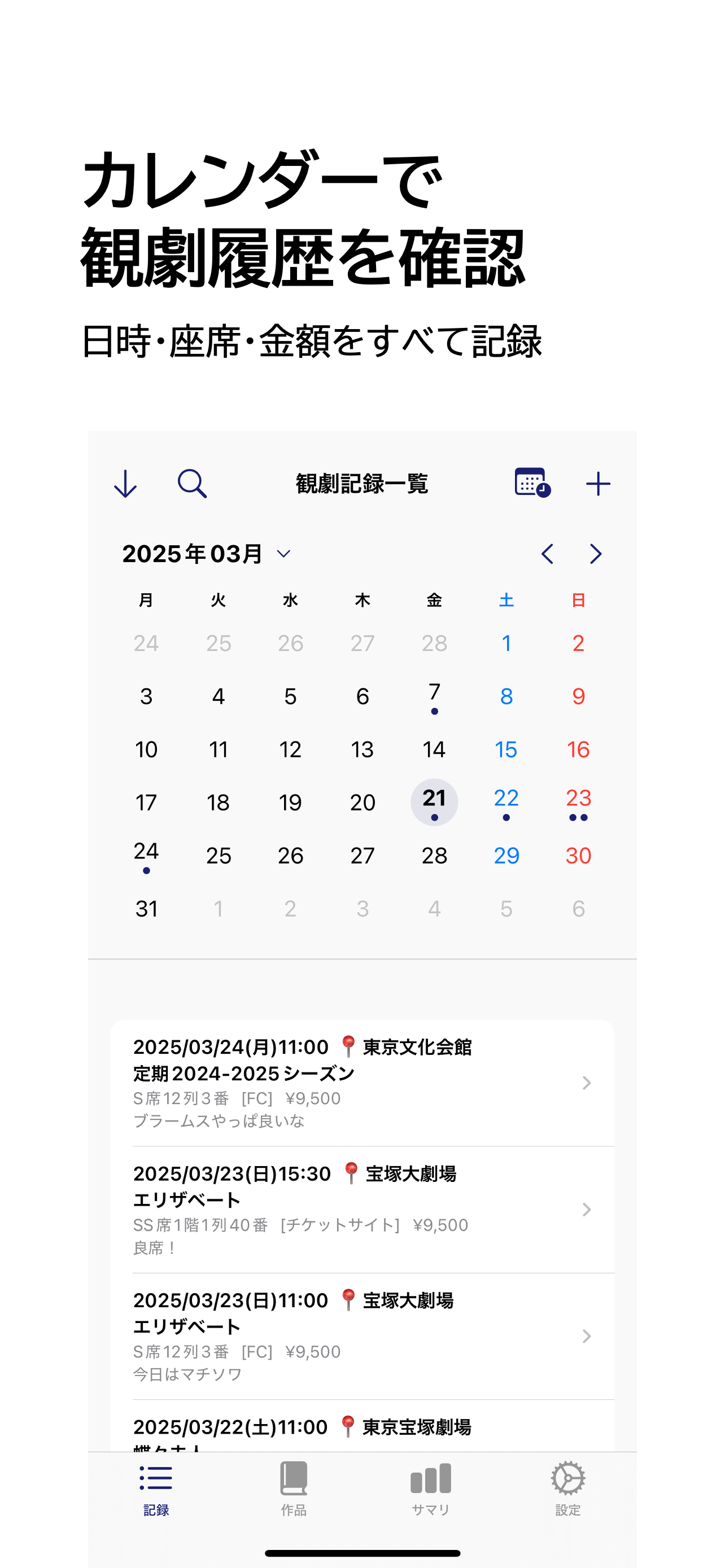 🎭観劇記録専用アプリ🎭 観劇やライブの記録を簡単に整理・分析できるiOSアプリです。 ✅カレンダーでマチソワした日を確認 ✅作品ごとに観劇記録を整理 ✅今月何を何回見た?を可視化 ◆ 主な機能 ◆ 【作品情報管理】 • タイトル、上演期間、演出家、出演者など詳細情報を記録 • 舞台写真やポスター画像を保存 • 宝塚、劇団四季、ミュージカルなどカテゴリ別に整理 • 舞台に限らず、映画、ライブ、お笑いなどの記録にも。 【観劇記録管理】 • 観劇日、劇場、座席、チケット価格などを記録 • 同じ作品の複数回観劇の記録にも対応 • メモ機能で思い出をより鮮明に 【統計・分析】 • 月別・年別の観劇回数や費用をグラフで可視化 • お気に入りの劇場や劇団の傾向を分析 • カテゴリ別の観劇分布を確認 【検索・フィルター】 • 作品名、劇場、出演者など様々な条件で検索 • 期間やカテゴリでのフィルタリング • タグ付けによる柔軟な分類 【多目的利用】 • 演劇・ミュージカルだけでなく、映画鑑賞やアイドルライブ、コンサート、スポーツ観戦など様々なイベント記録にも活用可能 • カスタムカテゴリで自分好みの分類が可能 • あらゆるエンターテイメント体験を一元管理