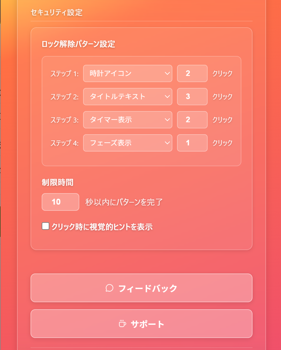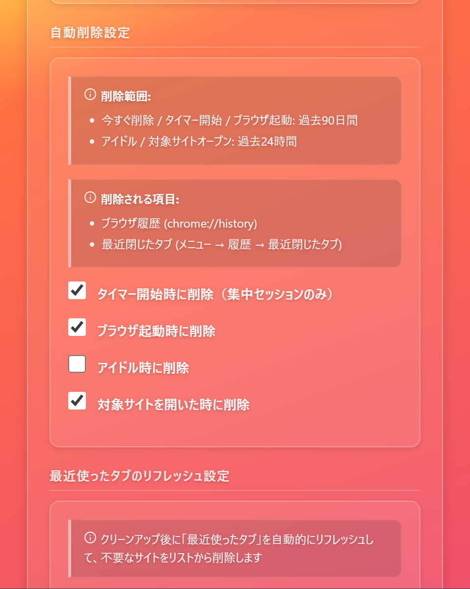 スマート削除をポモドーロタイマーとしてカモフラージュ。悟られずに履歴を理想の形へ。 ―――――――――――――――――― 集中とプライバシー、どちらも大事にしたい人へ ―――――――――――――――――― 発表や会議の画面共有、家族や恋人とのPC共有など、 「履歴を全部消すのは不自然。でも一部だけは見せたくない」—そんなときに役立つのが CleanFocus です。 CleanFocus は、普段は“しっかり使えるポモドーロタイマー”として集中を支えつつ、必要なときだけ 気になる履歴を選んで整理できます。 ―――――――――――――――――― こんなときにおすすめ ―――――――――――――――――― ・学校や社内の発表で 画面投影・画面共有 をする前に整えておきたい ・共有PCで プライバシーを守りたい ・履歴ゼロは避けたいけど、見られたくない履歴だけ を消したい ―――――――――――――――――― できること ―――――――――――――――――― 【🧩 履歴削除機能が目立たないための工夫】 ・履歴整理の「🔒 詳細設定」は、うっかり見られたり開いてしまわないように、タイマー画面のアイコンを決められた順序で押したときだけ開く仕様です。 【🕒 ポモドーロタイマー(“ちゃんと使える”集中機能)】 「隠すため」だけじゃなく、集中ツールとしてもきちんと作り込んでいます。 ・作業/休憩時間のカスタマイズ ・通知 ・今日のセッション数・作業時間の表示 【🧹 スマート履歴削除】 ・キーワード/URL を登録して、該当する履歴だけを削除 ・「今すぐ整理(Clear Now)」で手動実行 ・最近閉じたタブ も整理できます(見られやすい場所をスッキリ) 【⏱️ 自動で整理(タイミングを選べます)】 「毎回忘れそう…」でも大丈夫。次のタイミングで自動実行できます(ON/OFF可): ・フォーカス開始時 ・ブラウザ起動時 ・アイドル/ロック時 ・対象サイトを開いたとき 【✍️ 登録がラクで続けやすい】 ・現在のタブから URLをクイック追加 ・コピーした文字から キーワードをクイック追加 ・インポート/エクスポート(JSON)で移行も簡単 ・420,000件のあやしいサイトを網羅した外部ドメインリストを利用することで、履歴を網羅的に削除! ―――――――――――――――――― 🔐 プライバシー / セキュリティ ―――――――――――――――――― ・設定やルールは ローカル(chrome.storage.local)に保存 ・アカウント登録不要 ・余計な通信を前提にしない設計