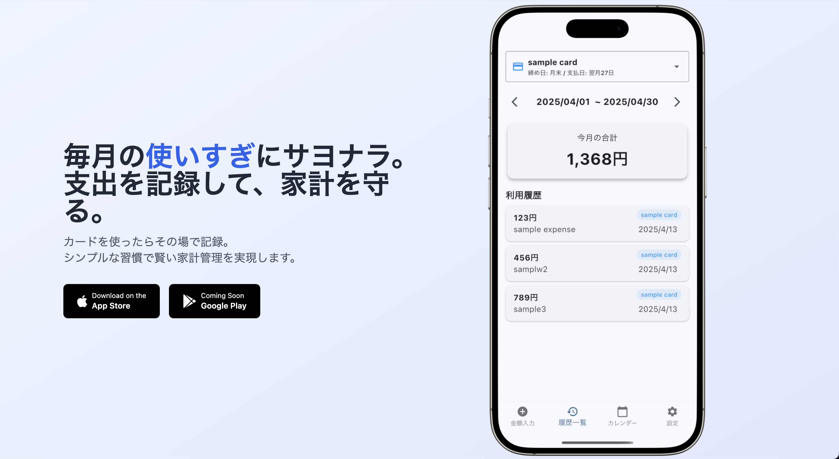毎月の使いすぎにサヨナラ。 支出を記録して、家計を守る。