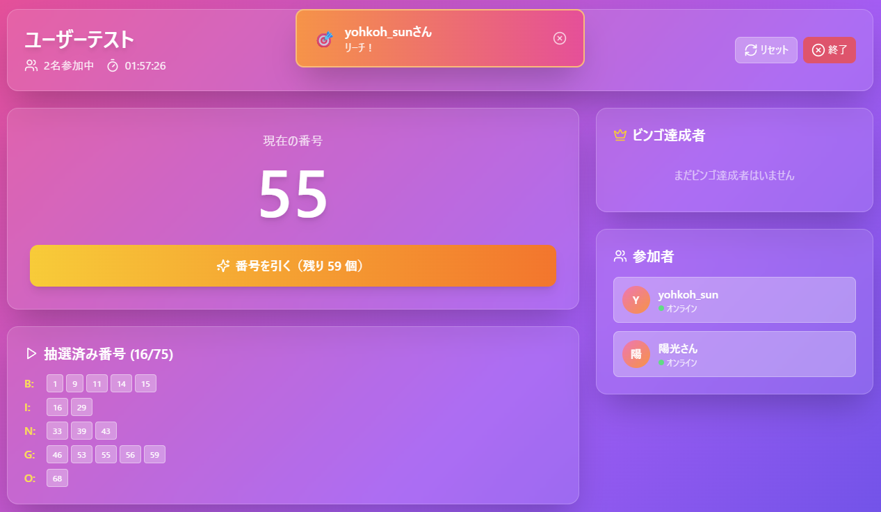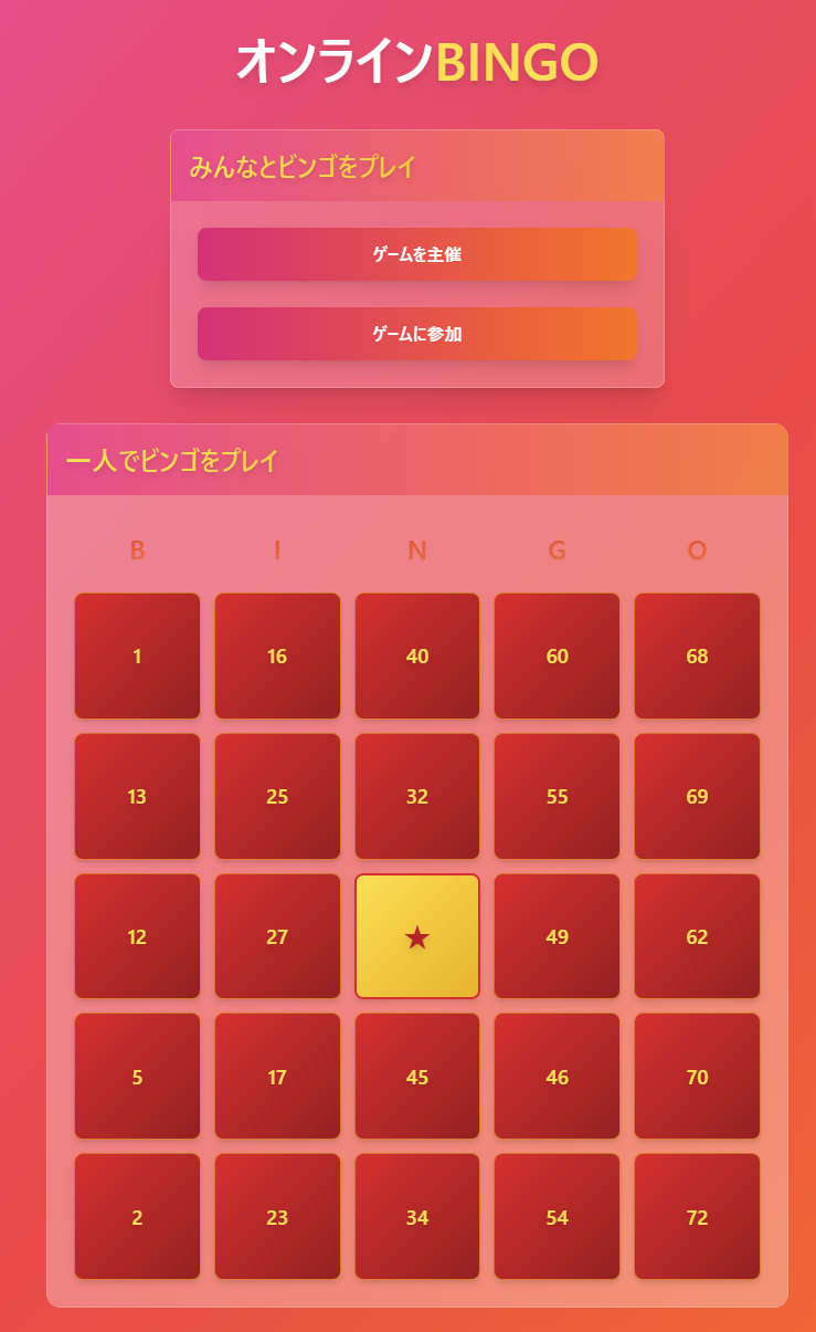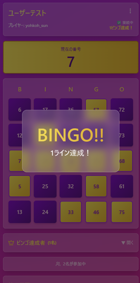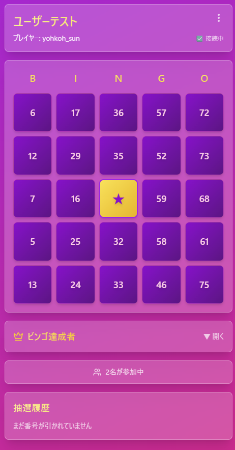 大会ホストから発行されるQRコードかURLで参加できる。もちろんIDの手動入力でも参加可能。 自動的に番号を抽選するのでビンゴの数字を自分の手で空ける楽しみはない。 しかし、番号の復唱をすることなくスムーズにビンゴを進められる。 会社の忘年会で動作確認済み。同じ名前の人がいたら連番を振るようになっている。 DBの圧迫を抑えるため、ゲーム開始から2時間でゲームデータが強制的に消える。 収益性皆無だが、せっかく作ったのでこの場で公開する。