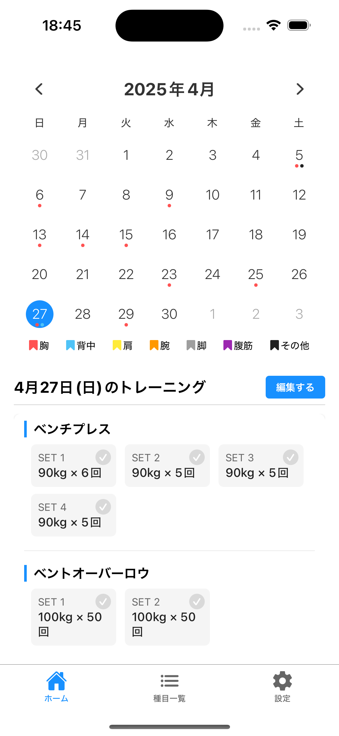 このアプリは、日々の筋トレの内容(種目、重量、回数、セット数)を手軽に記録し、管理するためのアプリです。 主な機能は以下の通りです。 ・トレーニングの計画と記録: カレンダーでトレーニング履歴を確認しながら、その日のトレーニング内容を計画・記録できます。セット間の休憩タイマーも利用可能です。 ・トレーニング種目の管理: よく使うトレーニング種目をマスタとして管理し、簡単に追加・編集できます。 今後のアップデート 成長の可視化: 記録したデータをもとに、種目やカテゴリごとに重量や回数の推移をグラフで確認でき、自身の成長を視覚的に把握できるようにしていきたいです。