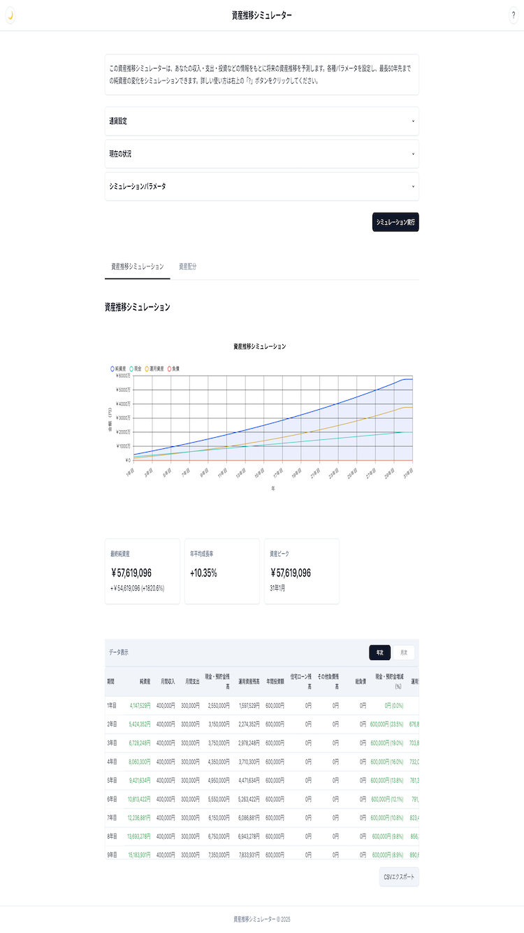 収入・支出・投資・負債などの情報から将来の純資産推移を予測する資産推移シミュレーターです。最長50年先までのシミュレーションが可能で、複数通貨対応、運用利回りなど様々なパラメータを考慮できます。 現在の資産状況から将来の資産状況を概算で把握することで、家計改善、投資戦略の調整、ライフプランニングなどに活用できます。