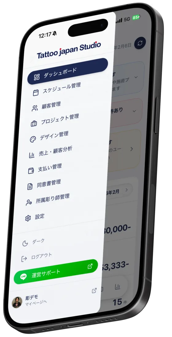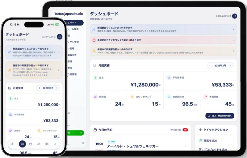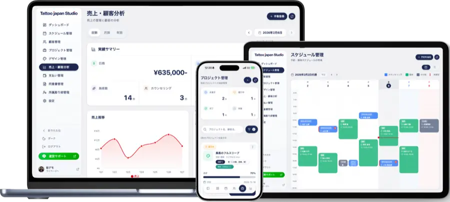 【背景 ― なぜこのサービスが生まれたのか】 日本の彫師・タトゥーアーティストは、本来の創作活動以外に、膨大な事務作業を抱えています。紙のカルテやスマホの写真フォルダに散らばった顧客情報、LINE・DM・電話と複数の窓口に分散した予約管理、月末になると時間を奪われる売上計算と未払いチェック、来店ごとに用意する同意書――。「絵を描き、彫る」というクリエイティブな仕事に集中したくても、実際の業務時間の多くは事務処理に費やされているのが現状です。 一方で、市販のCRMやサロン向け予約ツールは、タトゥー業務の実態に合っていません。施術部位を人体図で記録する、背中一面のような長期作品の進捗と残額を追う、彫師ごとに売上を分けて管理する――こうした業界特有の業務に対応した機能がないからです。海外には専用ツールも存在しますが、料金は高額で、日本語にも対応していません。 Tattoo Japan Studioは、この空白を埋めるために生まれた、タトゥー業界専用のクラウド型業務管理システムです。日本最大級のタトゥーOK施設共有サービス「Tattoo Japan」を運営する中で現場の彫師から繰り返し聞いてきた声をもとに、業界を熟知した彫師の監修を受けながら設計されています。 ──────────────────── 【サービス概要】 Tattoo Japan Studioは、スタジオ運営に必要な事務作業をひとつのシステムに集約するオールインワンの業務管理アプリです。顧客情報、カルテ、予約スケジュール、施術記録、同意書、売上分析までを横断的に扱え、PC・スマートフォン・タブレット(iPad推奨)のブラウザから利用できます。データはクラウド上でリアルタイムに同期されるため、自宅のPCで予定を確認し、スタジオのiPadでカルテを更新し、移動中にスマホで予約を捌く――といった使い方が自然にできます。 通信はSSL/TLSで暗号化され、毎日のクラウド自動バックアップ、オーナーと所属彫師を分離するアクセス権限管理、個人情報保護法に準拠したデータ管理体制により、顧客情報を安全に守る仕組みを備えています。 ──────────────────── 【できること】 ■ 顧客管理・タトゥーカルテ 来店した顧客の基本情報、連絡先、アレルギー・既往歴、過去の施術写真、デザインの好みなどを一元管理できます。名前検索ですぐに過去の履歴を呼び出せるため、「あの人、前回どこに何を彫ったっけ?」と紙やスマホを探し回る時間がなくなります。施術部位は人体図上に記録でき、どこに何が入っているかを視覚的に把握可能です。 顧客登録は彫師が手入力する必要がなく、QRコードや登録URLを発行して顧客自身のスマホから入力してもらう運用にも対応しています。 ■ 予約・スケジュール管理 カウンセリングと施術の予約を、彫師ごとのカレンダーで一元管理。複数の窓口(DM・LINE・電話)から入った予約をシステム上に集約することで、ダブルブッキングや返信漏れを防ぎます。リマインドの自動送信機能により、無断キャンセルの削減にも寄与します。既存の予約方法(LINE/DM/別ツール)と併用しながら使うことも可能です。 ■ 施術管理 1回で完結する施術はもちろん、背中一面や袖といった長期作品の進捗管理に強みがあります。総額に対する入金額・残額、施術回数、進捗率を自動で可視化できるため、長期顧客との金銭・スケジュールのやりとりが透明になります。 ■ 同意書・リスク管理 顧客ごとの同意書を電子的に管理。来店ごとに紙を用意し、保管場所に困る、という運用から解放されます。さらに、ドタキャン常習者やトラブル顧客の情報をスタジオ内で共有できるインシデント管理機能もあり、未然のトラブル回避に役立ちます。 ■ 売上・顧客分析 日々の施術登録を入力していくだけで、日商・月商・年商が自動集計され、月末の締め作業がほぼ不要になります。顧客の来店頻度、リピート率、客単価といった顧客分析もダッシュボードで確認でき、経営判断に使えるデータが日常業務の中から自然に蓄積されます。 スタジオプランで運用する場合は、所属彫師ごとの売上もオーナー側でまとめて把握でき、スタジオ全体の経営管理が完結します。 ■ デザイン管理・ポートフォリオ 過去のデザイン案や完成写真をクラウド上で整理。顧客への提案や、SNS運用時のアーカイブ参照もスムーズになります。 ──────────────────── 【サービスが目指す方向性】 Tattoo Japan Studioは、単なる業務効率化ツールではなく、タトゥー業界全体のインフラを志向しています。彫師が事務作業から解放されて創作に集中できる環境、顧客のプライバシーが安全に守られる環境、そしてスタジオ運営がよりクリーンでオープンになっていく環境――。これらを現場の彫師とともに育てていくことが、サービスの根本にある考え方です。