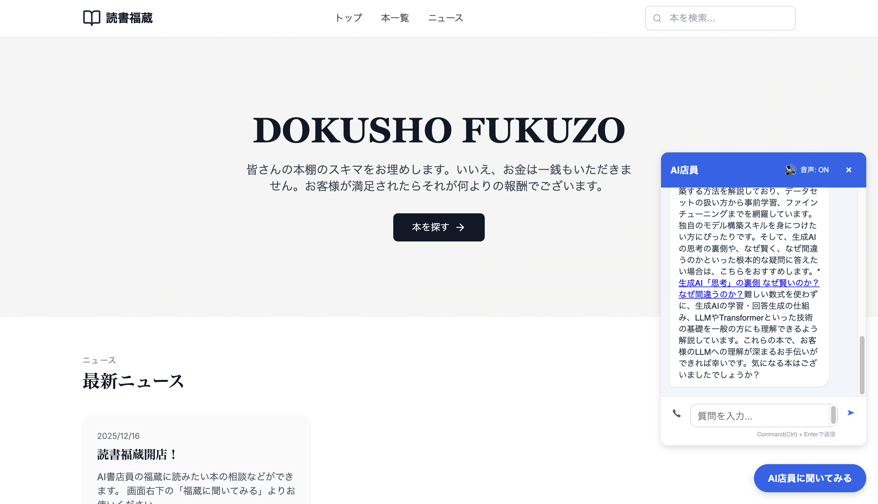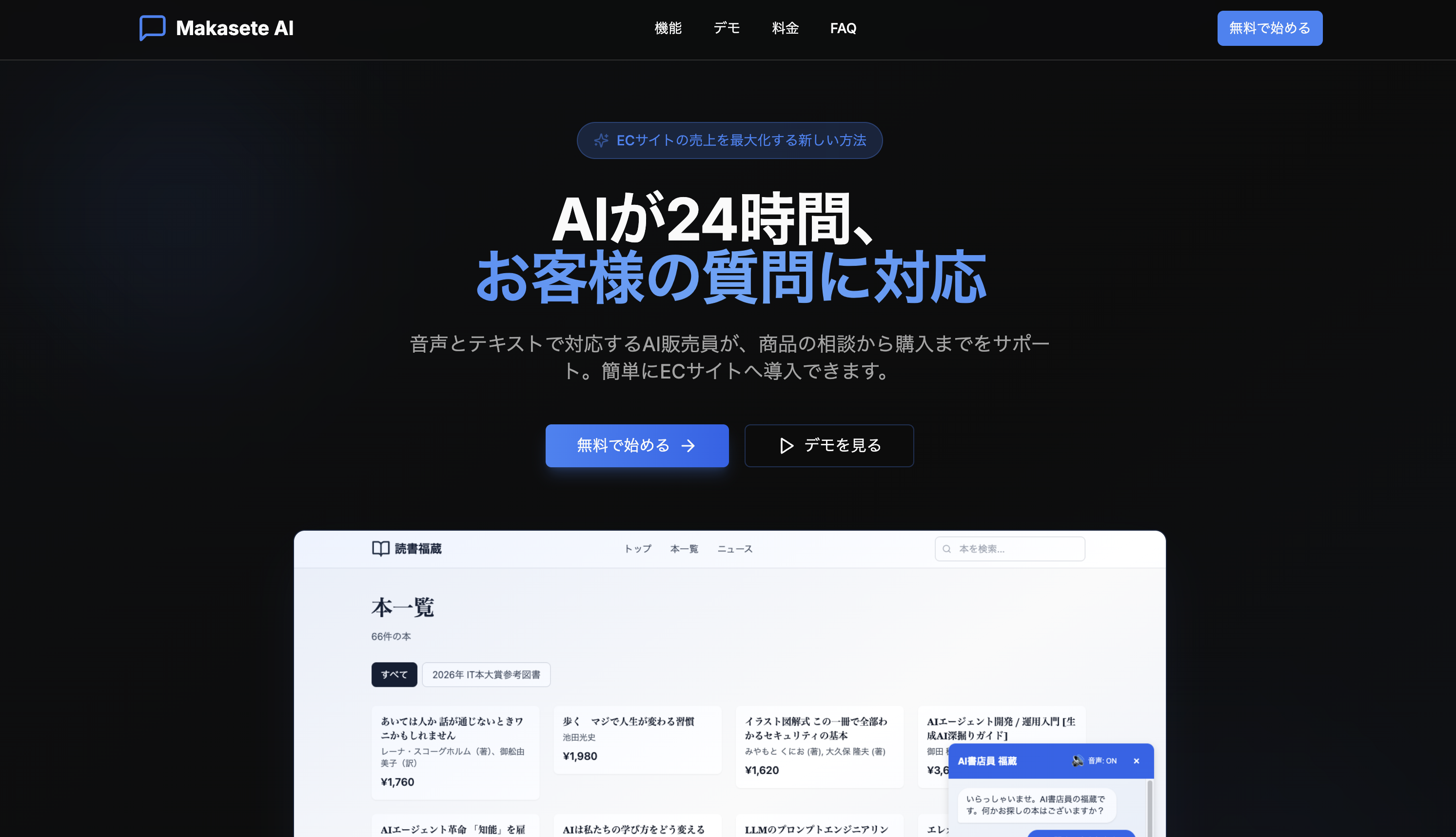 Makasete AIは、音声とテキストで対応するAI店員が、商品の相談から購入までをサポートできるチャットボットです。 商品管理、よくある質問の管理はスプレッドシートで完結します。 まずはデモサイトをどうぞ! 👉 https://makasete-ai.nisyuu.com/dokusho-fukuzo ✨ 主な特徴 スクリプト1行の簡単導入: チャットボット構築後に発行されるスクリプトを、HTMLに1行追加するだけで、既存サイトのデザインを崩さずAIチャットボットを設置可能。 音声・テキストのハイブリッド対応: テキストだけでなく音声入力・音声回答にも対応。実店舗で店員と話すような直感的な購買体験を提供します。 スプレッドシート連携でデータ管理: AIが学習する商品情報はGoogleスプレッドシートで管理。エンジニアでなくても、エクセル感覚で即座に情報の更新が可能です。 あらゆる商品に対応: ファッション、家電、食品、雑貨、SaaSなど、どんな商品カテゴリーにも対応可能です。 オープンソースの提供: 開発者向けにGitHubでソースを公開しており、自ら構築・カスタマイズして無料で始めることも可能です。 📈 導入で得られる効果 問い合わせ対応時間を大幅削減: よくある質問にAIが自動で回答。スタッフは複雑な案件に集中できます。 コンバージョン率の向上: 疑問をその場で解決することで、カゴ落ちを防ぎ購入率が向上します。 人件費を大幅にカット: 24時間対応でも追加の人員は不要。コストを抑えながらサービス向上。 顧客満足度の向上: 即座に回答が得られることで、お客様の満足度が大きく向上します。 🚀 このプロダクトへの想い 「優れた商品を持つ全ての人が、接客の差で機会損失をしない世界を作りたい」 Makasete AIは、最先端のAI技術を誰もが手軽に扱えるインターフェースに落とし込むことで、コンバージョン率向上と運営者の負担軽減を同時に実現します。