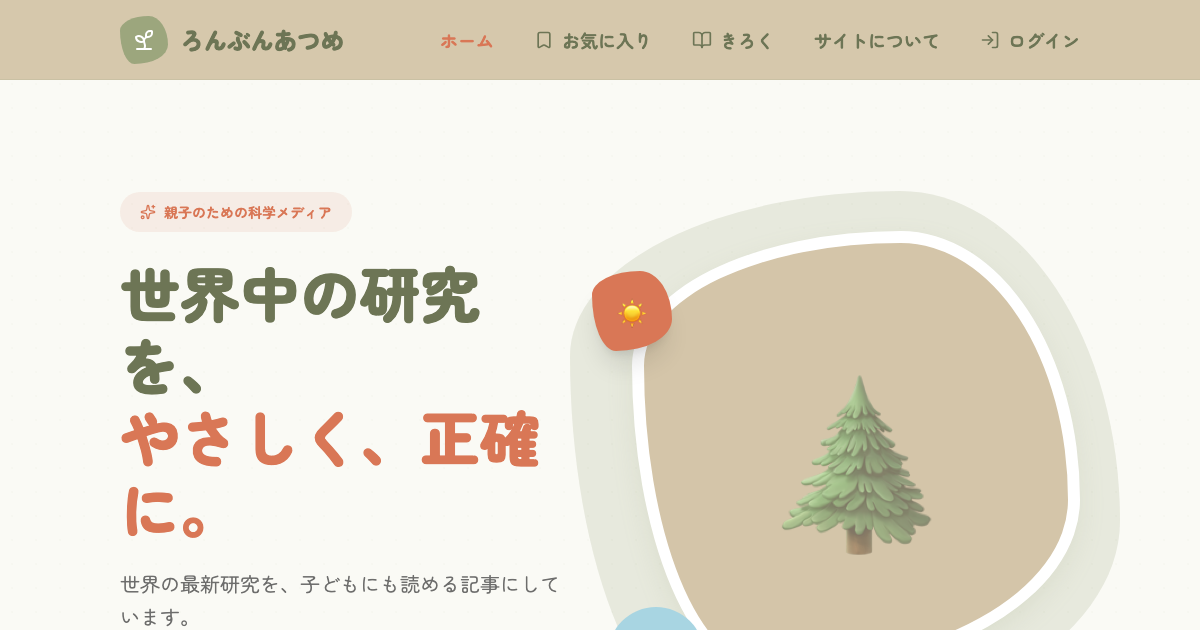 世界中の大学や研究機関が発表する最新の科学論文を、子どもにも読めるやさしい日本語に変換して毎日お届けするWebメディアです。 AIが論文の要点を抽出し、ふりがな付きの記事を自動生成。1記事3分で読め、出典元の論文へのリンクも掲載しているため、興味を持ったテーマをさらに深掘りできます。お気に入り機能や閲覧履歴で、お子さんの興味の傾向も把握できます。