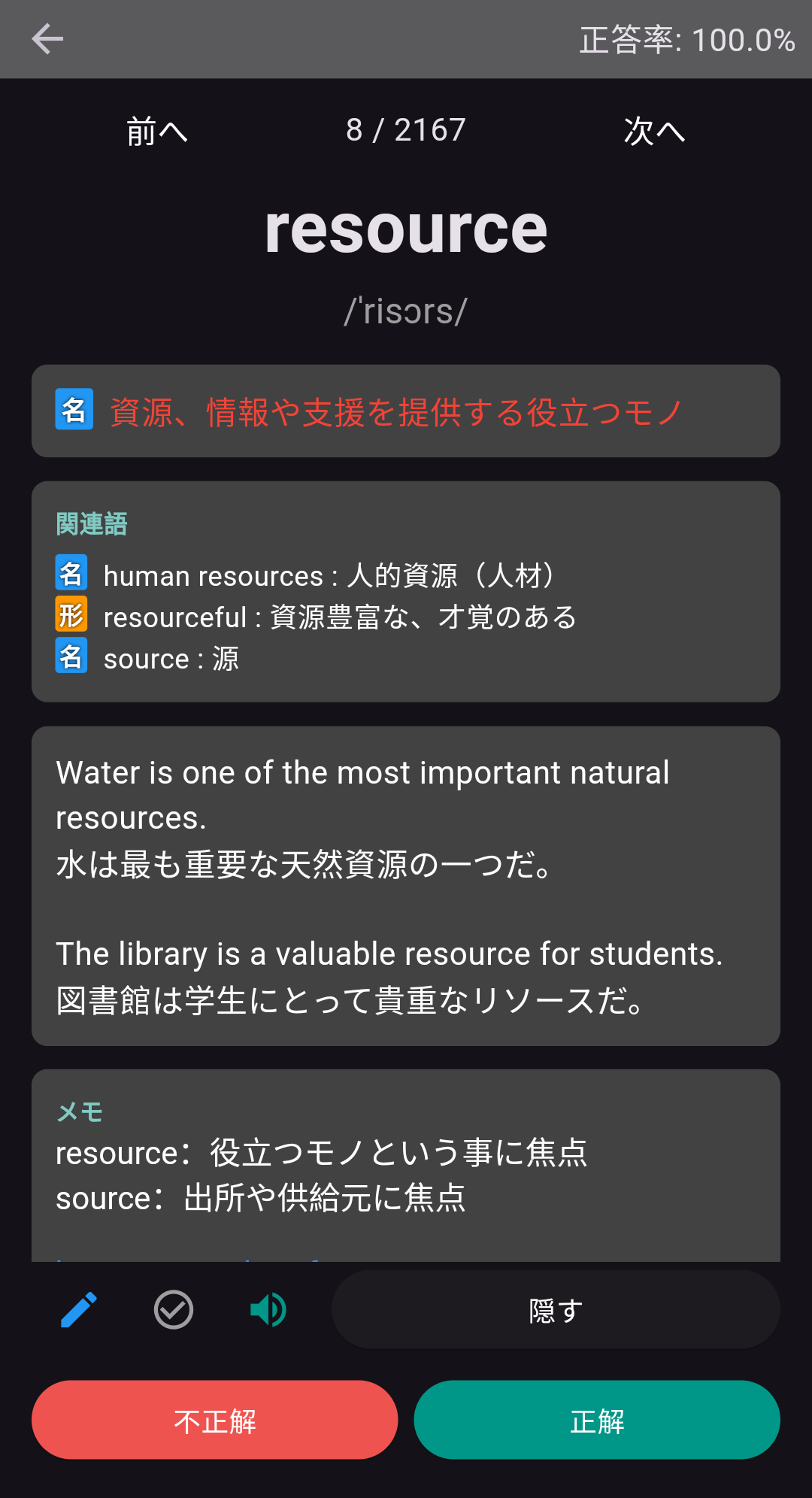 TOEFL・大学受験・日常英会話・留学などに役立つ約2200語の重要英単語・熟語+派生語を収録した単語帳アプリです。