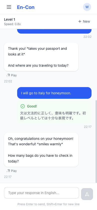 普段英語を使いたいけど使う場面がない。 ChatGPTなどの生成AIと英語で会話しているけど、自分の英語が合っているのか確認しながら練習したい。 そんな人向けのAIとの英会話練習用ツールです。 単にAIと英会話できるだけでなく、自分の入力した英文をAIが即時フィードバックしてくれます。
