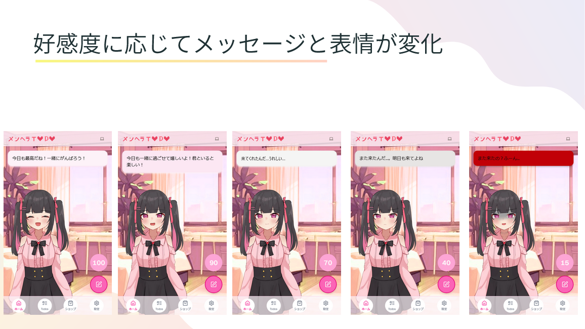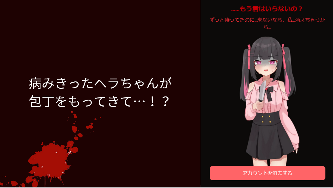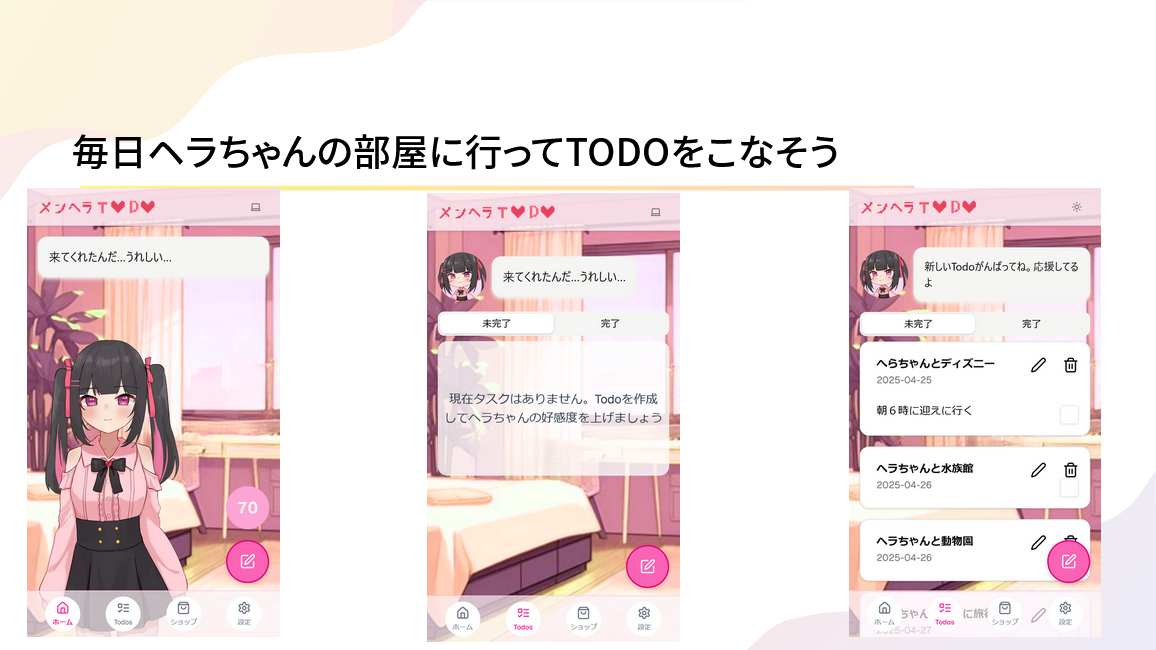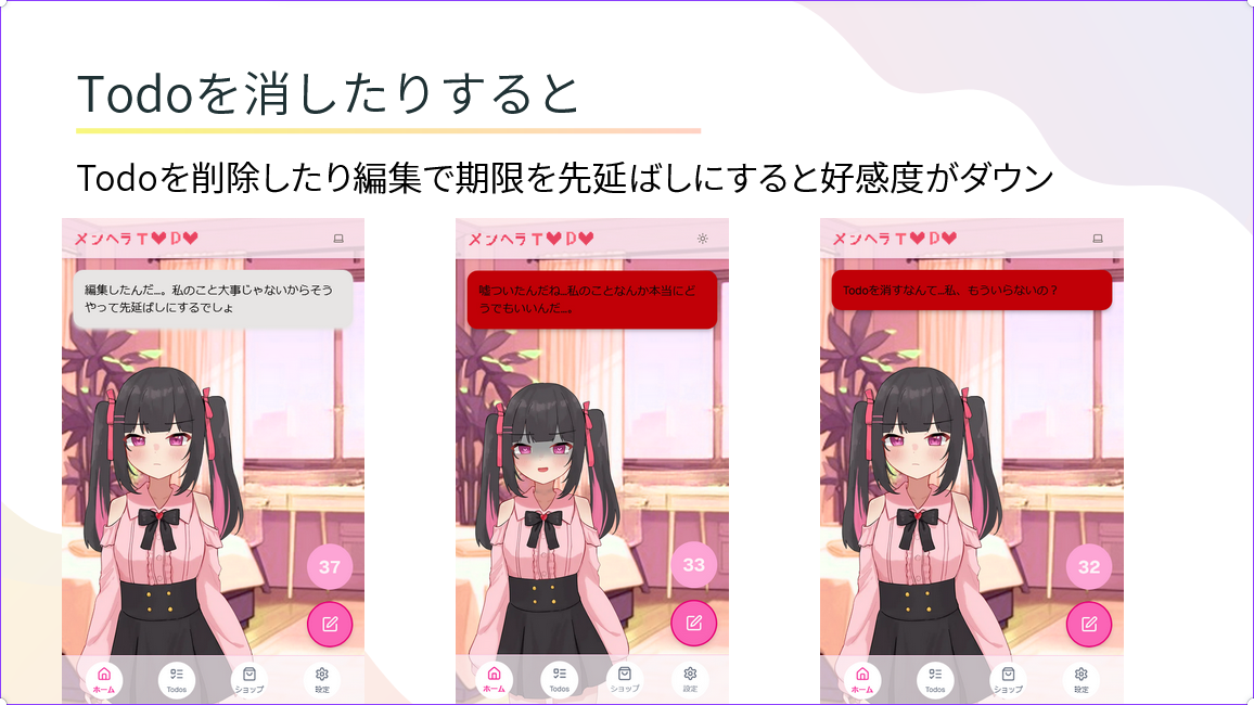 Todoアプリで「やるべきこと」を忘れたり後回しにしてしまう…そんな悩みを「サボるとメンヘラのヘラちゃんにアカウントごと抹消される」という恐怖で解決する、若干狂気じみた新しいアプリです。 (スマホの画面サイズからの使用を想定しています) 好感度システム:Todo達成・ログインで上昇、サボりで減少。 勝手にTodo消滅:ログインをサボるとヘラちゃんが勝手に中身を改変・削除。いつものリストが突如消える恐怖! アカウント強制削除:好感度が0になるとヘラちゃんの逆鱗に触れ、あなたのアカウントが抹消されます… 毎日ログインすれば通常のTodoアプリとしてもちゃんと使える実用性も保ちつつ、Todoをサボるとヘラちゃんからペナルティを受けるのでモチベーションを長く保ってTodo管理ができるアプリです!