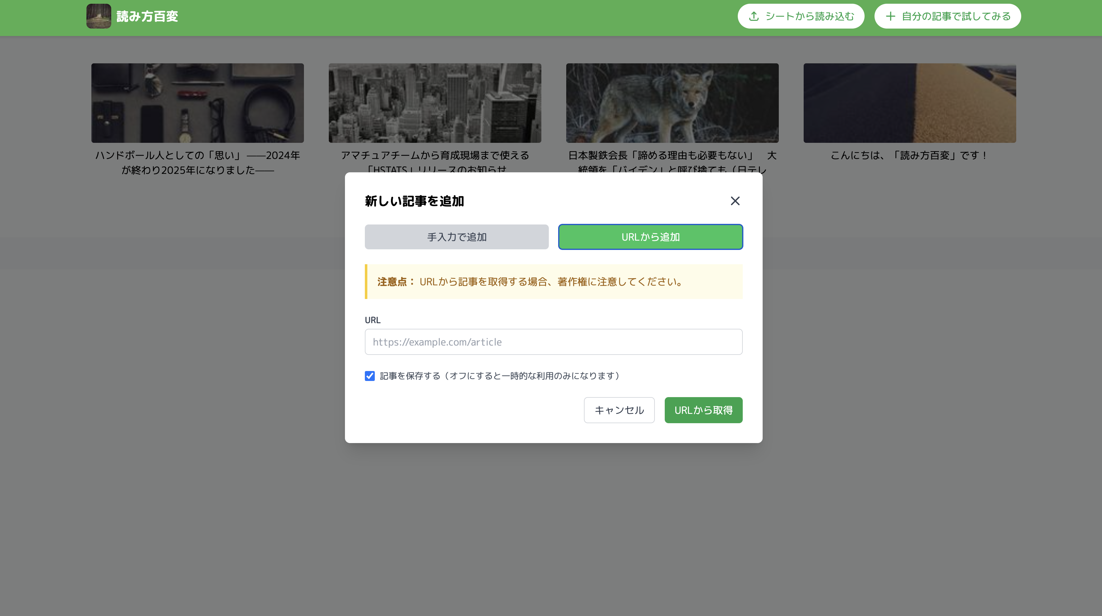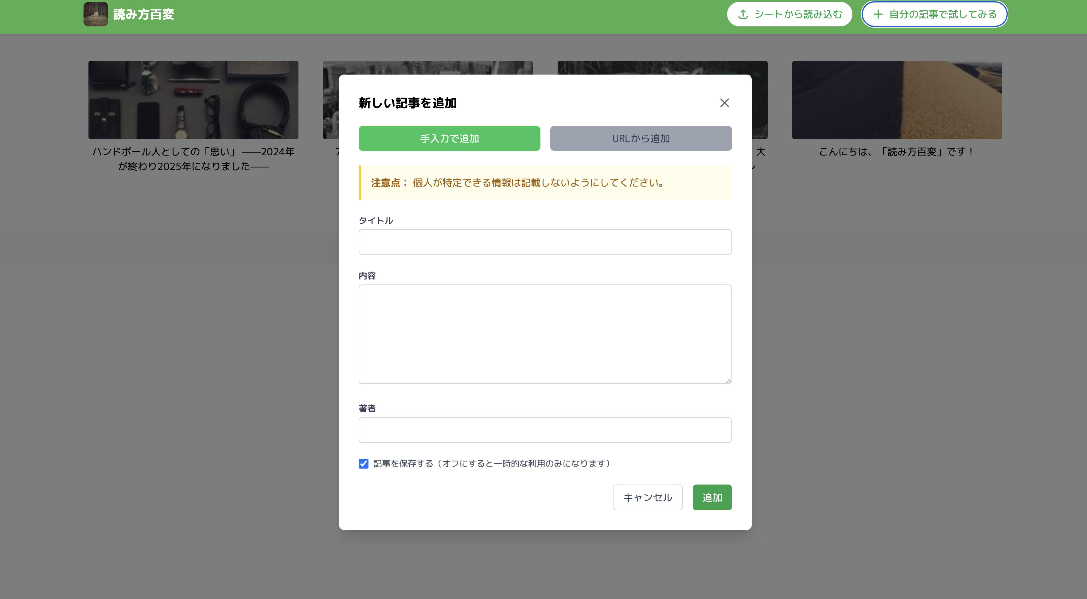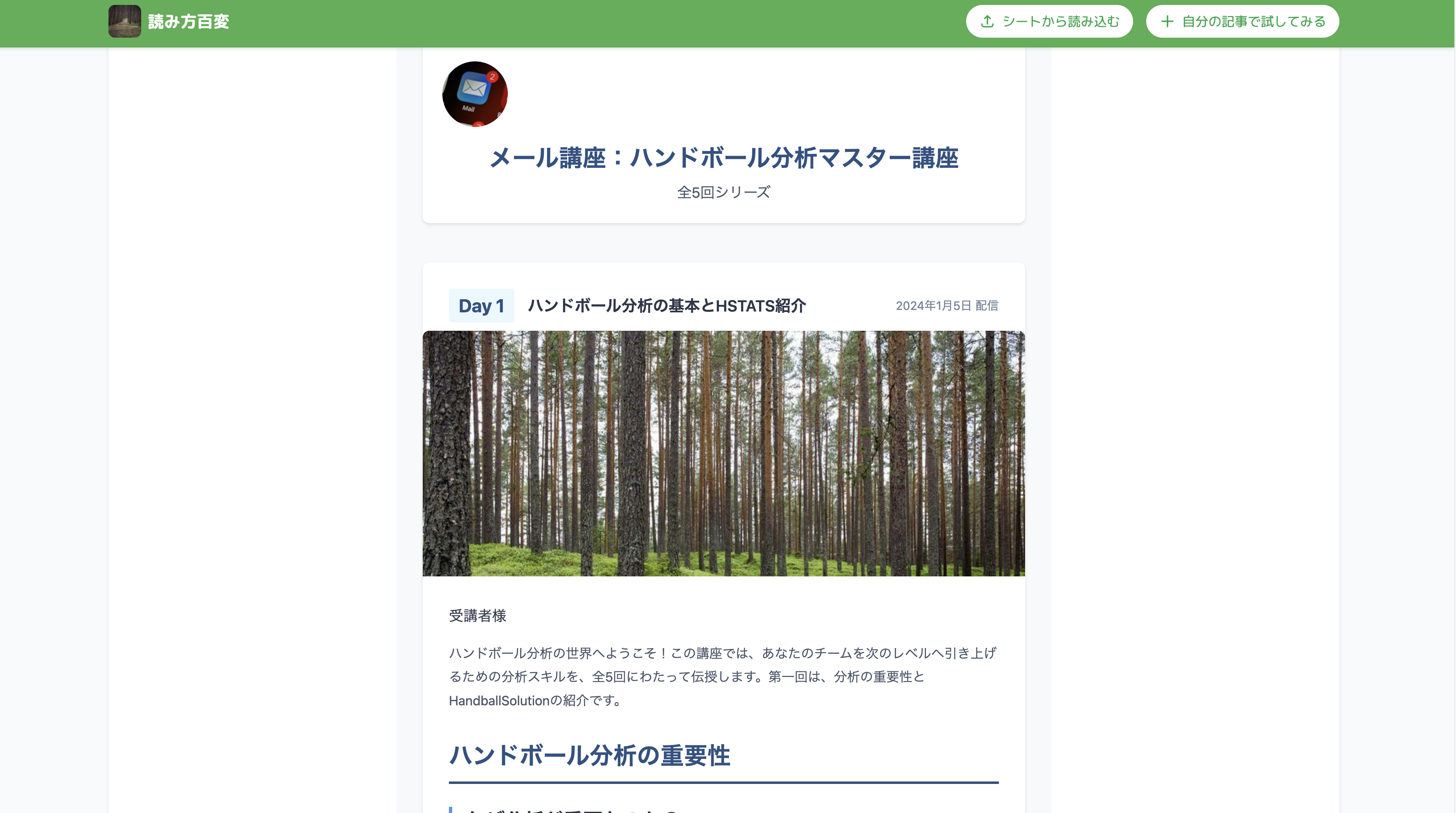 こんなときに「読み方百変」 • 新しい記事や情報をサクッといろんな形にしたい たとえばブログ向けのちょっと丁寧な文章にしてみたり、メールマガジン風にまとめてみたり。 すでに書いた文章をそのままペーストするだけで、あっという間に「別の文体」を試せます。 • ニュースをパパッと対話形式で理解したい 「この記事、対話形式にしたらわかりやすそうだな…」というときに、ワンクリックで変換できます。 気軽に質問と回答のやりとりっぽくなるので、頭にも入りやすい! • GitHubや新しいアプリの情報をザクッと読みたい 「プログラムのREADMEを軽くブログ風にして読みたい」とか、「ステップメール形式にして学びたい」とか、用途は自由自在。 実際にGitHubのURLを入れてみると、内容を引っ張ってきて変換に役立てたりもできるので、使い方はあなた次第! ・読み方百変で実現できること 1. 記事の表現力を無限に広げる - 同じ内容を様々な形式で表現し、より効果的に伝えることができます - 硬い文章を柔らかく、カジュアルな文章をビジネスライクに変換できます - 1つの記事から複数の用途の文章を生成できます 2. コンテンツ作成の時間を大幅に節約 - 異なる媒体用の記事を一から書き直す手間を省けます - プレゼン資料やレポートの下書きを自動で生成できます - 記事の要約やポイントの抽出を自動化できます 特に、以下のようなシーンで活用できると思います! - 文章作成時間の大幅な短縮 - 異なる媒体への展開の効率化 - アイデア出しやブレインストーミングの促進 人それぞれのアイデアや使い方で、より充実した記事や情報発信ができるようになります! ぜひいろいろ試して、面白い文章ライフを送ってみてくださいね!