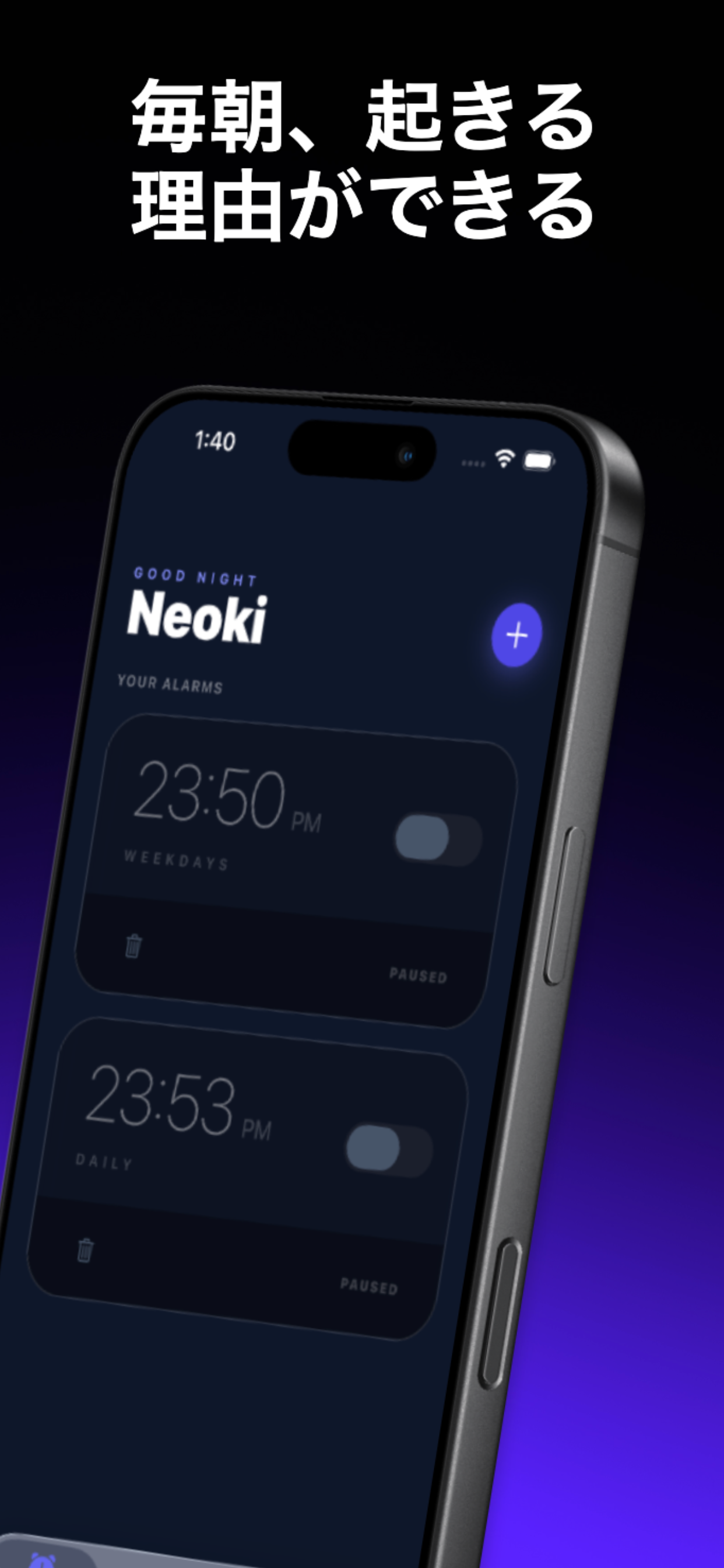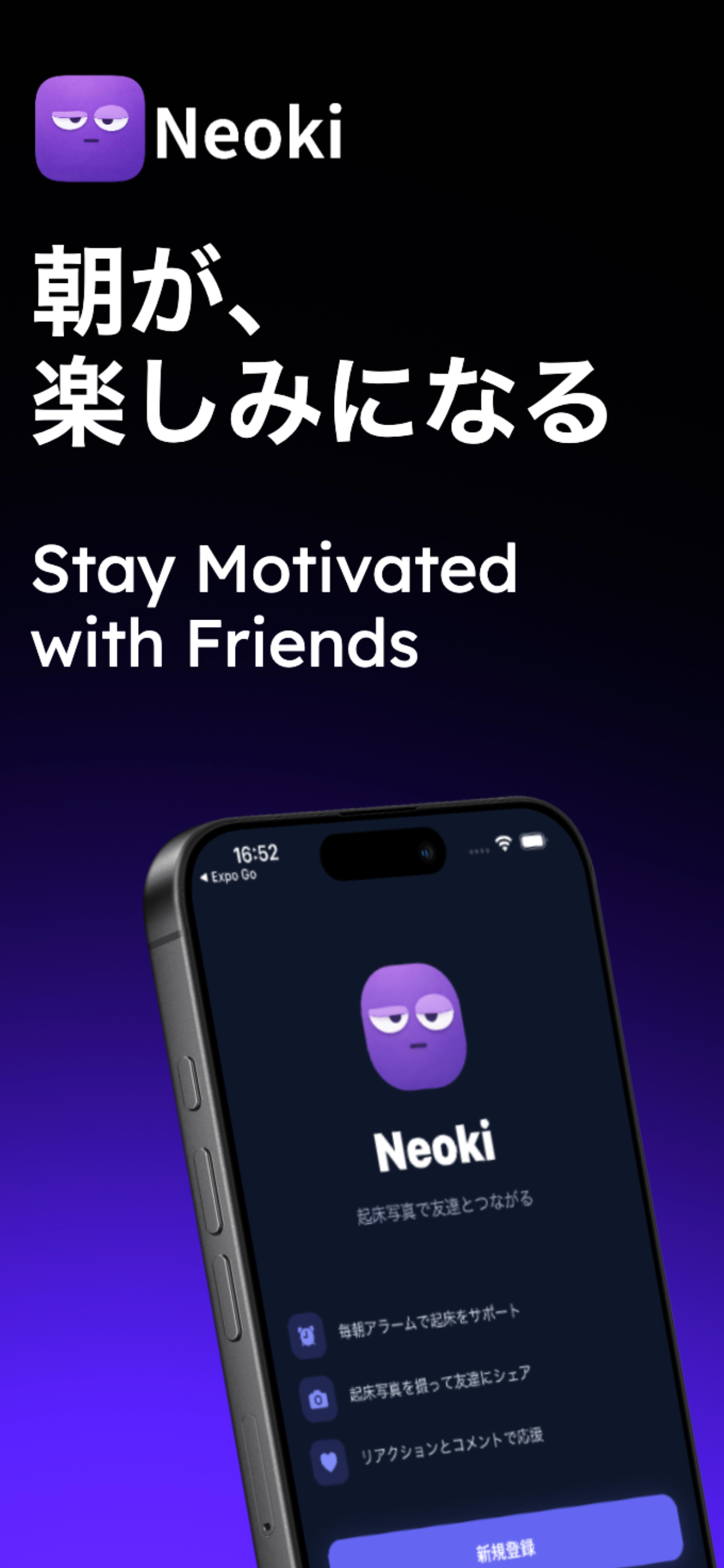 Neoki(ネオキ) は、アラーム × 写真シェア × ソーシャルを掛け合わせた早起き習慣アプリです。 アラームを止めたら起き抜けの写真を撮影し、友達のタイムライ ンにシェア。友達の「起きたよ!」投稿にリアクションやコメン トを送り合うことで、ひとりでは続かない早起きが自然と習慣に なります。 主な機能: - アラーム設定 - 起床写真の撮影・タイムラインへの自動共有 - 友達のフィードにリアクション・コメント - 睡眠ログ&就寝リマインダー(プレミアム) - iOS 26 AlarmKit 対応