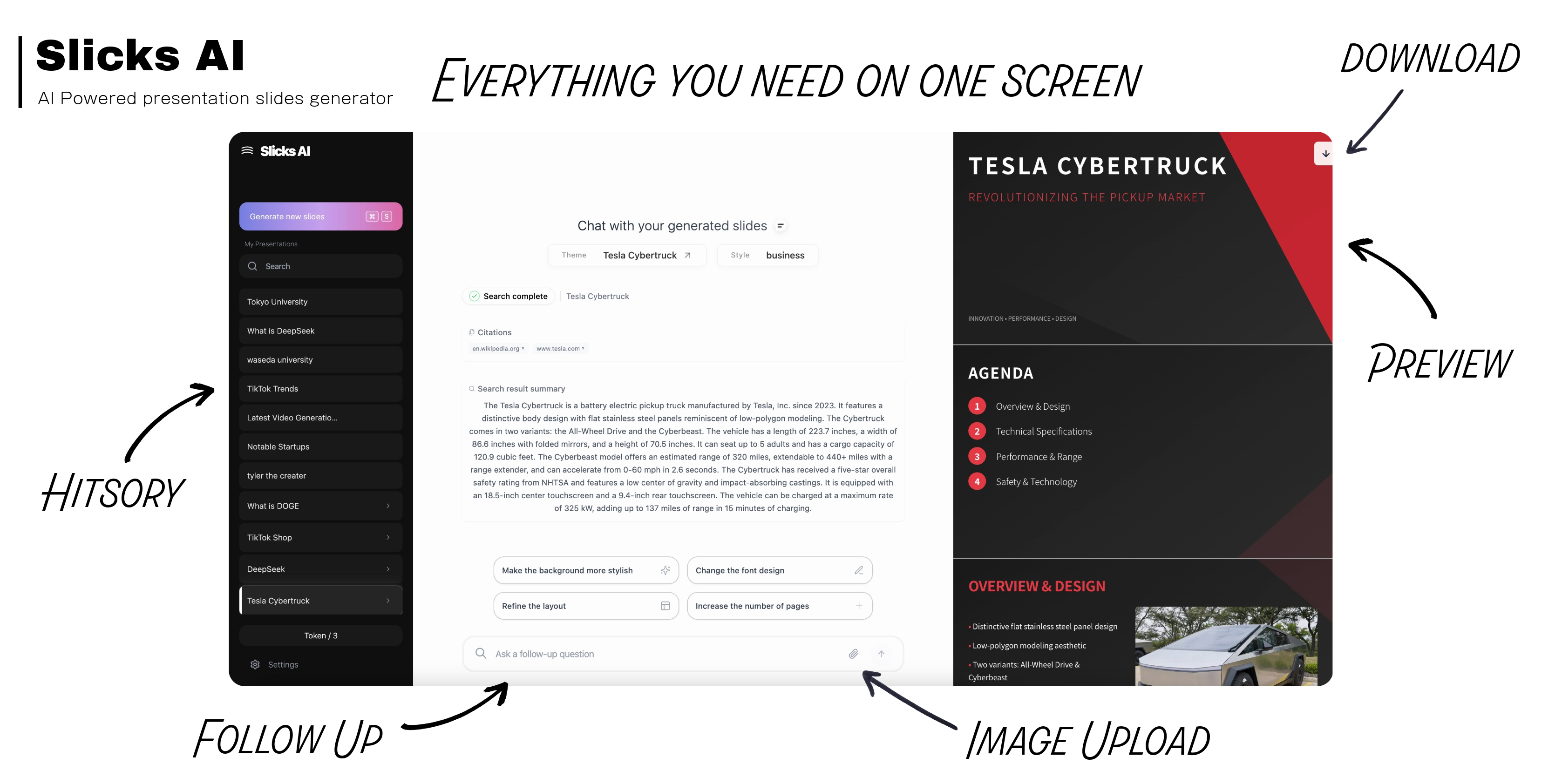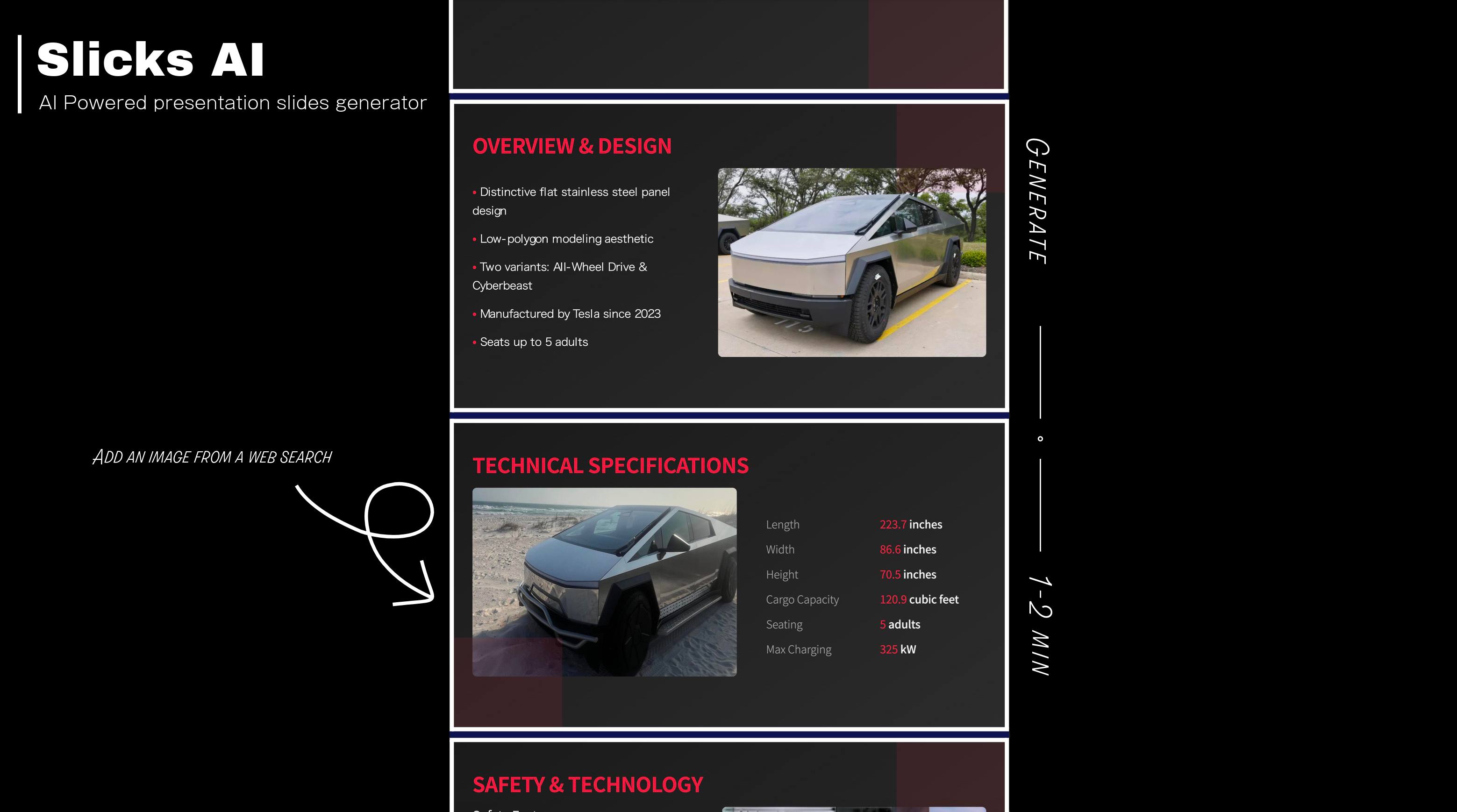 AIがユーザーの入力に基づいてプロフェッショナルなスライドを作成するプレゼンテーション生成ツールです。ウェブ検索されたコンテンツとAI生成テキストを組み合わせてスライドを自動生成します。