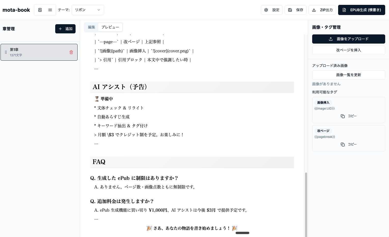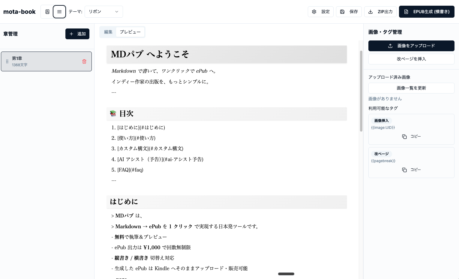 「書く」に集中し、ワンクリックで Kindle デビュー。 Markdown で執筆して ePub を瞬時に生成できる、インディー作家のための超シンプル出版ツールです。 --- 【なぜ生まれたか】 これまでの Kindle 出版は、使いづらい管理画面、レイアウトが崩れやすい PDF 変換、煩雑なファイルアップロードなど、「作業」に時間を奪われがちでした。 【かんたん電子出版所の価値】 * Markdown ベース: 見出しや画像もプレビューで即確認。 * ワンクリック ePub: 書き終えたら「ePub 生成」ボタンを押すだけで Kindle 用ファイルが完成。 * シンプル UX: 2 カラム(エディタ/プレビュー)。縦書き↔横書きもワンタップで切替え。 * 価格は明快: 執筆・プレビューは完全無料。ePub 出力は一度 1,000 円を支払えば無制限。 * ローカルファイル対応: ブラウザだけで完結し、クラウド登録も不要。 * AI アシスト(近日): 文体チェック、あらすじ生成、タグ付けなどを月額 \$3 のクレジット制で提供予定。 【こんな方におすすめ】 * Word や PDF 変換に限界を感じていたインディー作家 * Markdown で技術書・同人誌を管理しているエンジニア * 手軽に電子書籍を試してみたいブロガー・研究者 まずは無料で執筆をはじめてみませんか? かんたん電子出版所で、あなたの原稿を世界へ届けましょう。