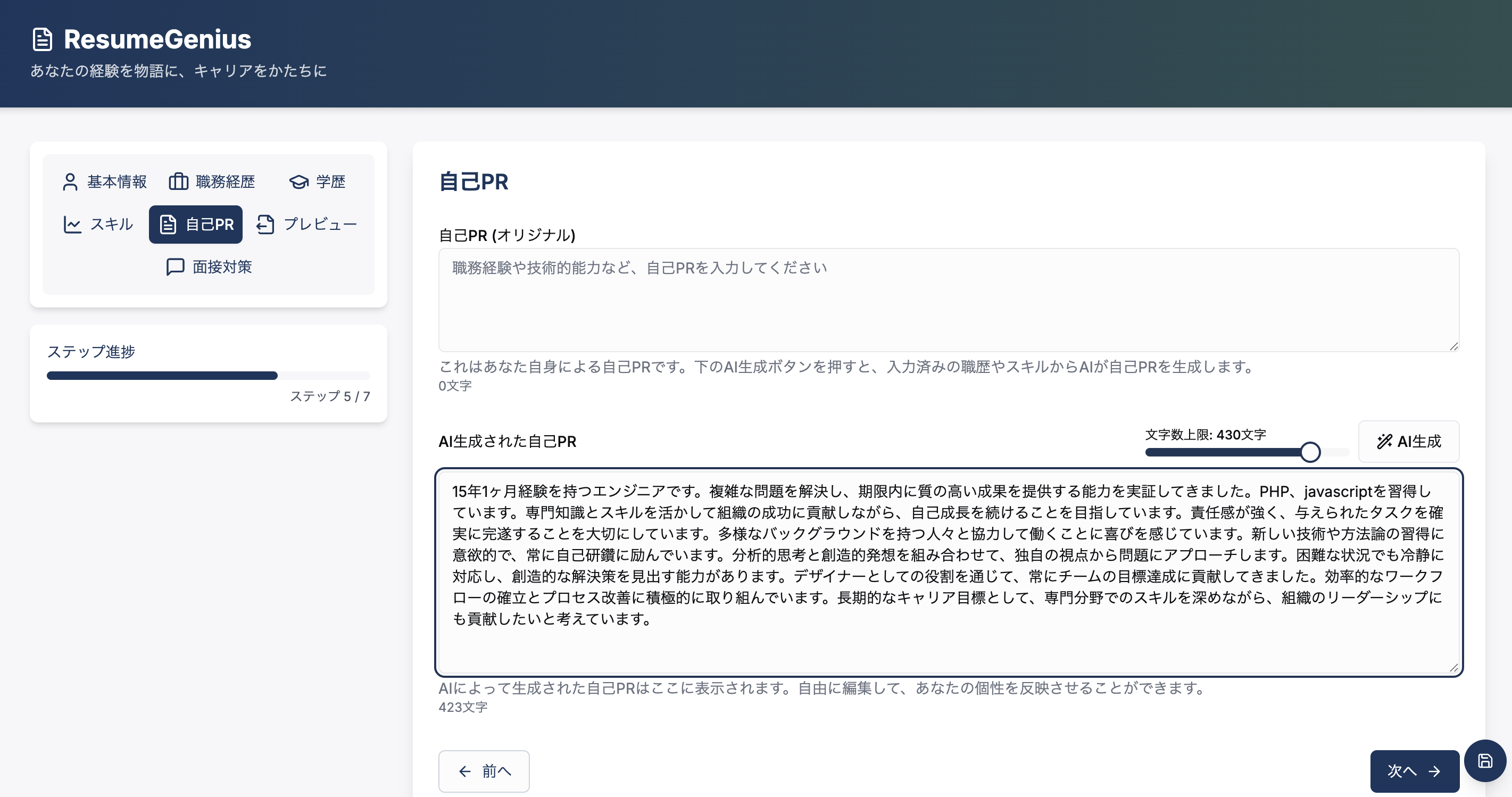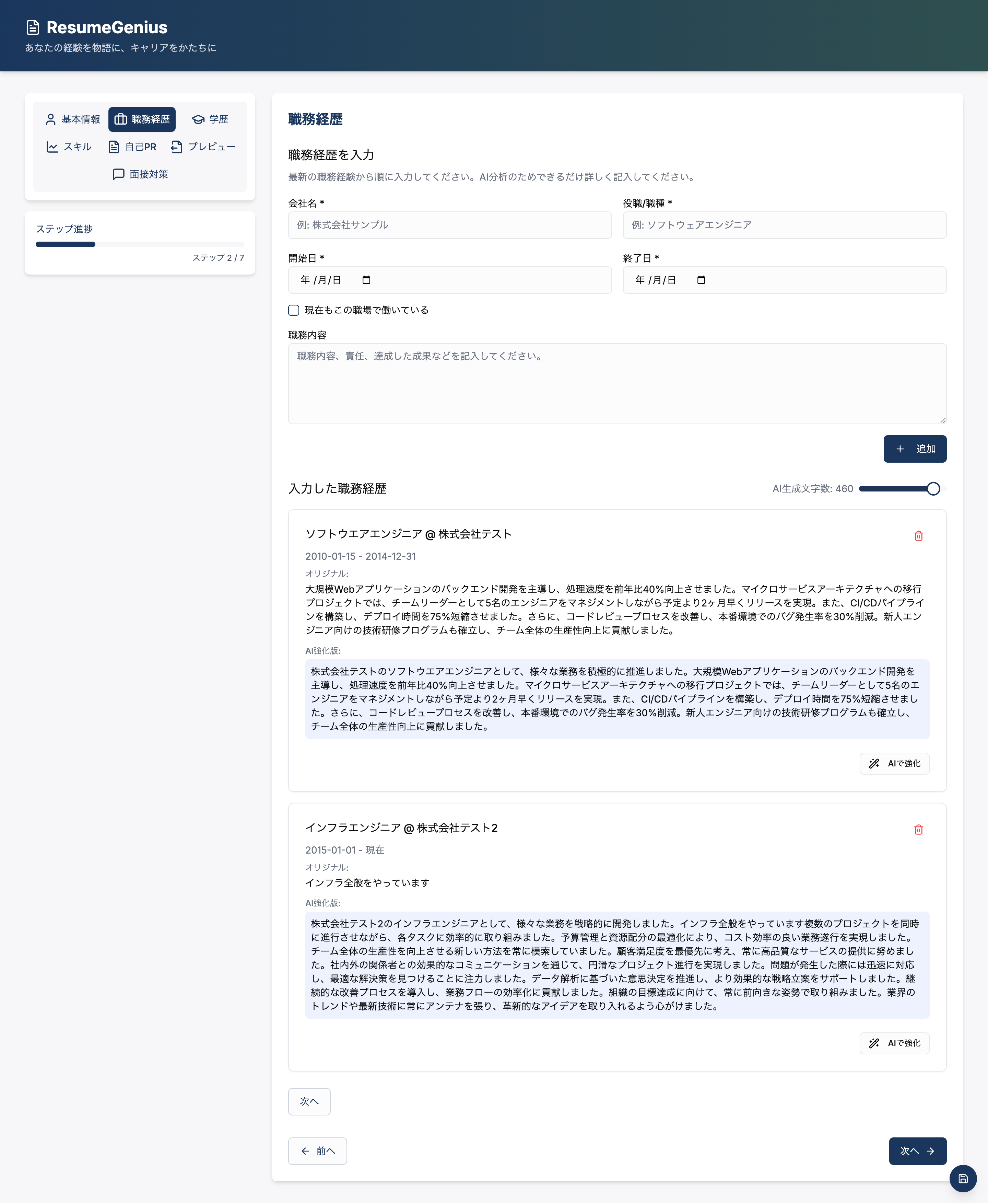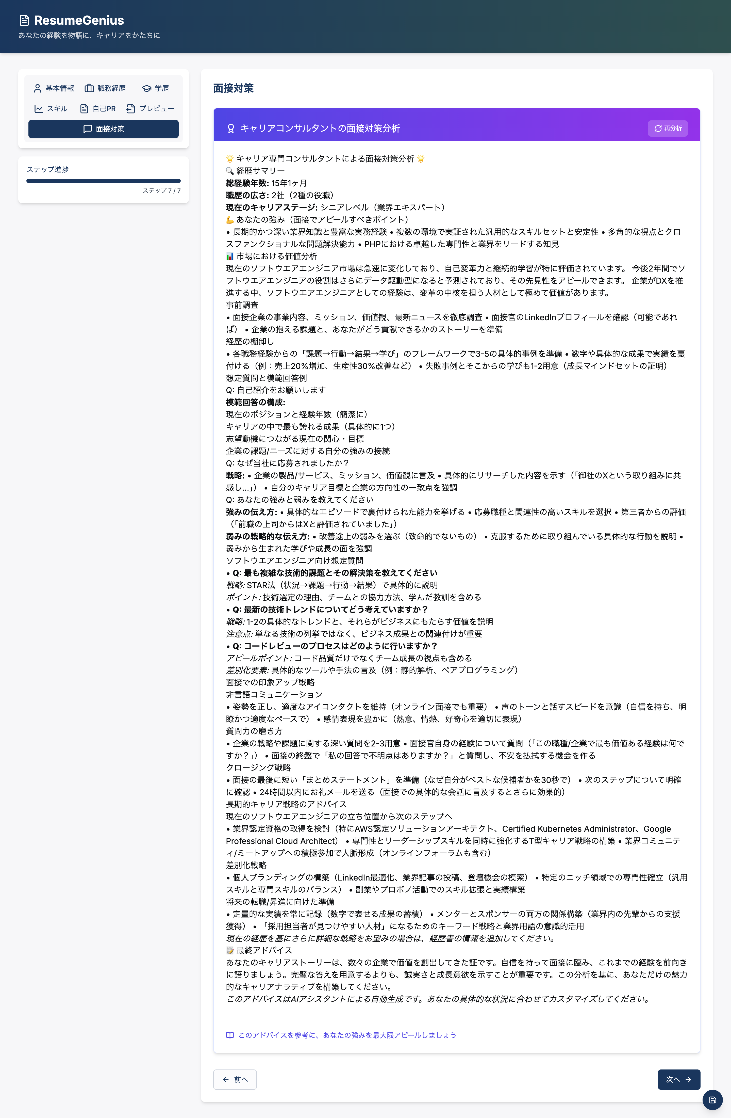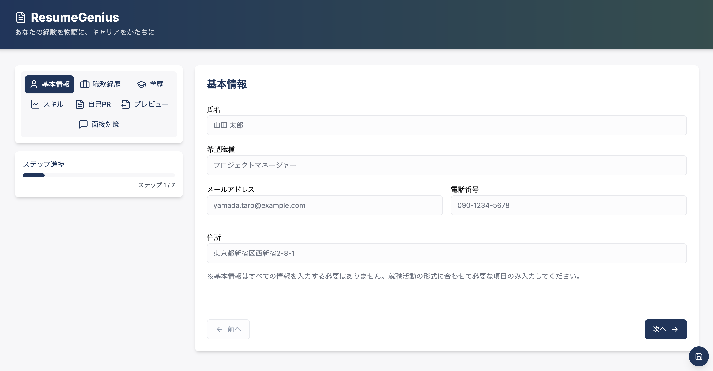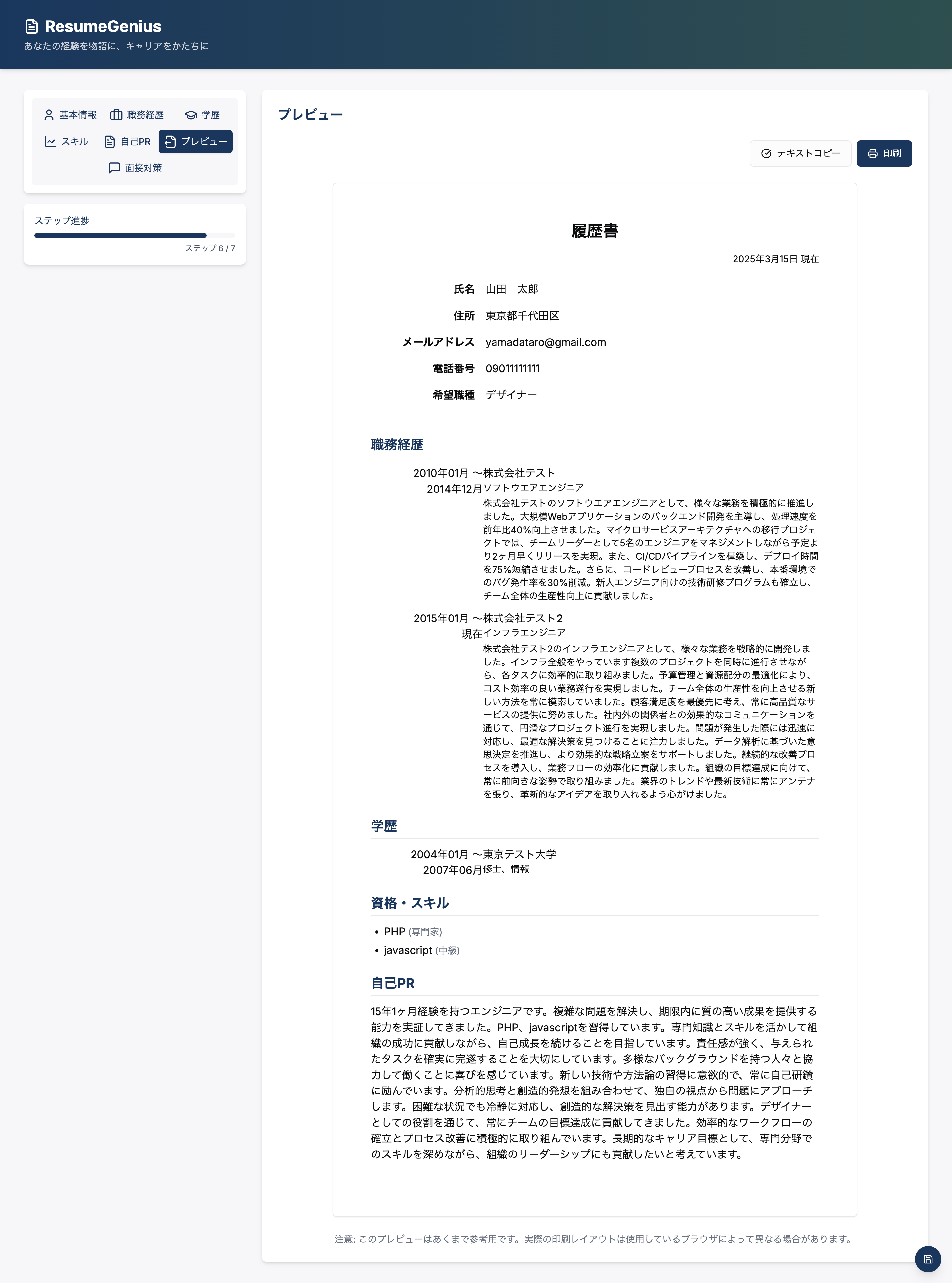 履歴書作成アシスタントアプリです。入力内容をもとに面接対策アドバイスまで提供します。