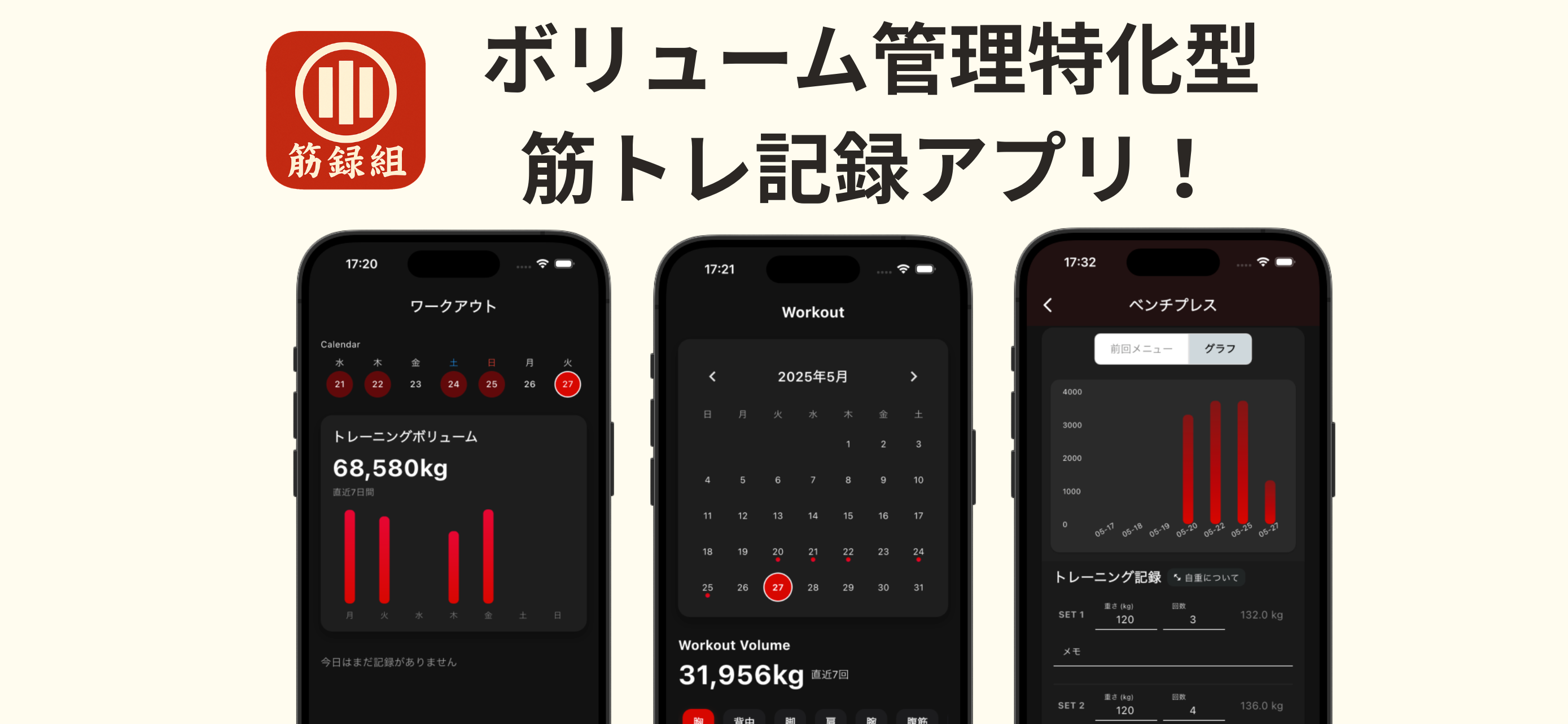 筋トレの「積み上げ」を見える化する、ボリューム管理特化型アプリ。 筋録組は、日々のトレーニング記録を「総挙上重量(ボリューム)」で管理できる筋トレ専用アプリです。 カレンダー形式での記録、グラフによる可視化、種目別の成長把握など、 成長を数字で捉えることで、やる気の継続と効率的なトレーニングをサポートします。 ■ 主な機能 ・トレーニングの総重量を自動で記録 ・カレンダーで毎日のトレーニング状況を確認 ・週ごとのボリューム推移をグラフ表示 ・部位・種目ごとの記録に対応 ・広告なし、完全無料 筋トレ初心者から上級者まで、「今日の自分を超える」ための相棒アプリです。