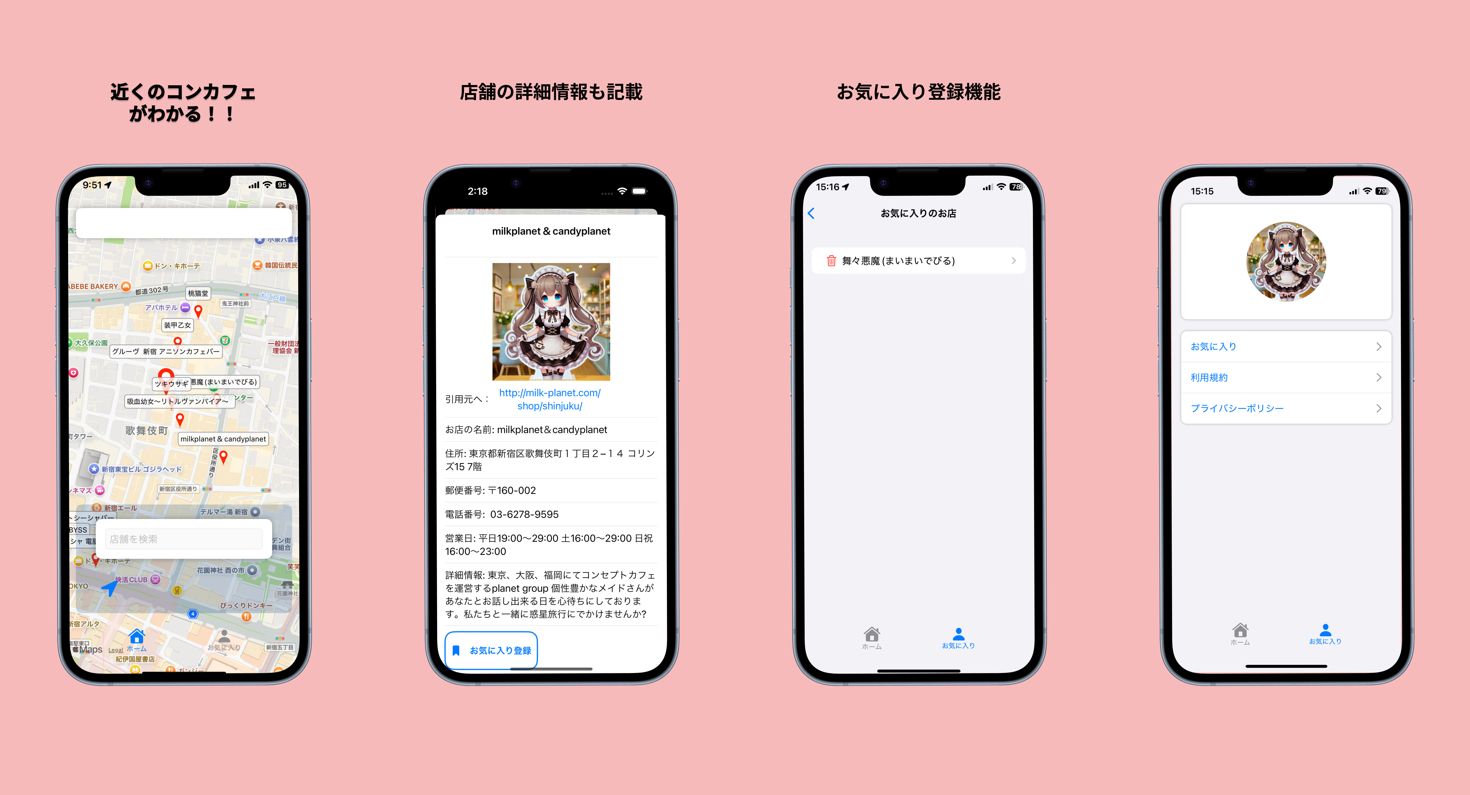「コンカフェポケット」は、地図を使って全国のコンセプトカフェ(コンカフェ)の場所を簡単に検索できるアプリです。現在地周辺のお店を素早く見つけるだけでなく、気になるお店をお気に入りに登録して、後でスムーズに訪れることも可能。初めての方から常連さんまで、誰でも簡単に使えるシンプルなデザインで、コンカフェ巡りがもっと楽しく、便利になります。 アプリには以下の特徴があります: マップ検索機能: 現在地や指定エリアのコンカフェを地図上に表示。 詳細情報の閲覧: お店の名前、営業時間、住所などを簡単に確認。 お気に入り登録: 行きたいお店を保存していつでもチェック可能。 レビュー機能(予定): 他のユーザーからの評価やコメントを参考に、お店選びがさらに充実(今後アップデート予定)。
