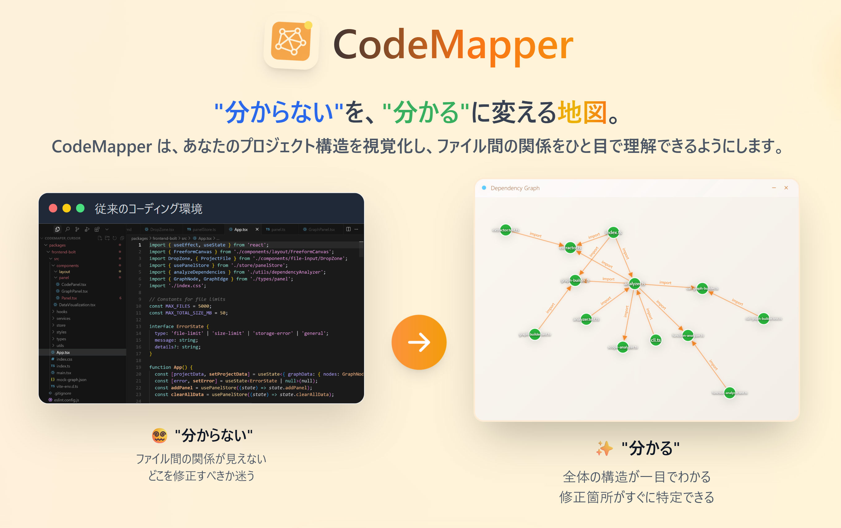 AI駆動開発に取り組む非エンジニアにとって、AIが生成したコードの理解と管理は大きな挑戦です💡 Codemaperは、この課題を解決する革新的なツールです。 本プラットフォームは、コードを視覚的にマッピングし、複雑な構造を直感的に理解できる環境を提供します🗺️ AI駆動で作成したコードの全体像や関係性を瞬時に把握でき、「AIが何を作ったのか」を明確に理解できます。 AI駆動開発では短時間で大量のコードが生成されるため、非エンジニアは往々にして「動くけど仕組みが分からない」状態に陥ります✨ Codemaperを使用することで、AIが生成したコードから学習し、自身のコードの理解力を上げることが可能です。 コード理解の壁を取り除き、AI駆動開発の真の価値を体験できる強力なパートナーです🎯